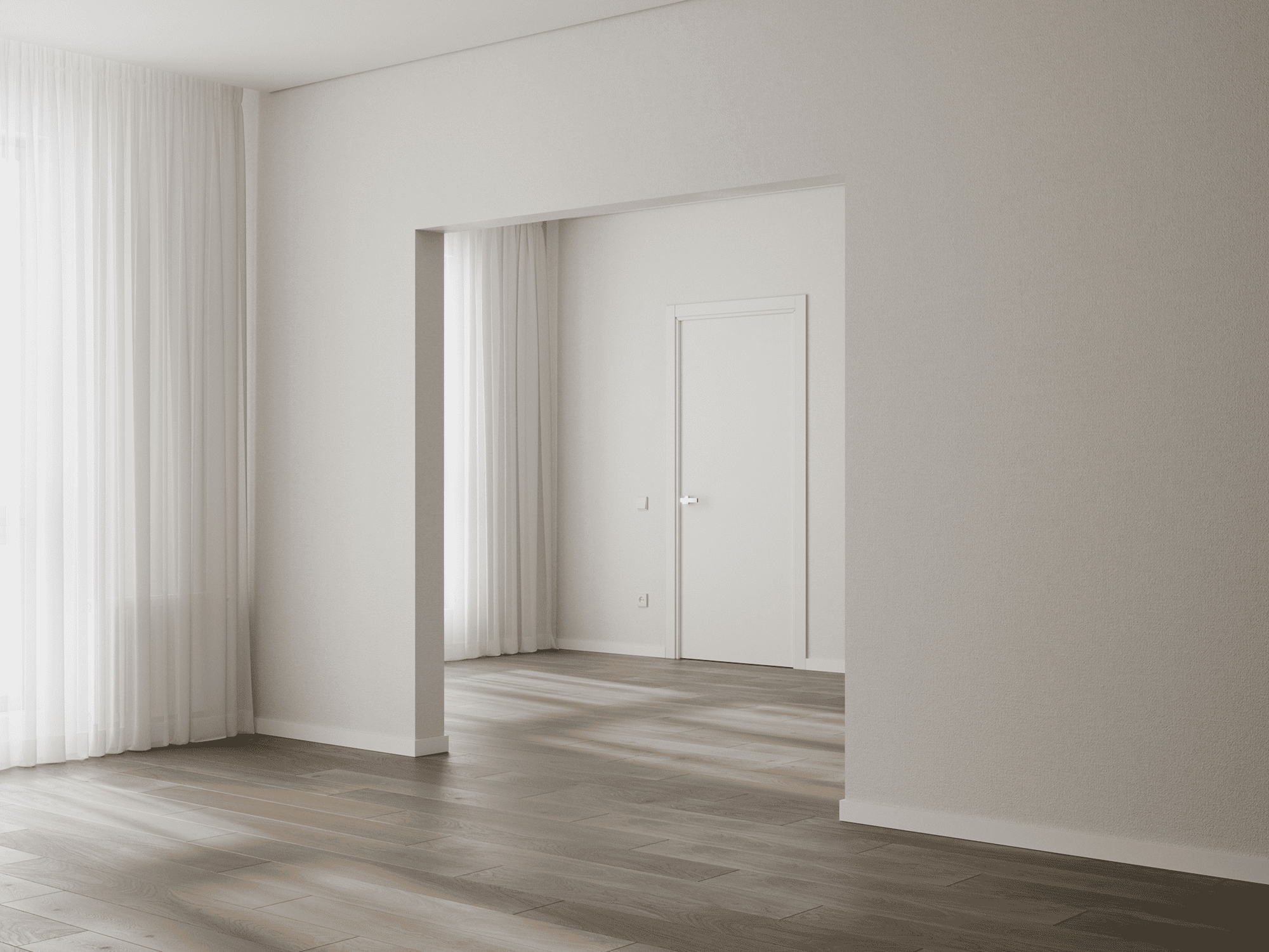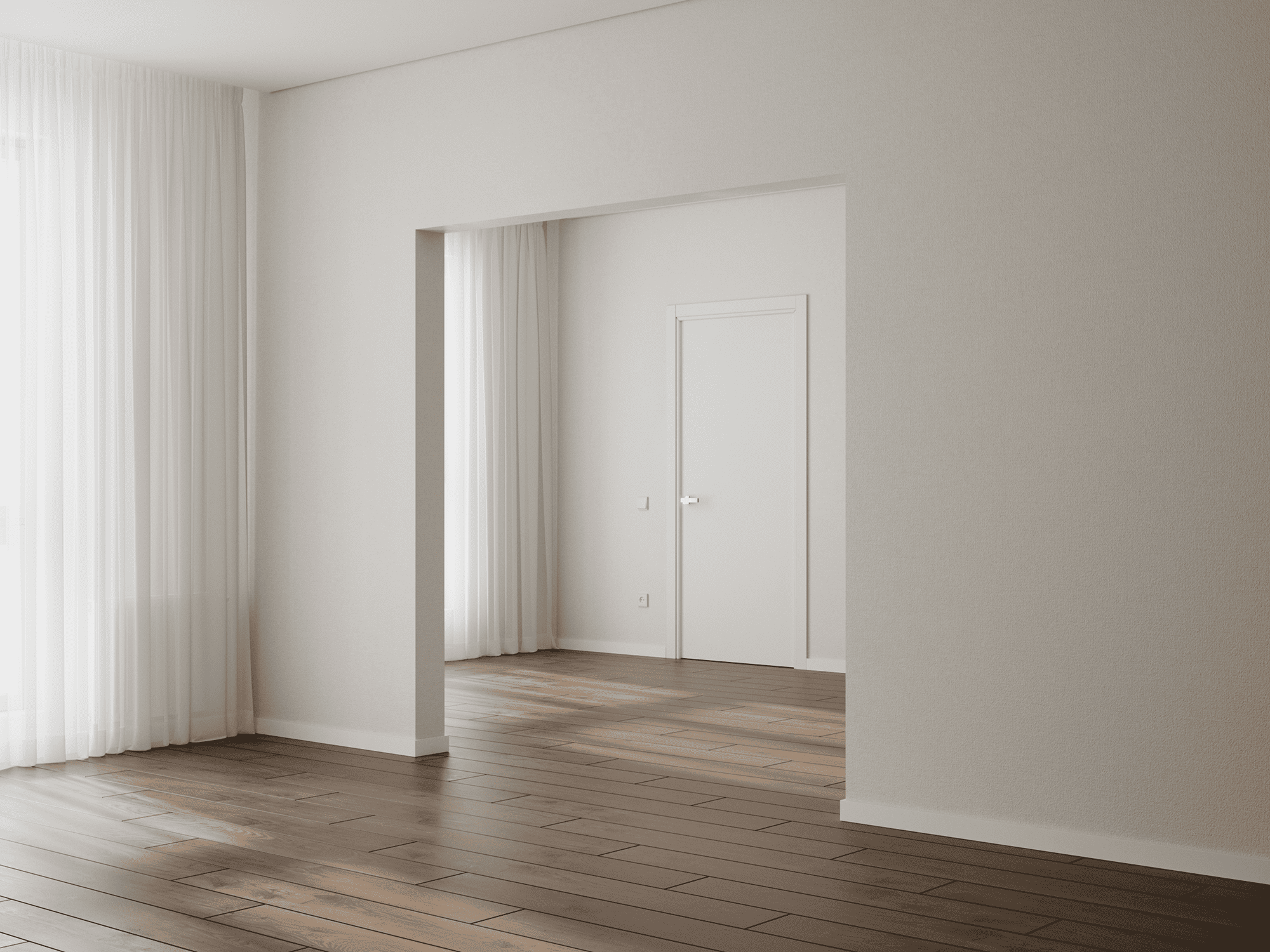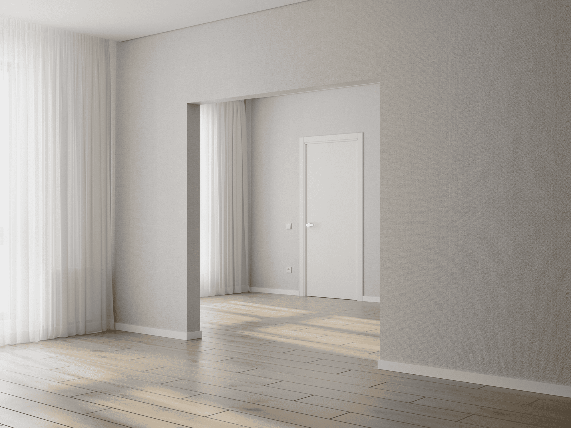 Стены выравниваются и оклеиваются обоями (3 цвета на выбор), пол – ламинат с фаской (3 цвета на выбор), двери белые, без филёнок с наличниками, потолок – натяжной, с установкой ниши для штор.