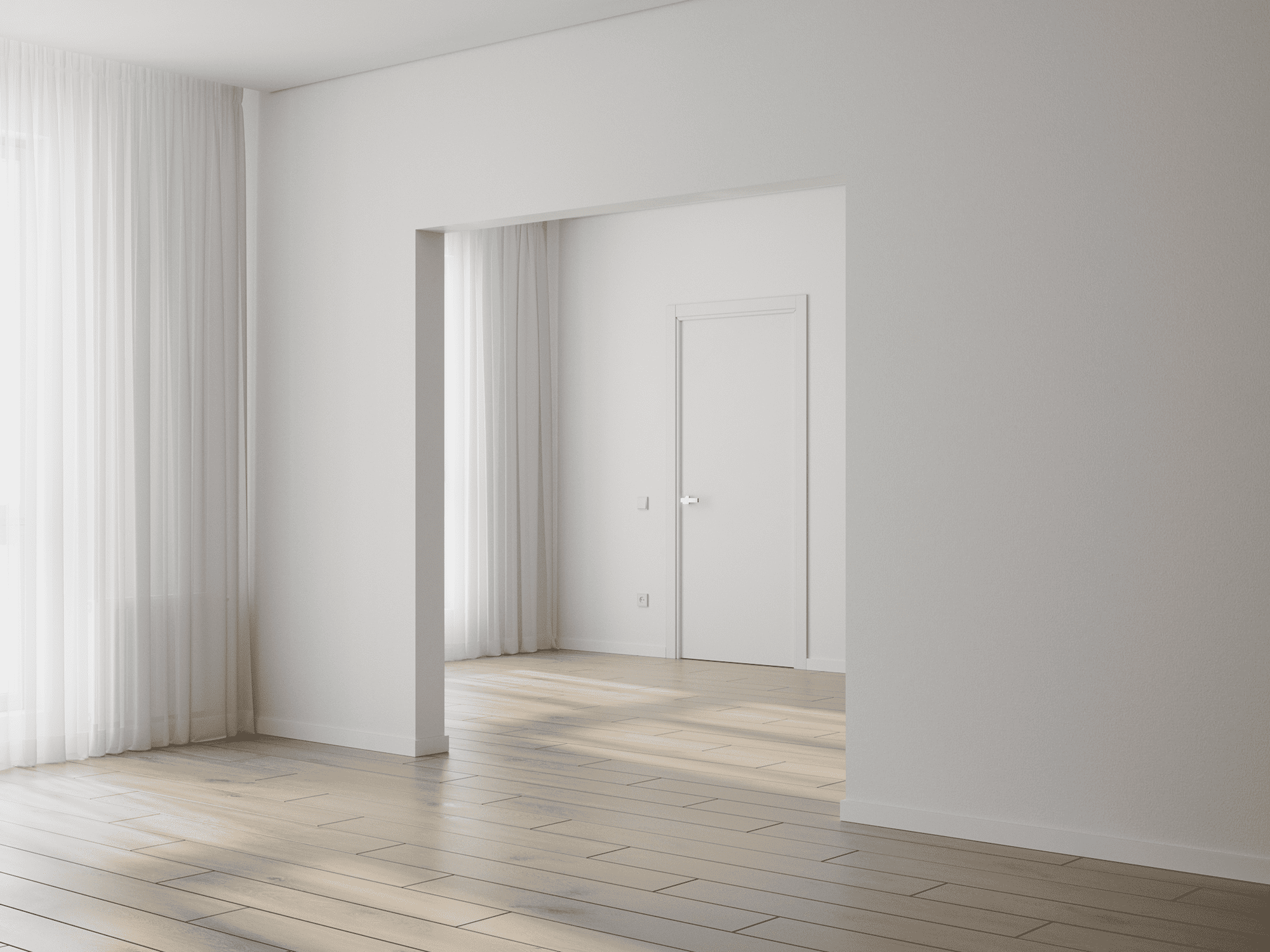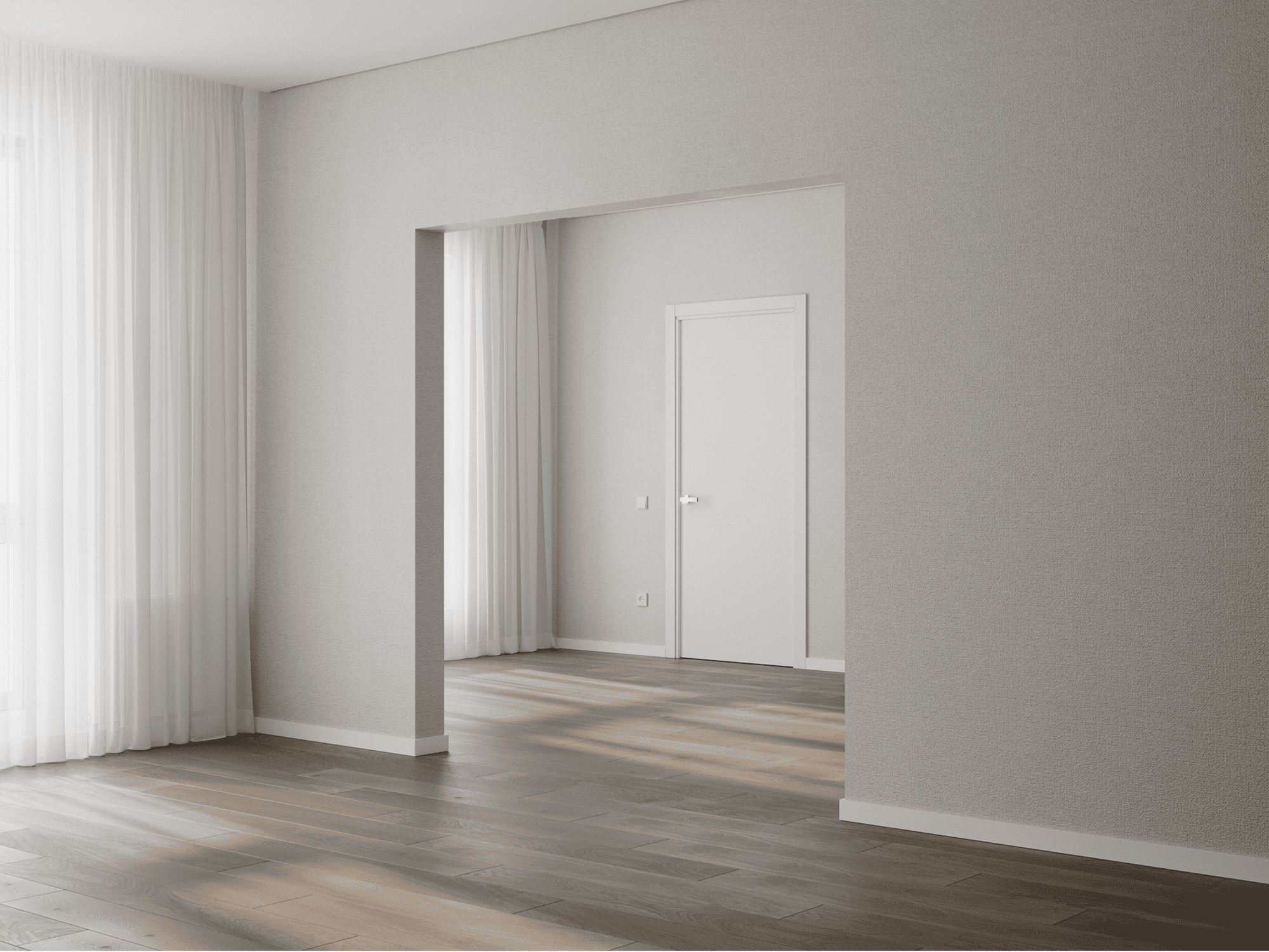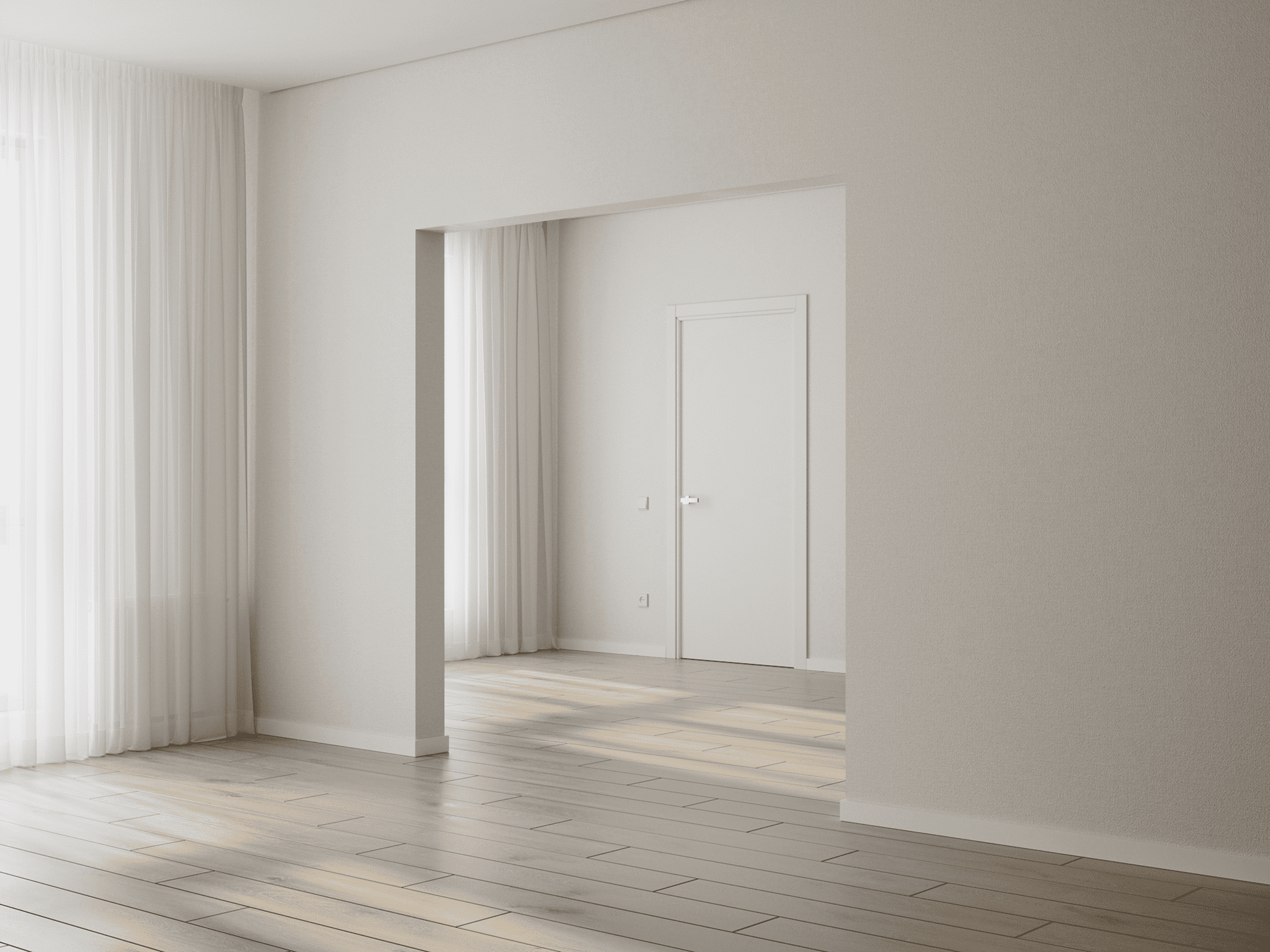 Стены выравниваются и оклеиваются обоями (3 цвета на выбор), пол – ламинат с фаской (3 цвета на выбор), двери белые, без филёнок с наличниками, потолок – натяжной, с установкой ниши для штор.
