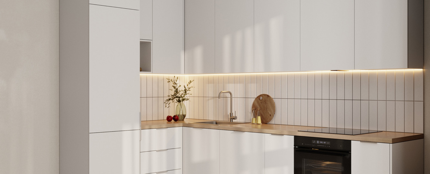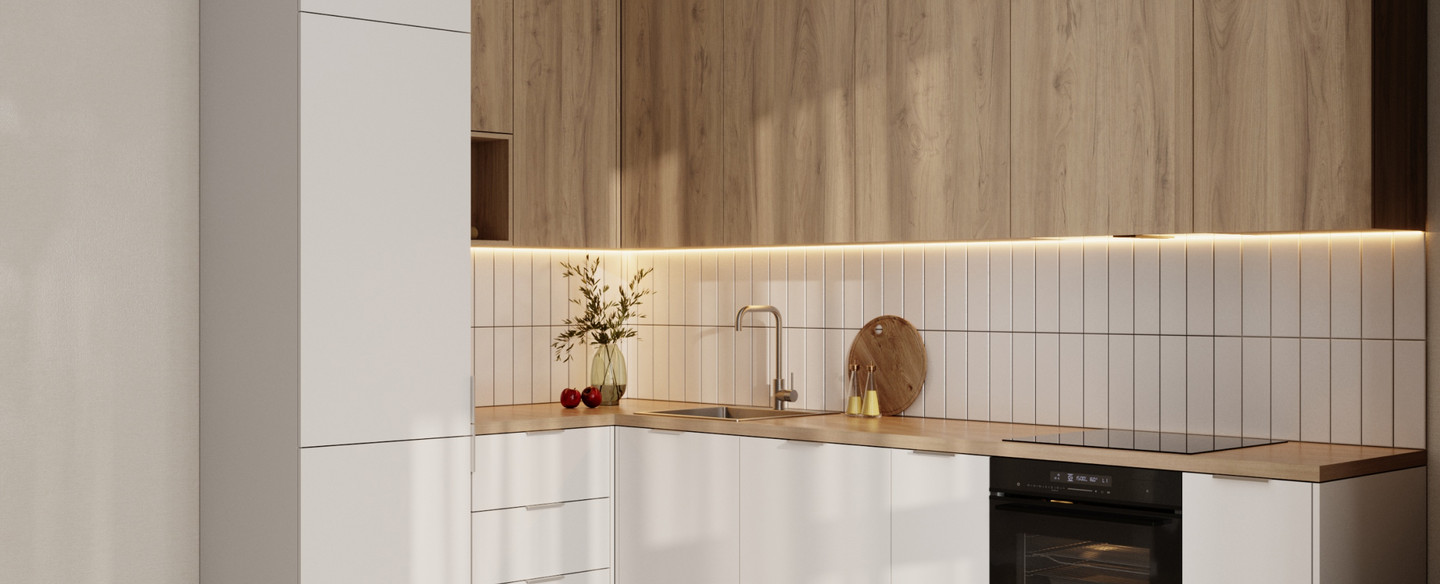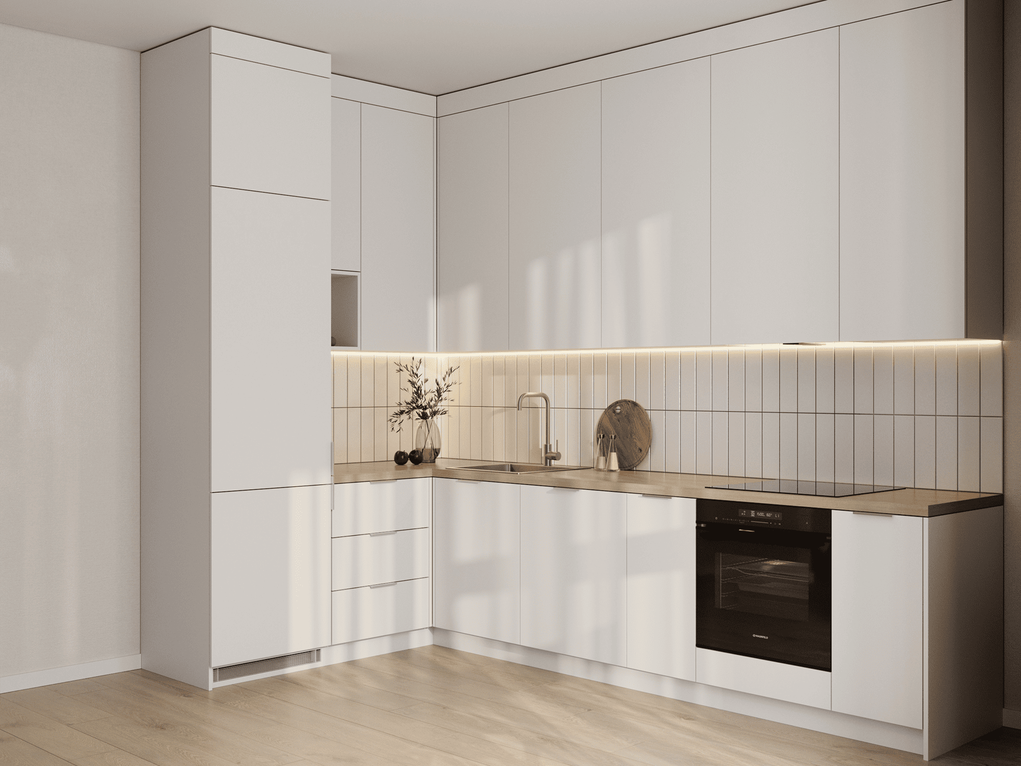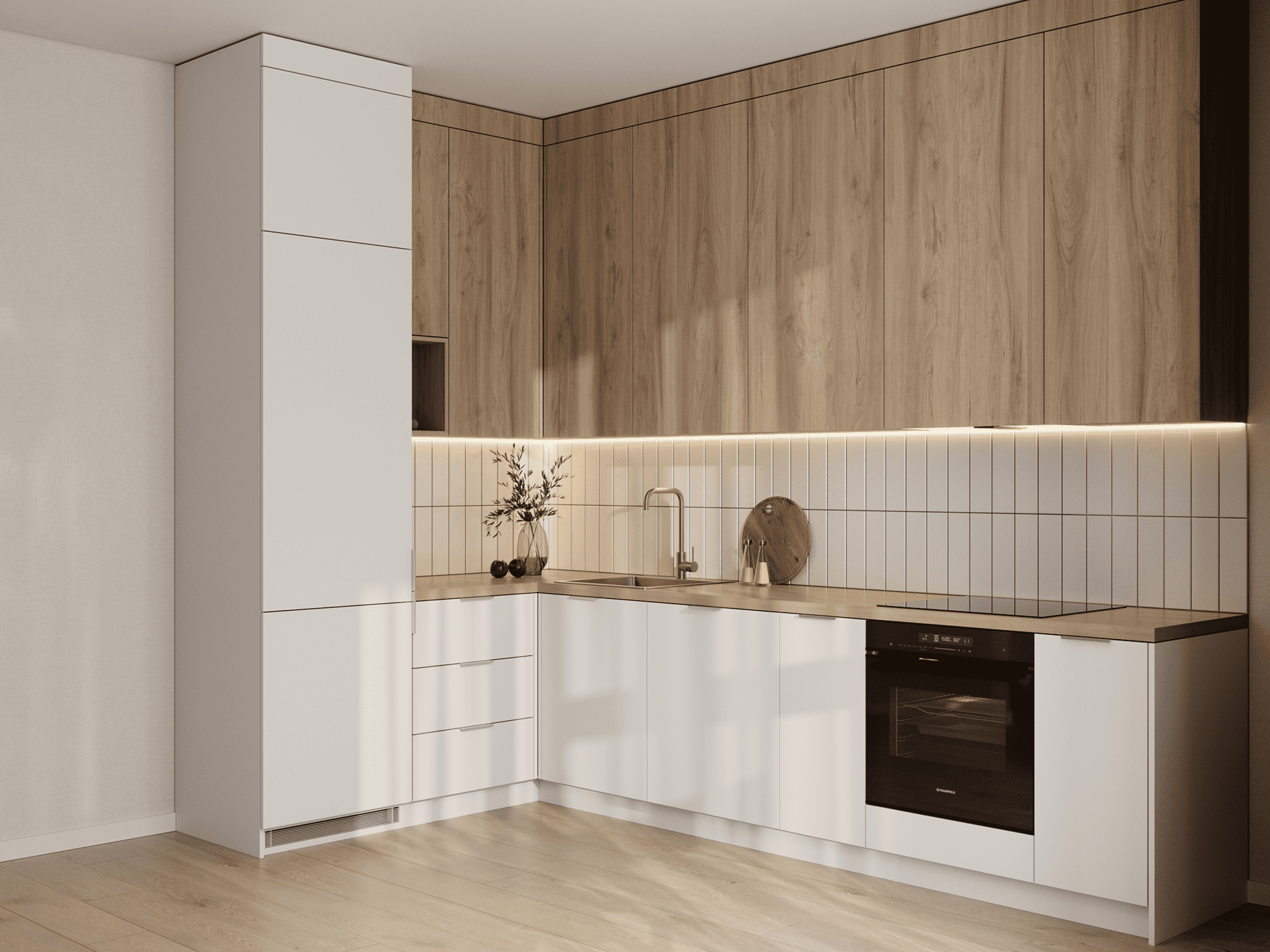 дерево. Столешница – под дерево, скиналь – плитка, белая. Мойка и смеситель, встроенные холодильник, посудомоечная машина и вытяжка. Духовой шкаф и варочная панель.