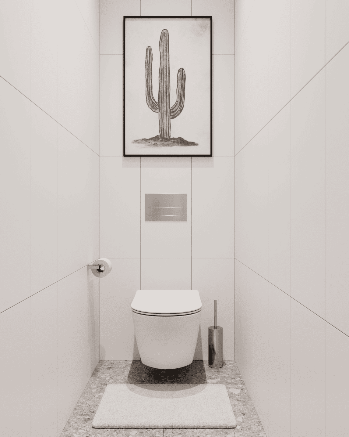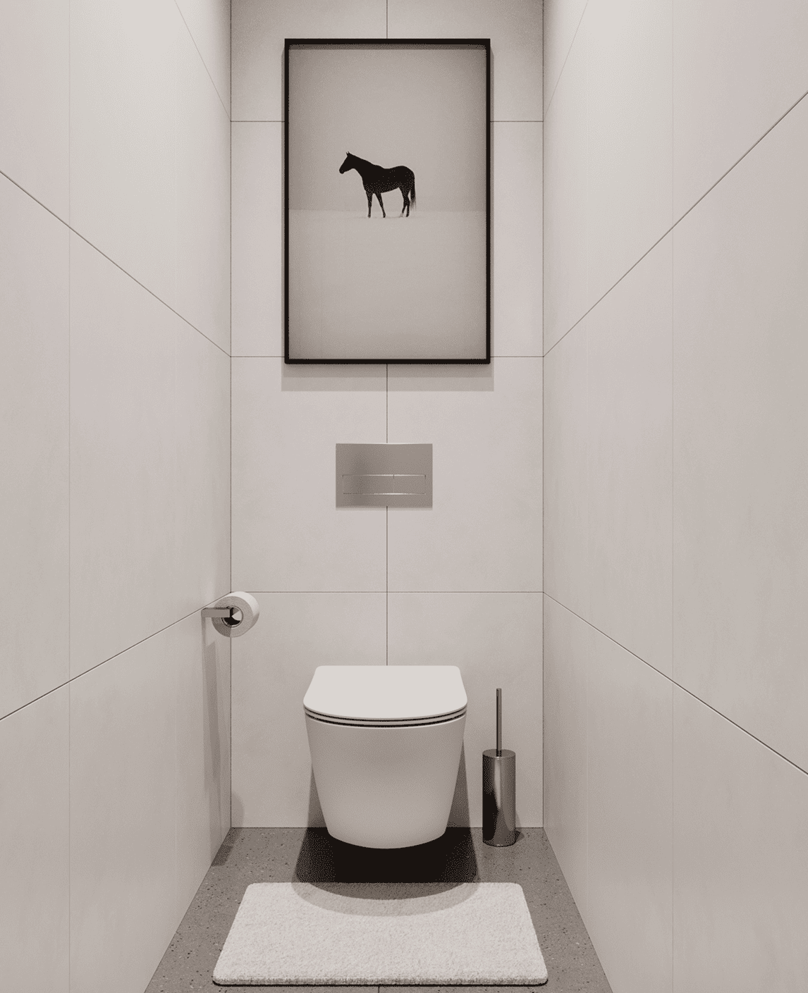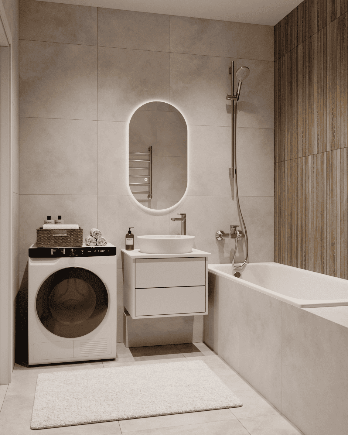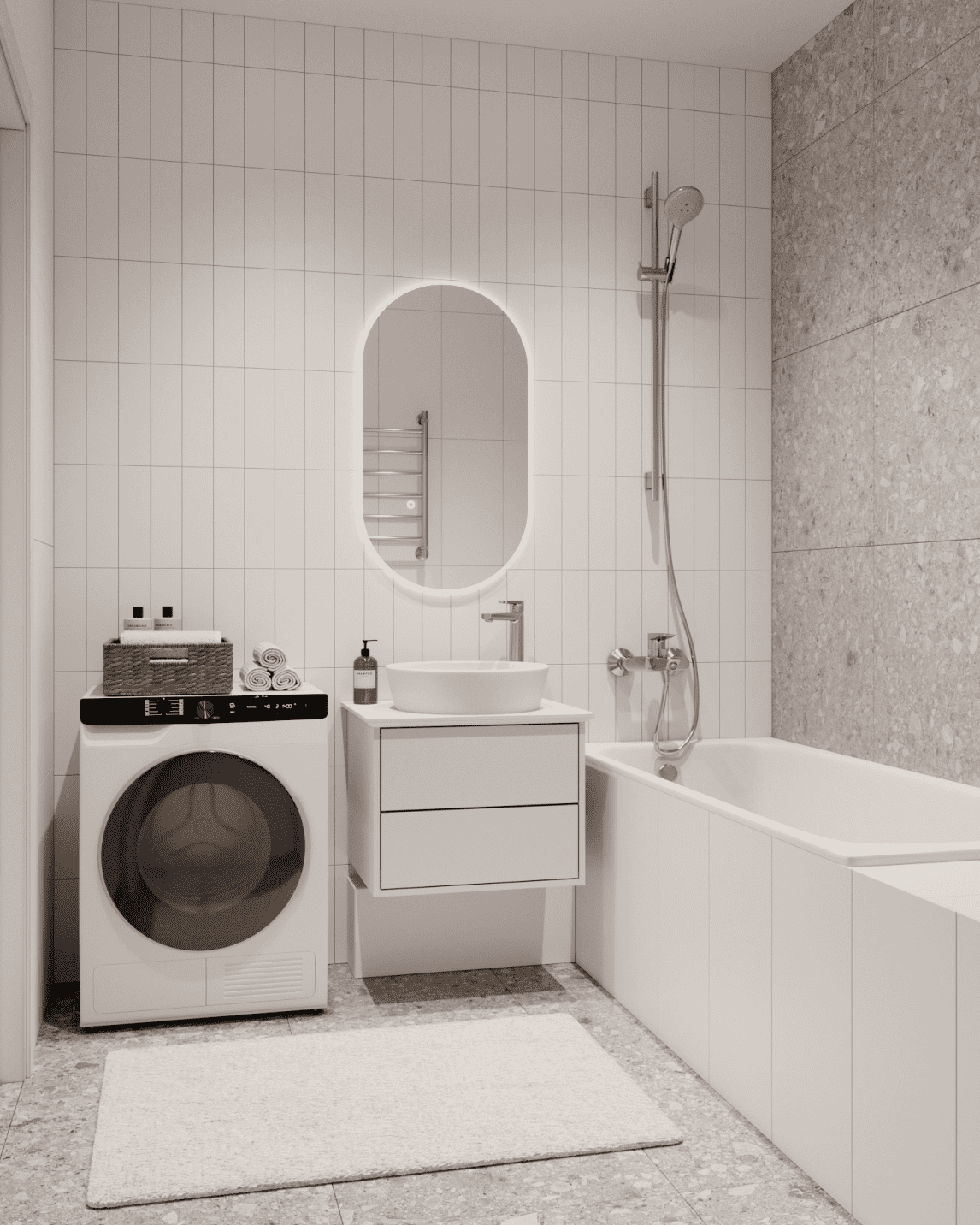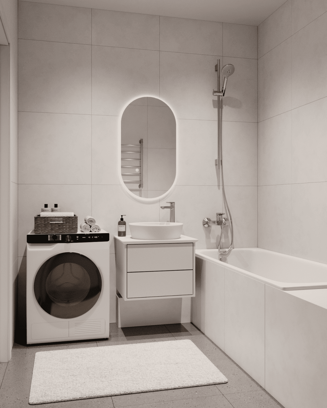Пол и стены – керамогранит (3 цвета на выбор), ванна из стали, унитаз подвесной с инсталляцией, полотенцесушитель, подвесная тумба с накладным умывальником, зеркало с подсветкой