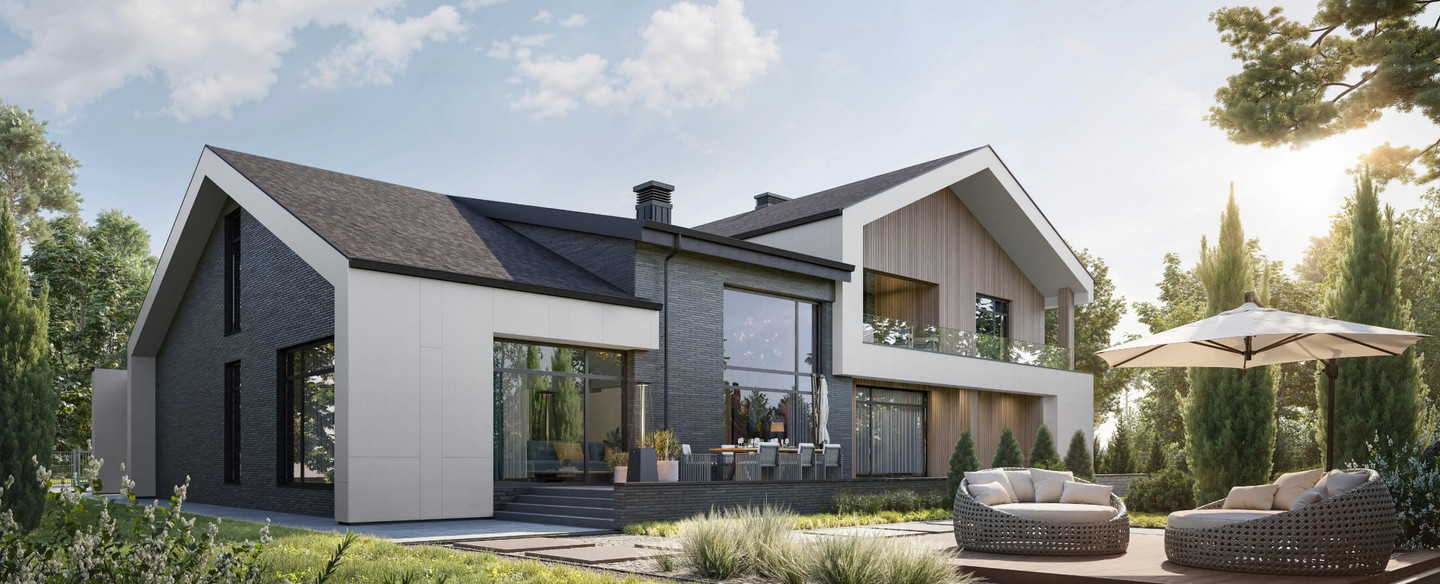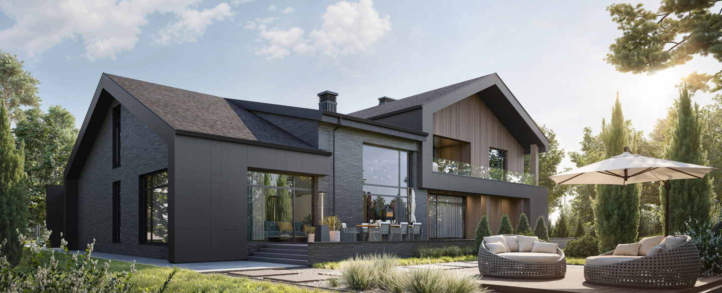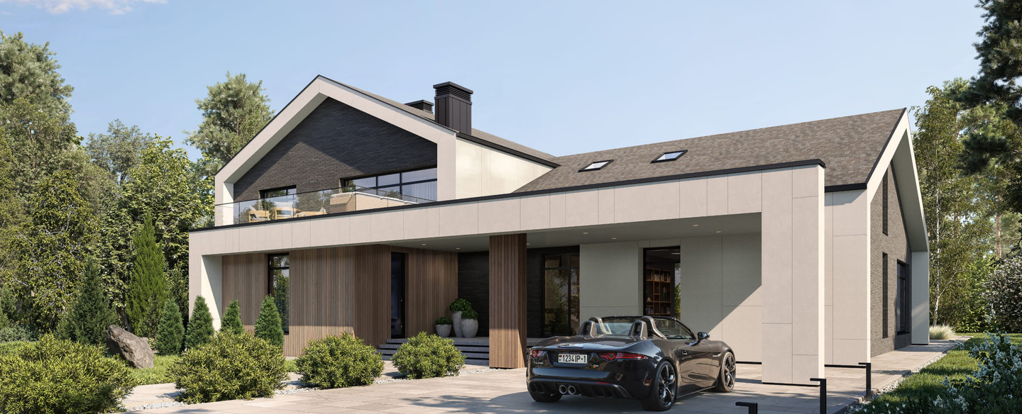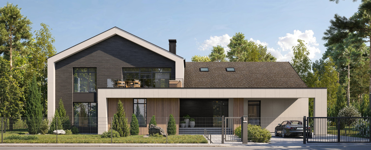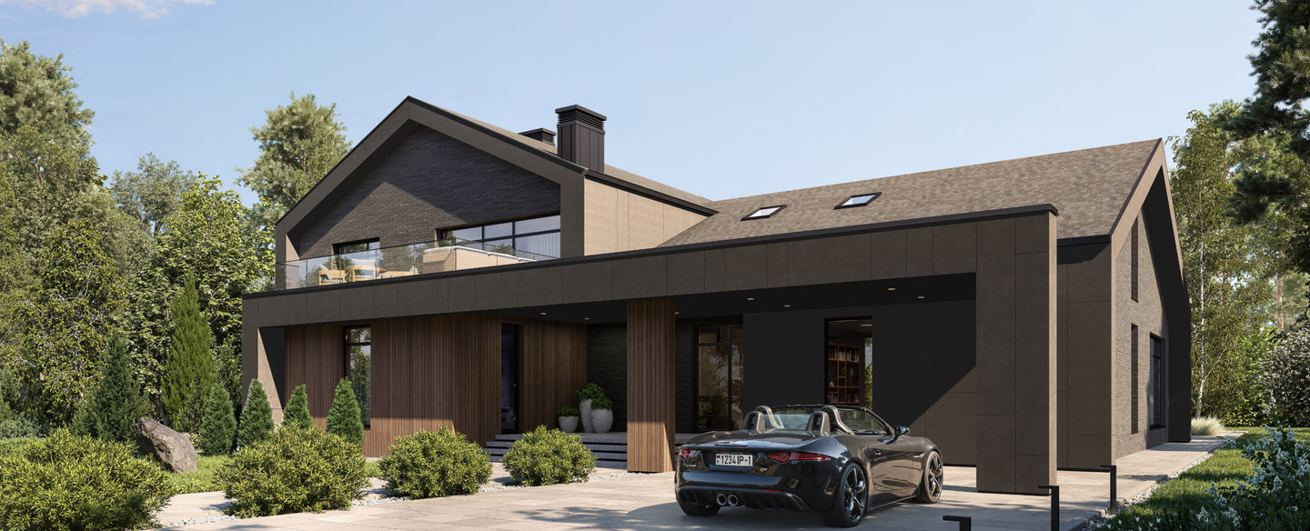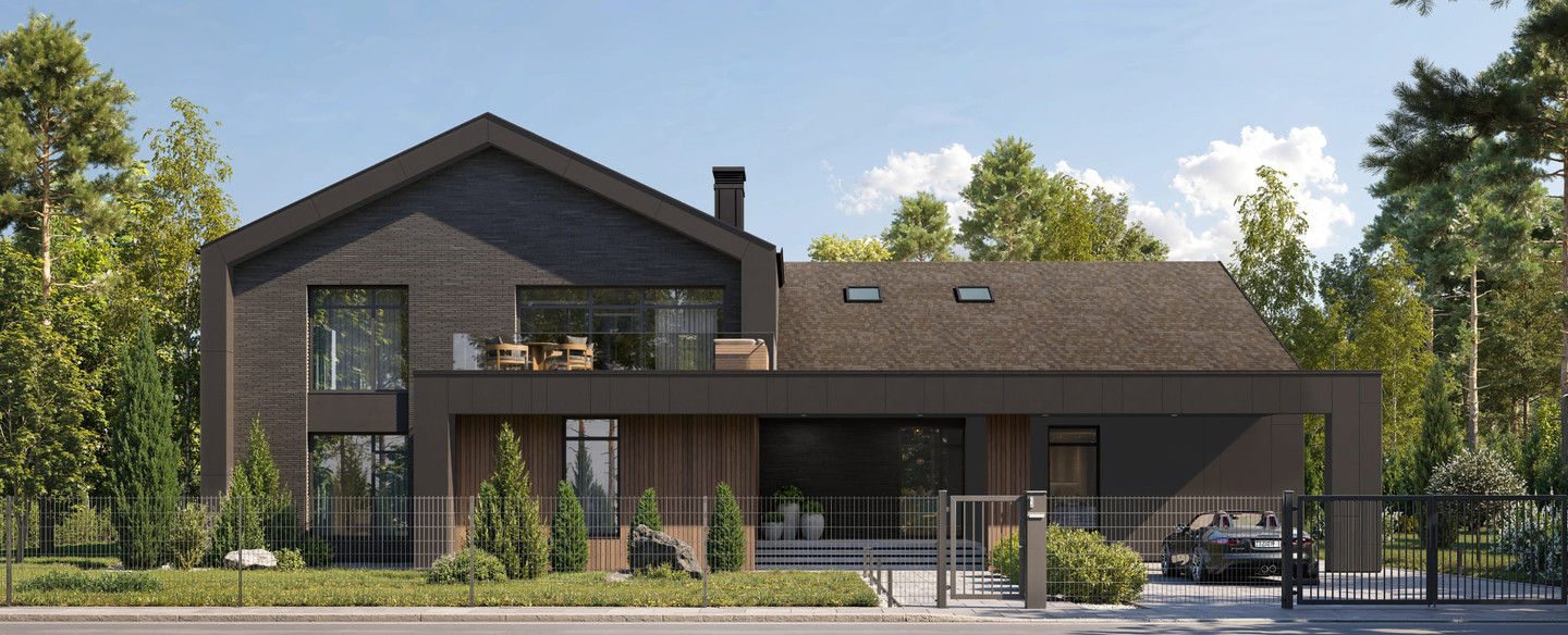 • В отделке фасадов используются декоративные штукатурки, плитка под кирпич, керамогранит, алюминиевые панели и стальные кассеты.