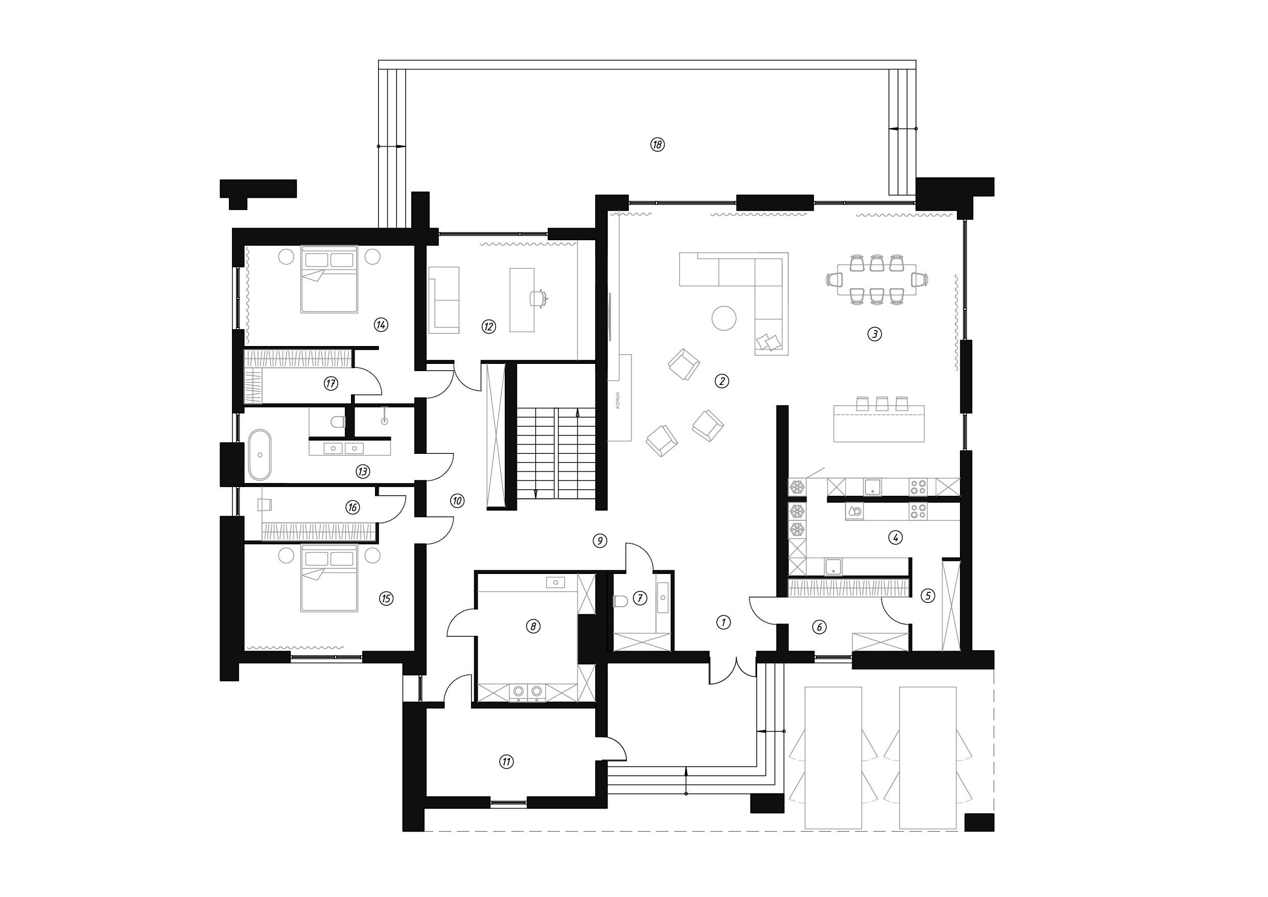 • Просторная планировка с помещением под кинотеатр, личный кабинет, игровую, библиотеку, спортзал, черновую кухню, постирочную и др.