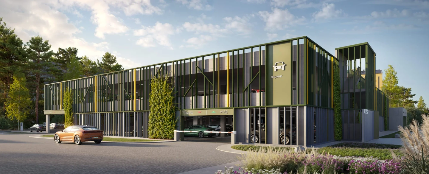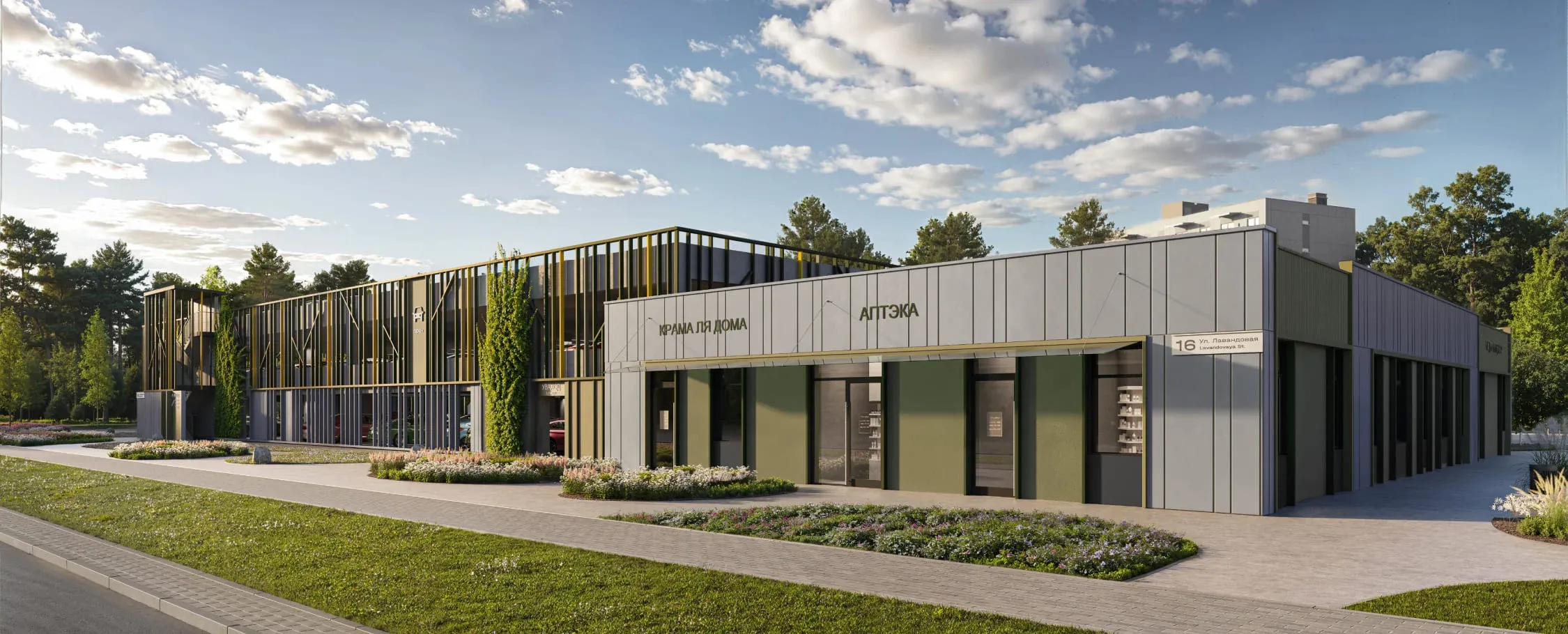 В пристроенной части паркинга есть коммерческие помещения, там будут мед. центр, диагностическая лаборатория, аптека. Вблизи коммерческих помещений паркинга 7.7 предусмотрена общественная зона, предназначенная для отдыха жителей и проведения общественных мероприятий