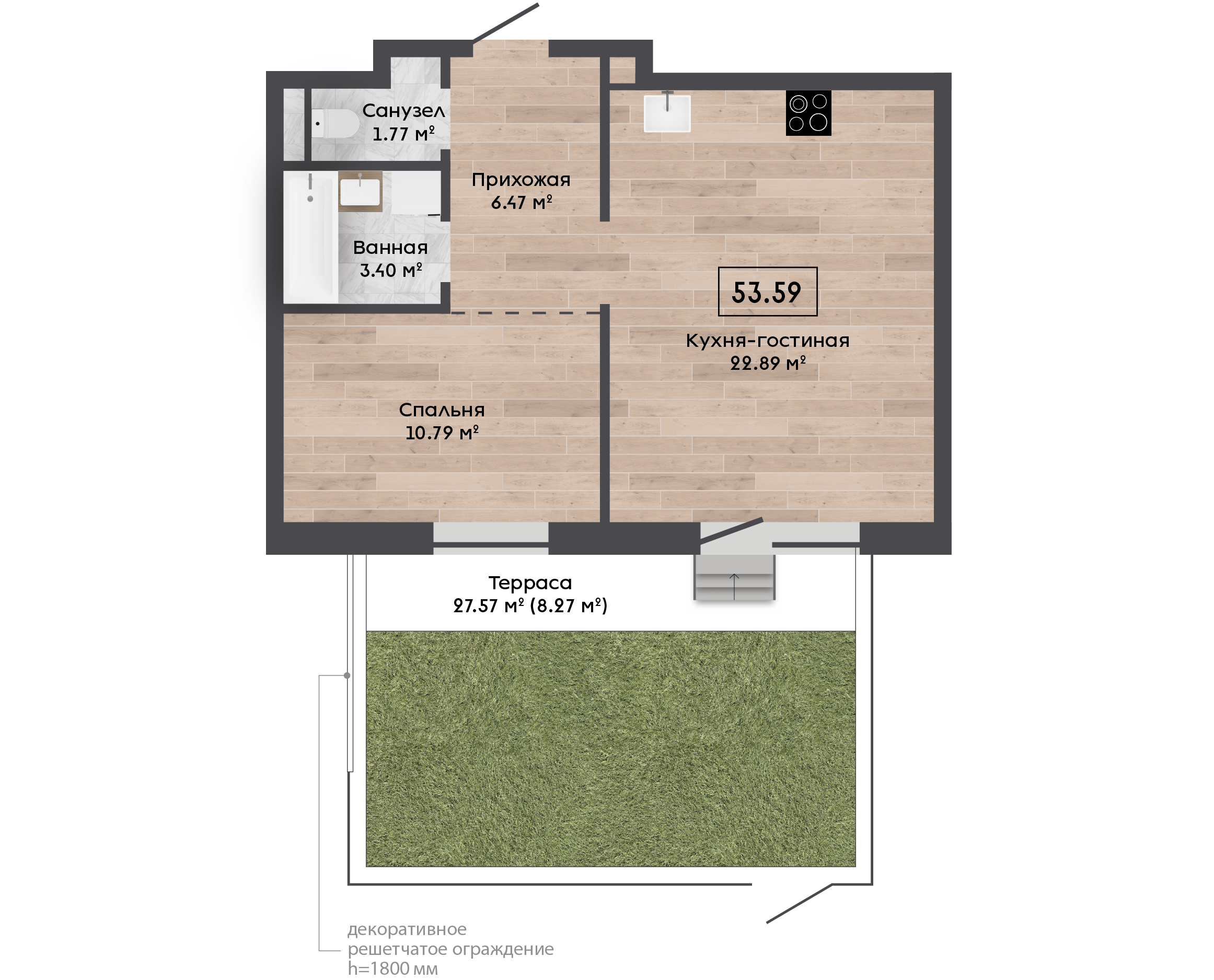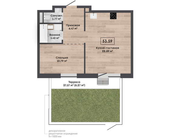 | 53,59 м² Площадь квартиры | 2,72 м Высота потолков | 27,57 м² Площадь участка |