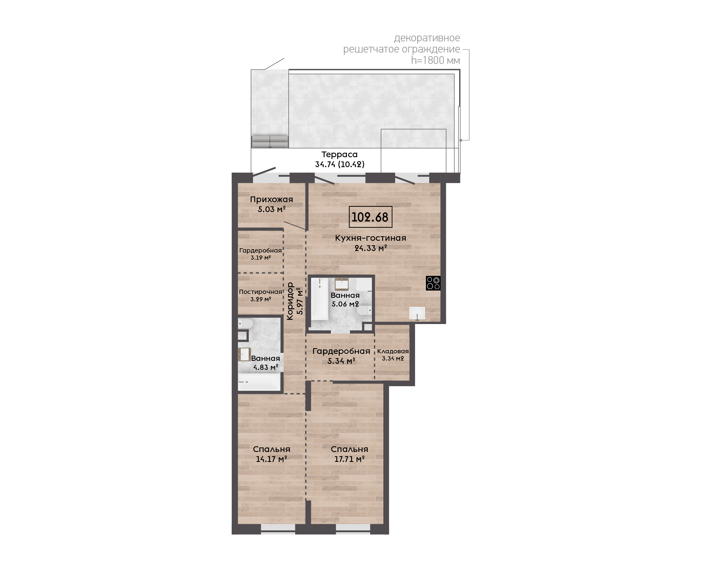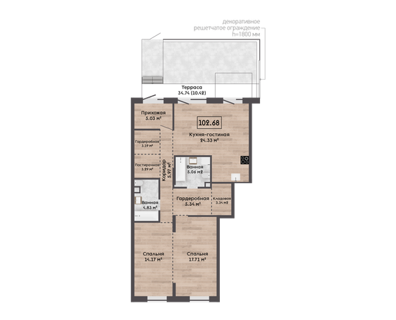 | 102,68 м² Площадь квартиры | 2,72 м Высота потолков | 34,74 м² Площадь участка |