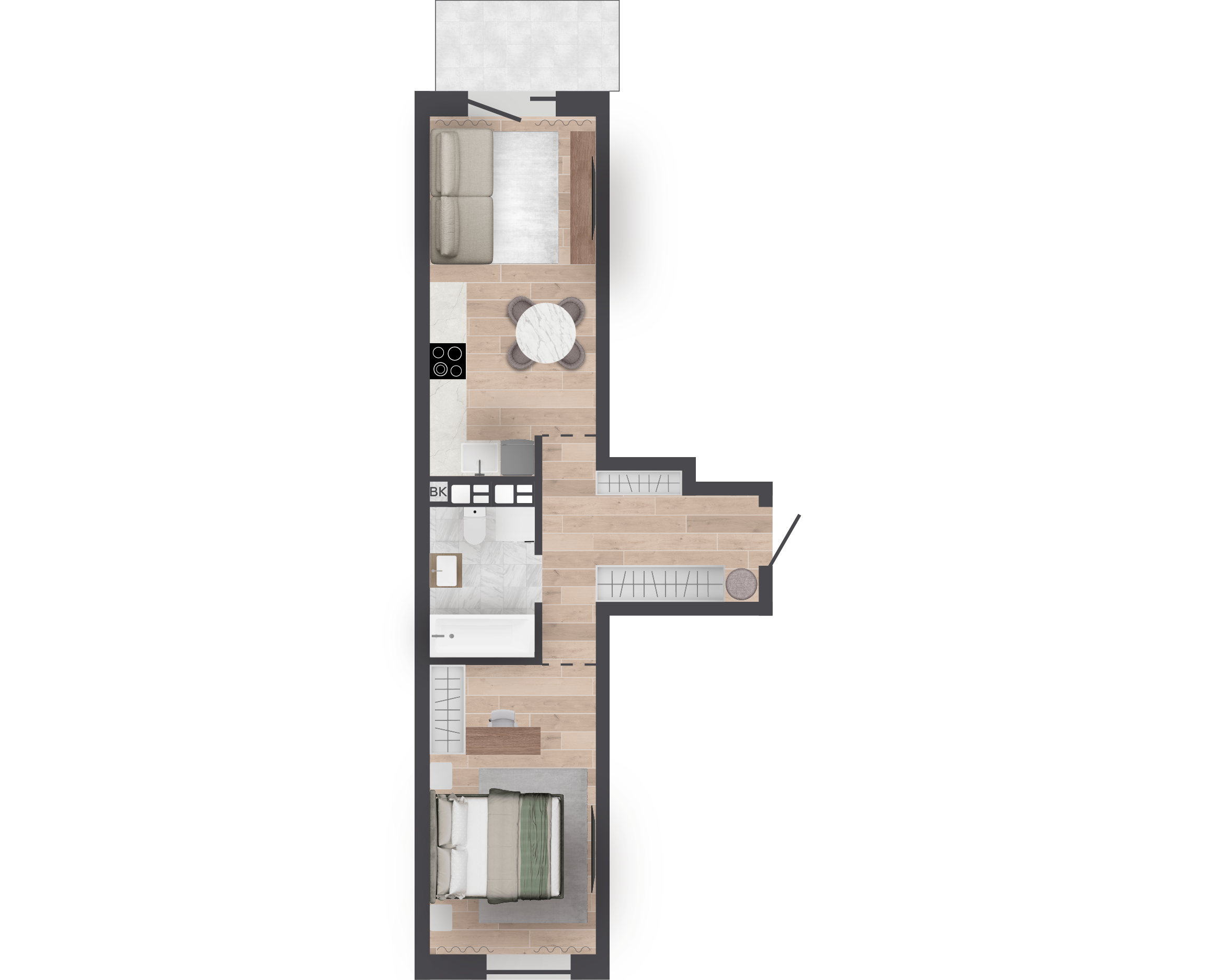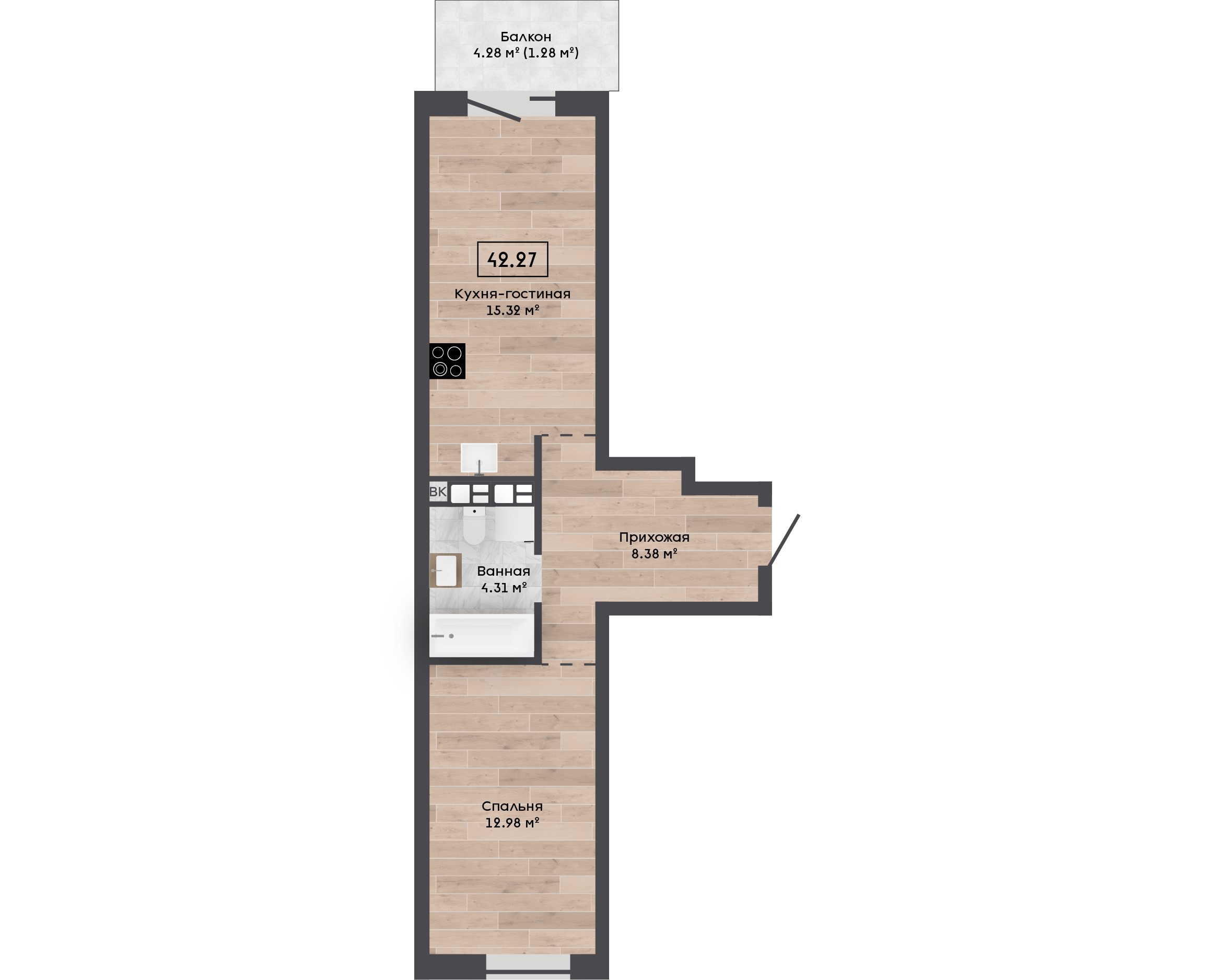 | 42,27 м² Площадь квартиры | 2,72 м Высота потолков | 500 мм Высота подоконной части |