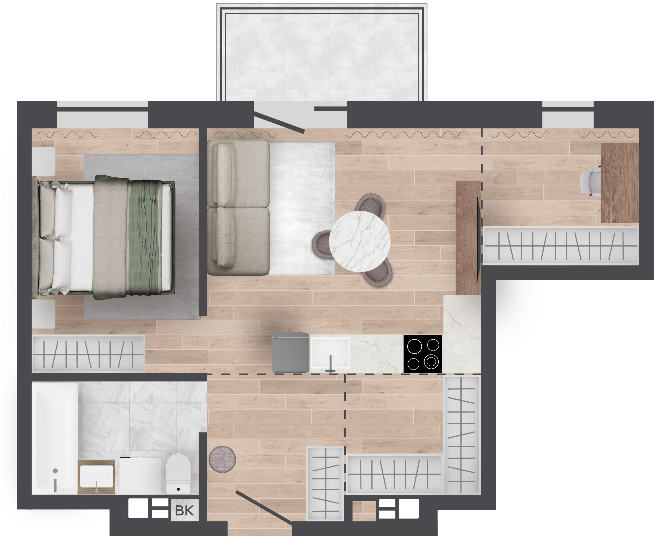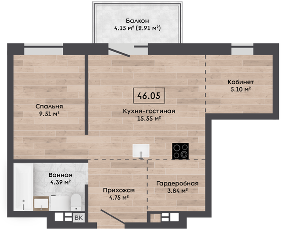 | 46,05 м² Площадь квартиры | 2,72 м Высота потолков | 500 мм Высота подоконной части |