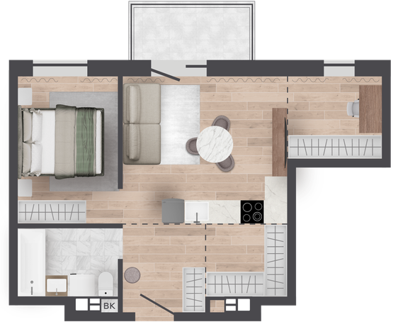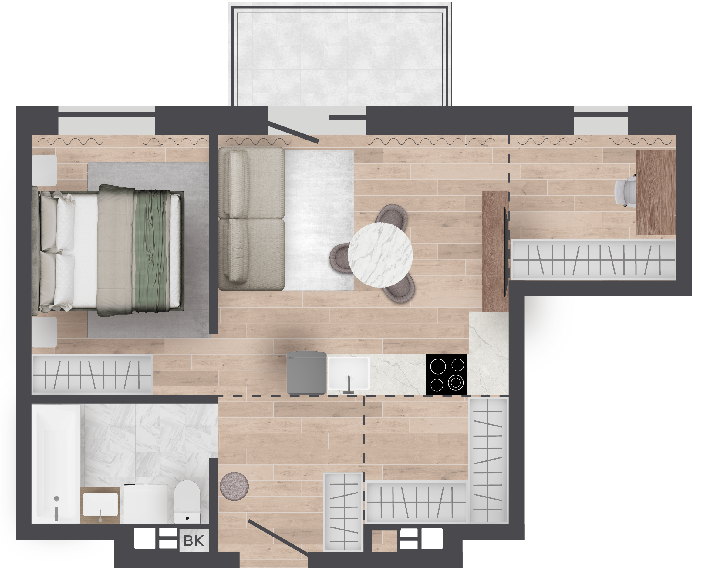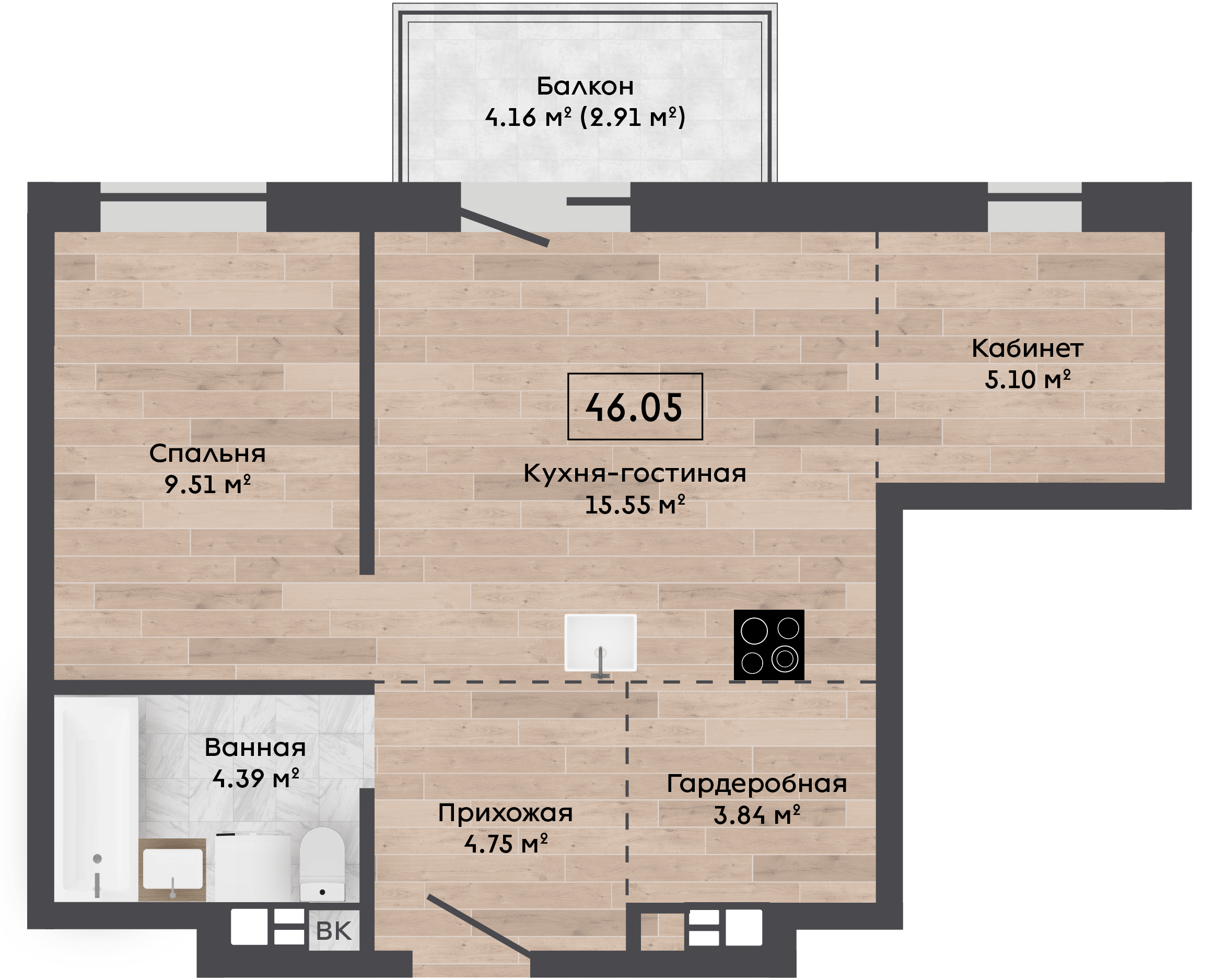 | 46,05 м² Площадь квартиры | 2,72 м Высота потолков | 500 мм Высота подоконной части |