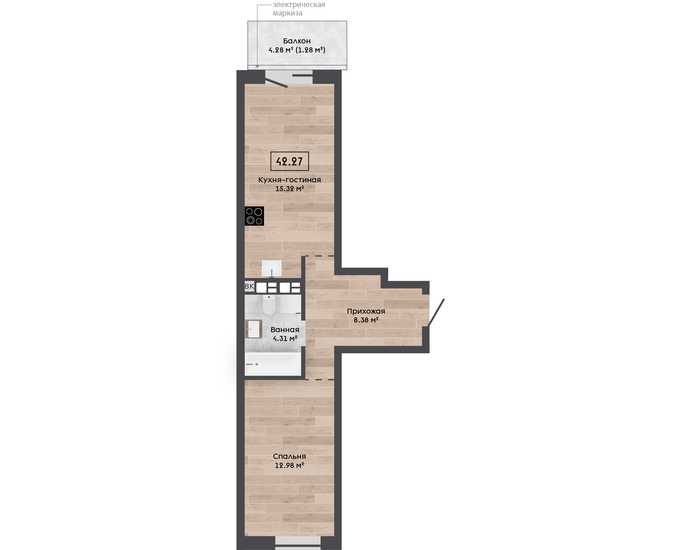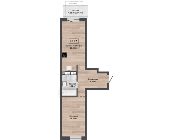 | 42,27 м² Площадь квартиры | 2,72 м Высота потолков | 500 мм Высота подоконной части |