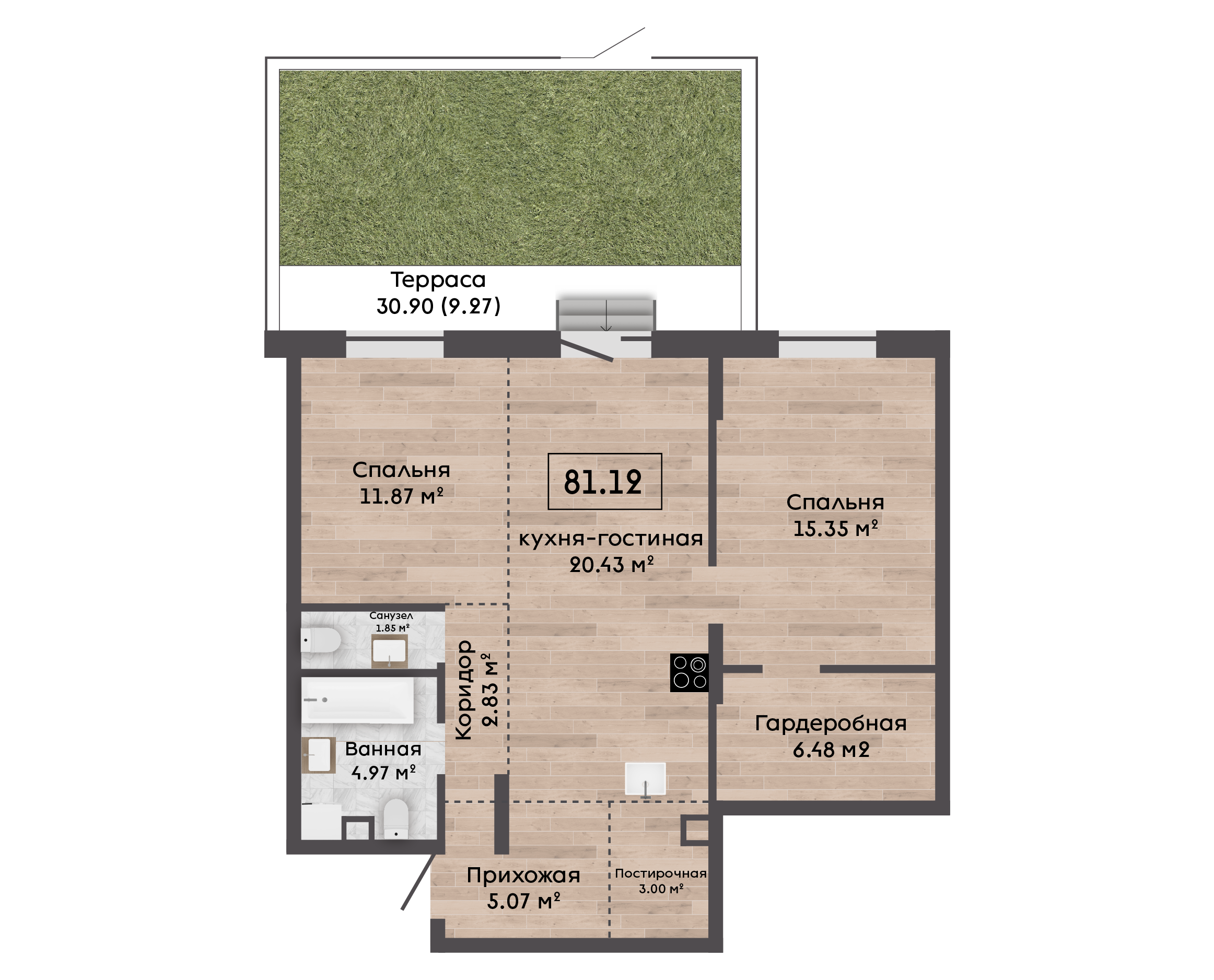 | 81,12 м² Площадь квартиры | 2,72 м Высота потолков | 30,90 м² Площадь участка |