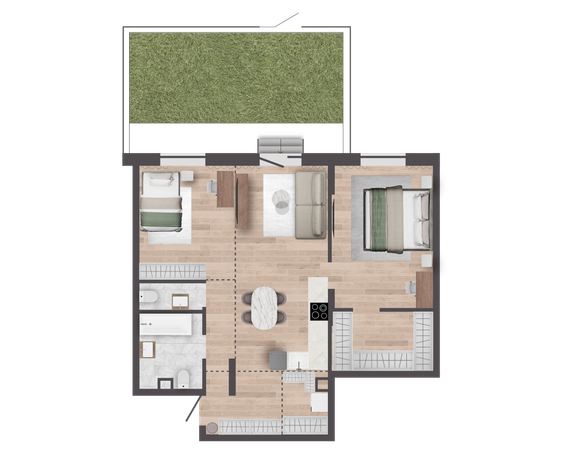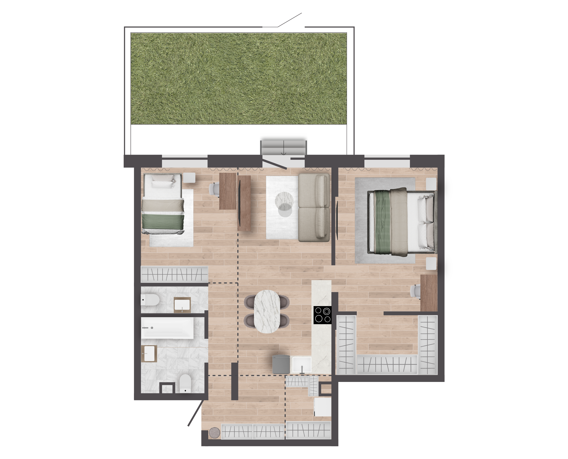 Участки от 16 до 38 квадратных метров дают возможность реализовать множество идей, от создания цветников до установки зон для отдыха с беседками или шезлонгами. Участки приподняты на 0,5 метра над уровнем территории двора и обнесены металлическим ограждением;