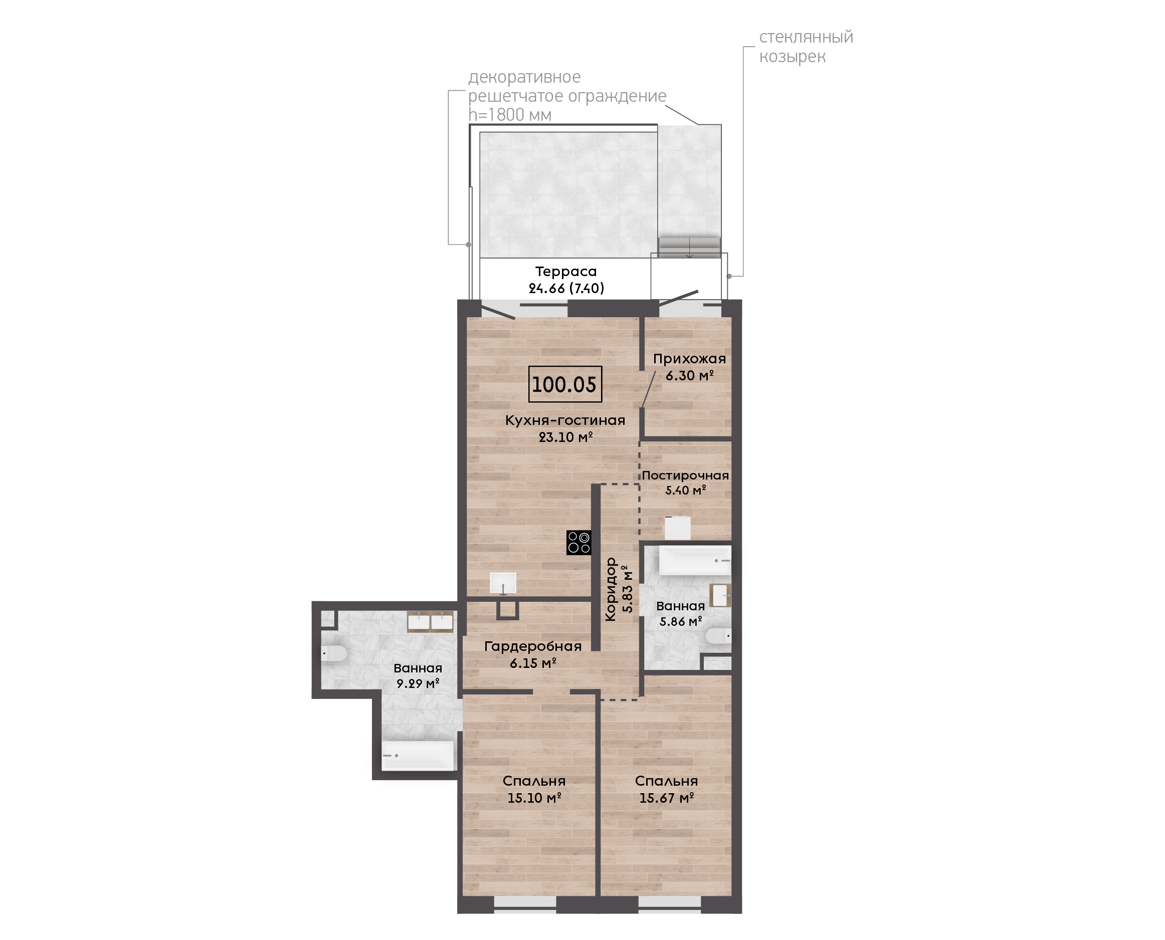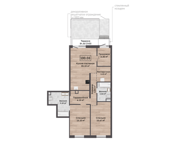 | 100,80 м² Площадь квартиры | 2,72 м Высота потолков | 24,66 м² Площадь участка |