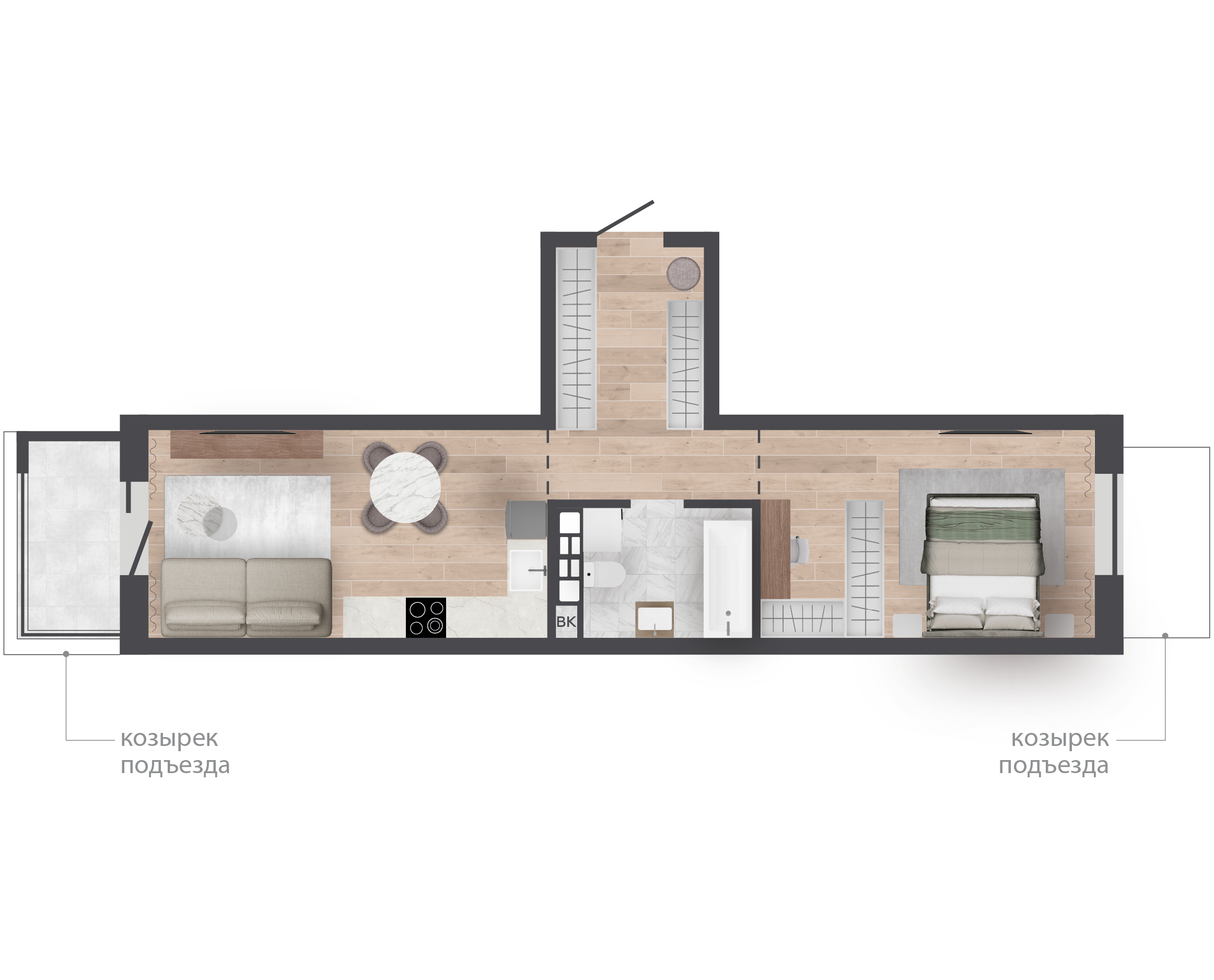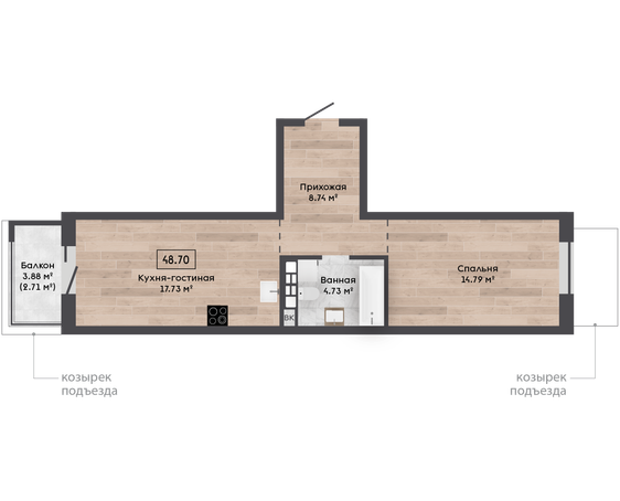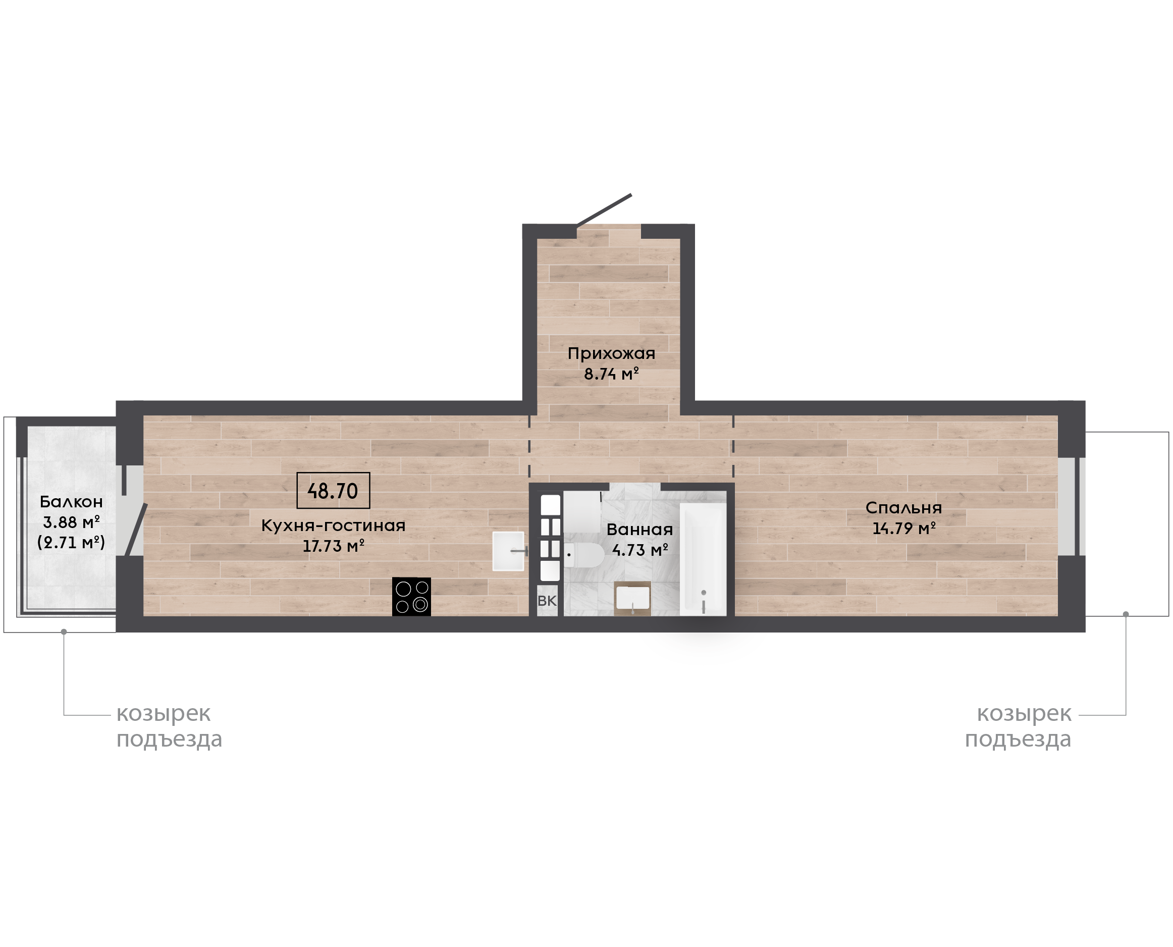 | 48,70 м² Площадь квартиры | 2,72 м Высота потолков | 500 мм Высота подоконной части |