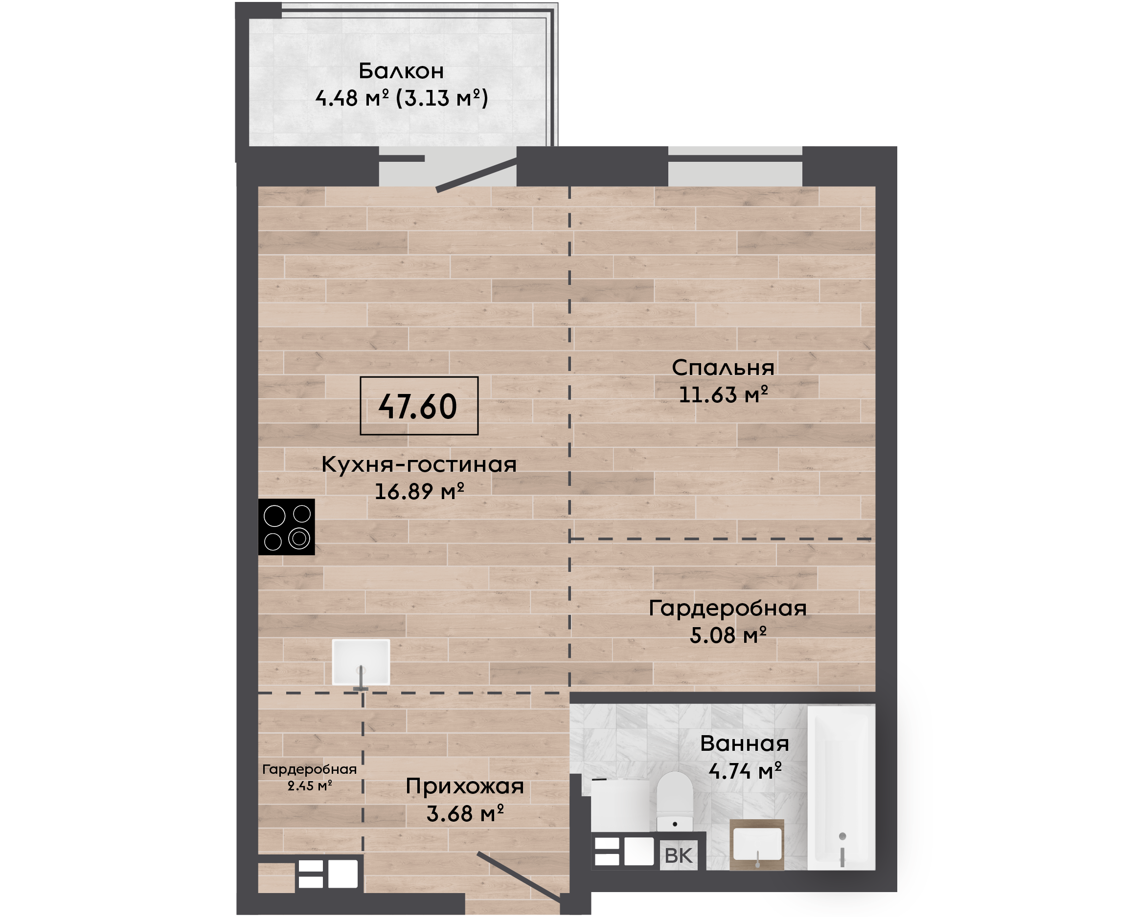 | 47,60 м² Площадь квартиры | 2,72 м Высота потолков | 500 мм Высота подоконной части |