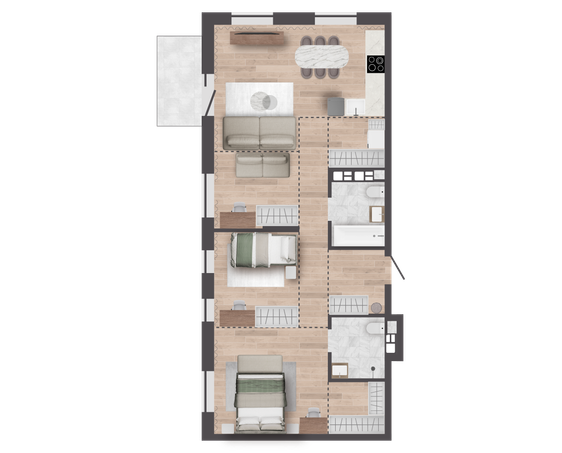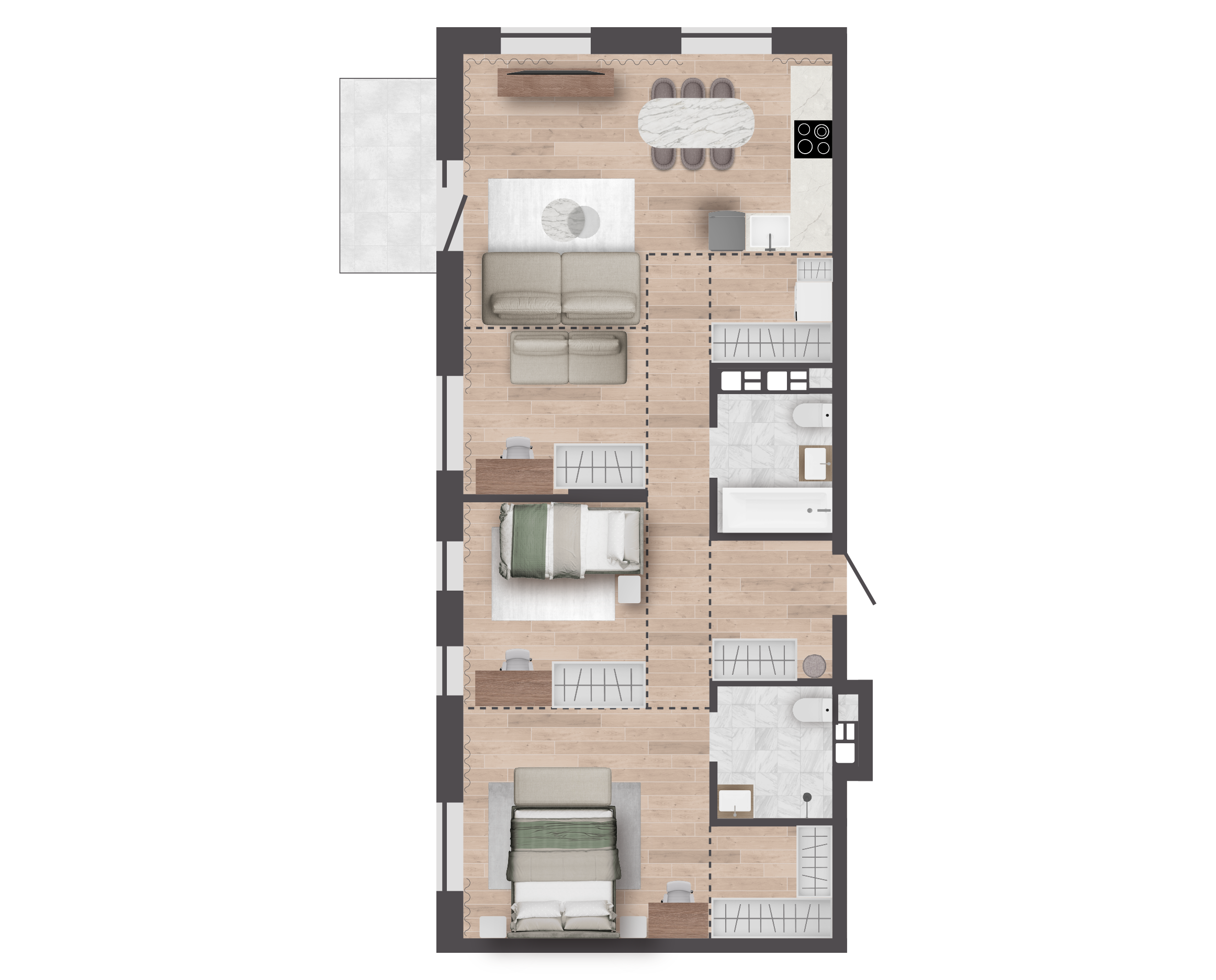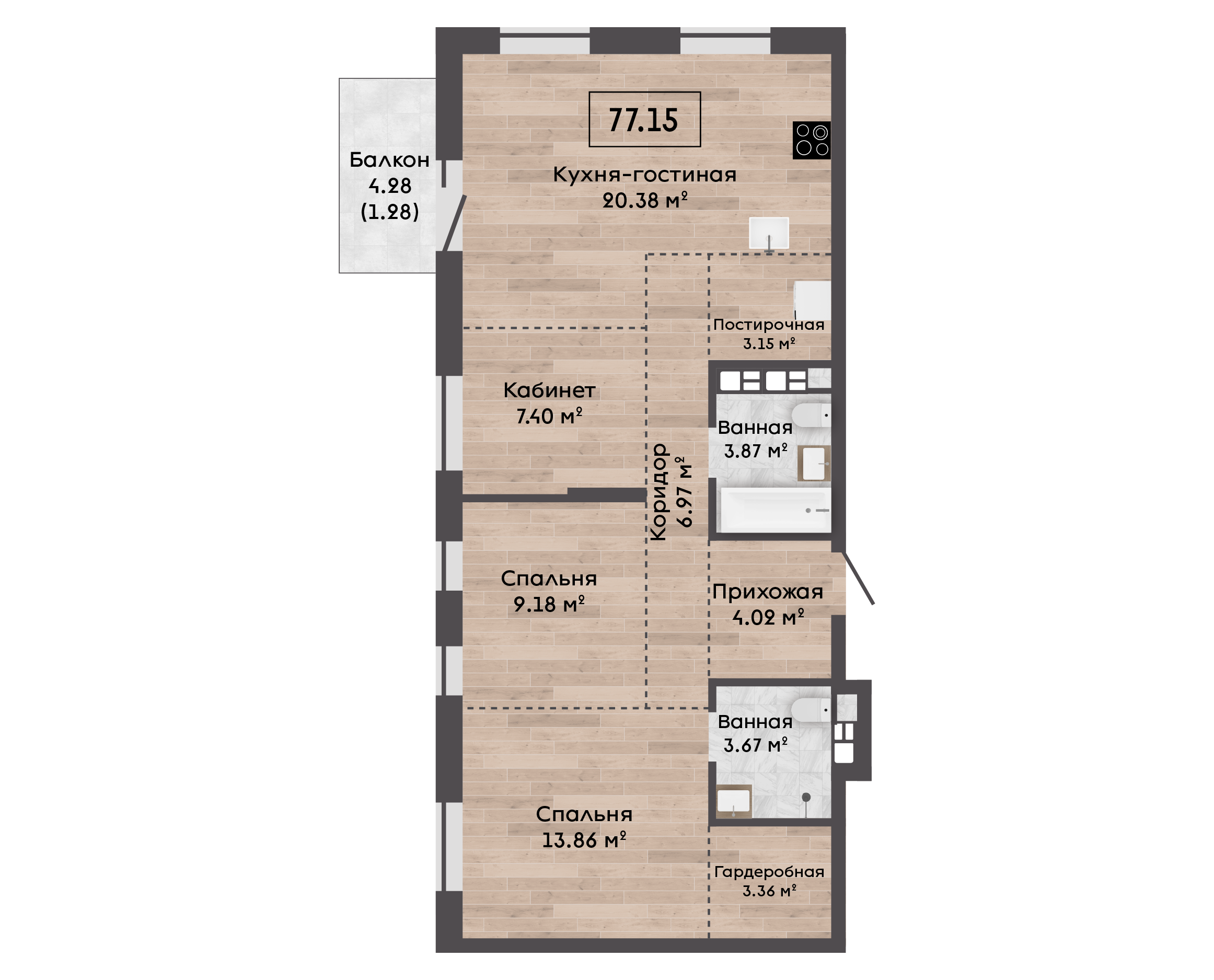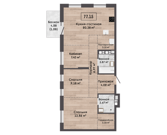 | 77,15 м² Площадь квартиры | 2,72 м Высота потолков | 500 мм Высота подоконной части |