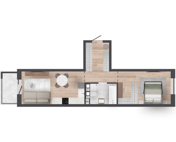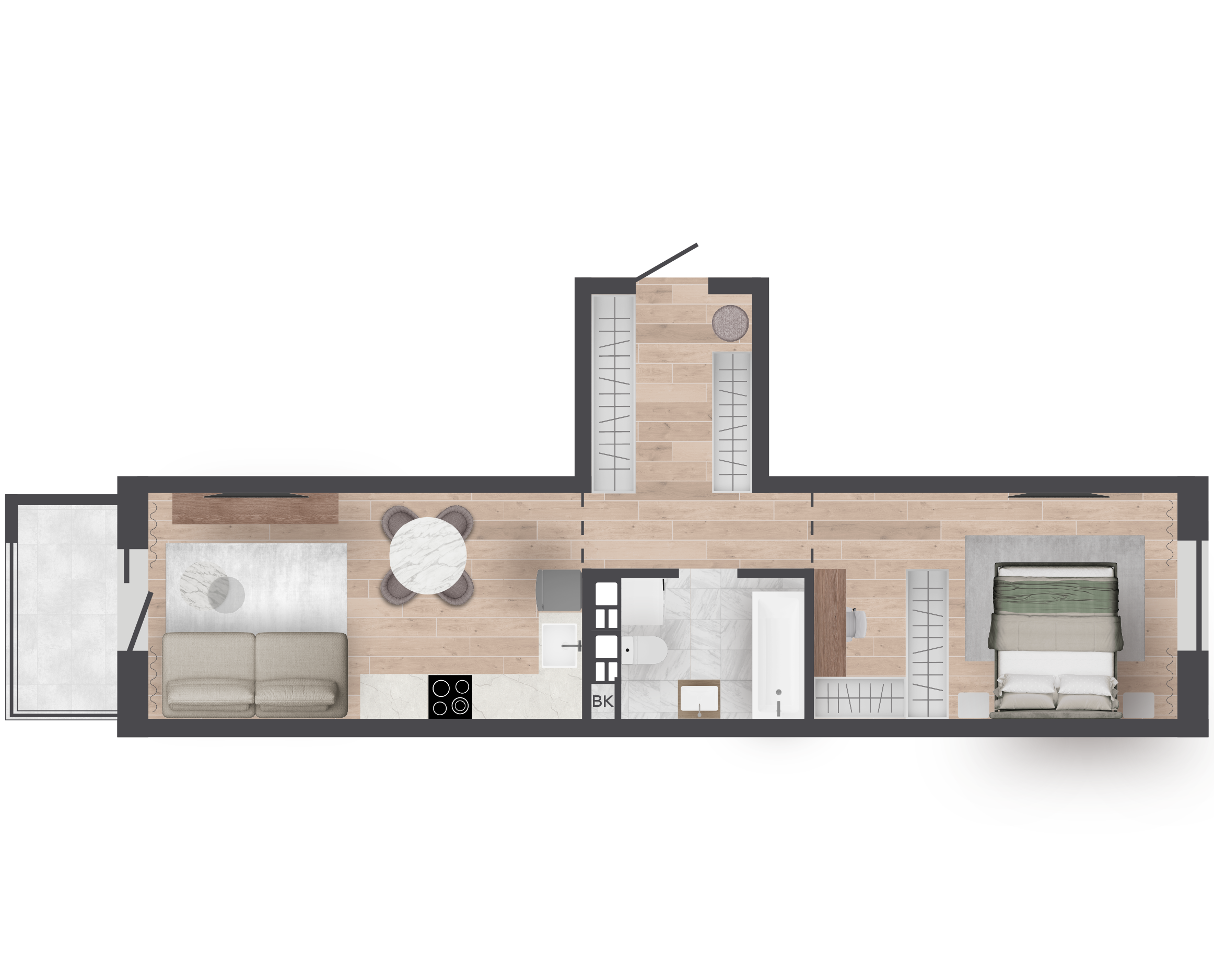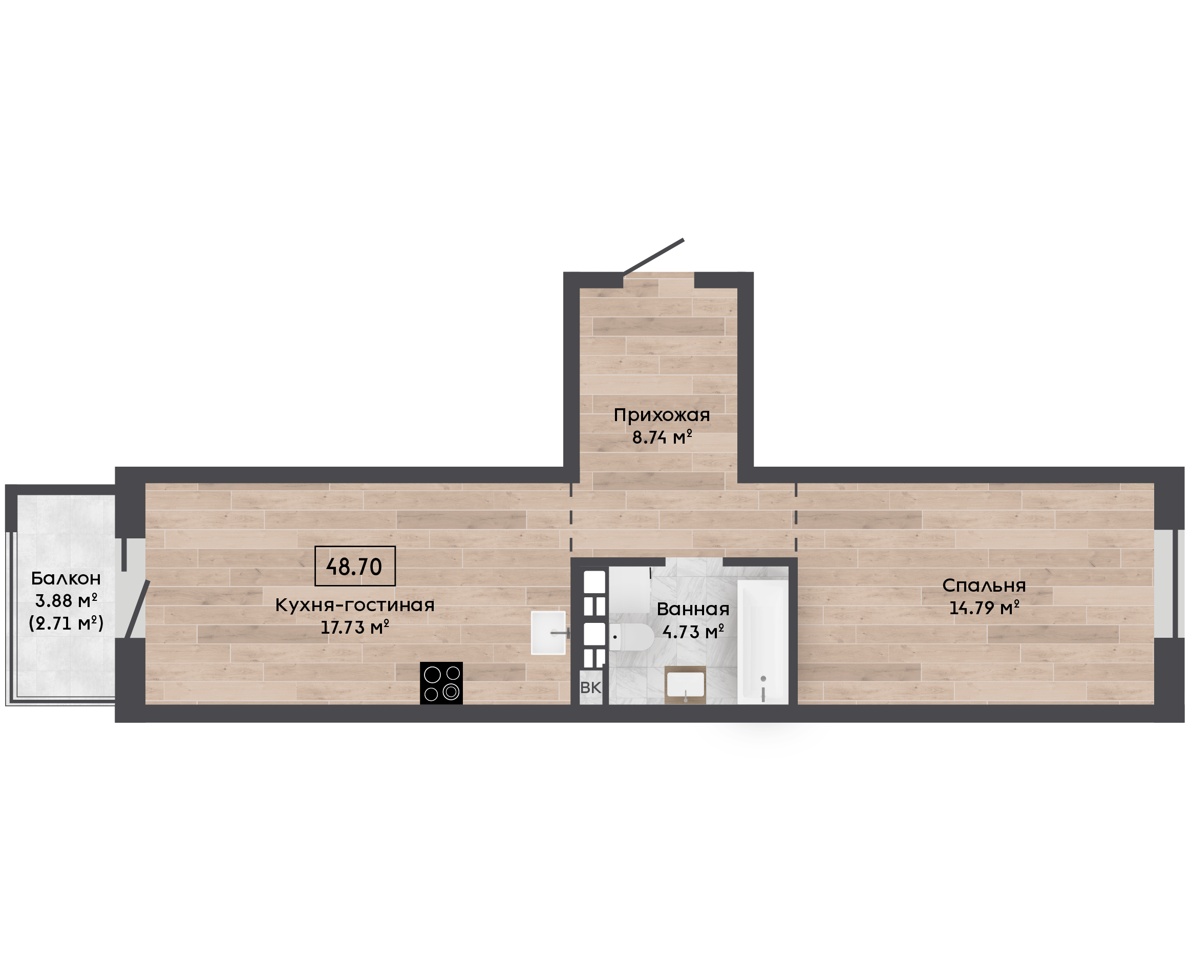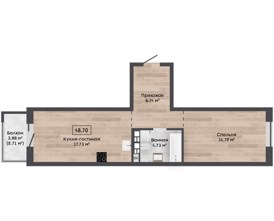 | 48,70 м² Площадь квартиры | 2,72 м Высота потолков | 500 мм Высота подоконной части |