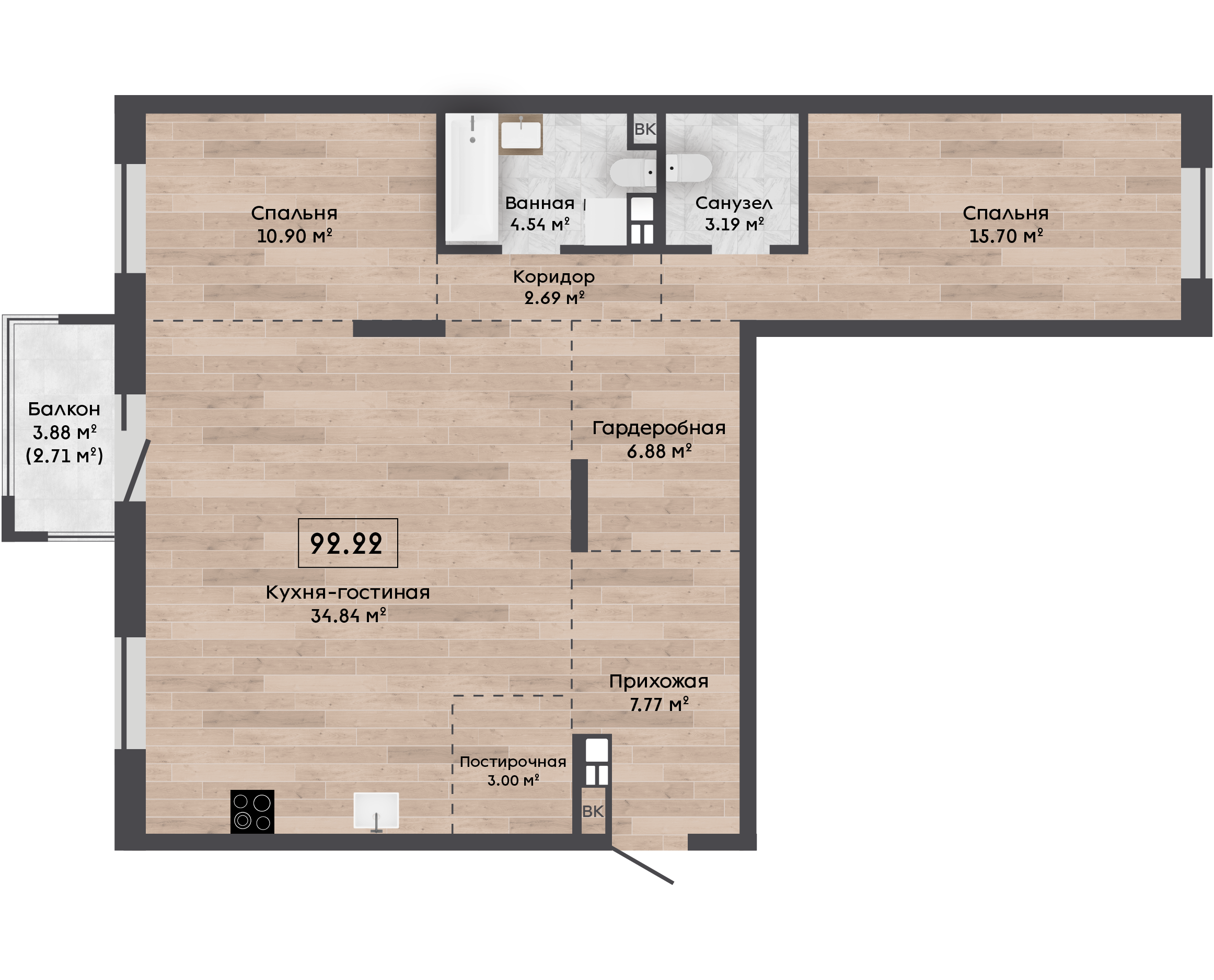 | 92,22 м² Площадь квартиры | 2,72 м Высота потолков | 500 мм Высота подоконной части |