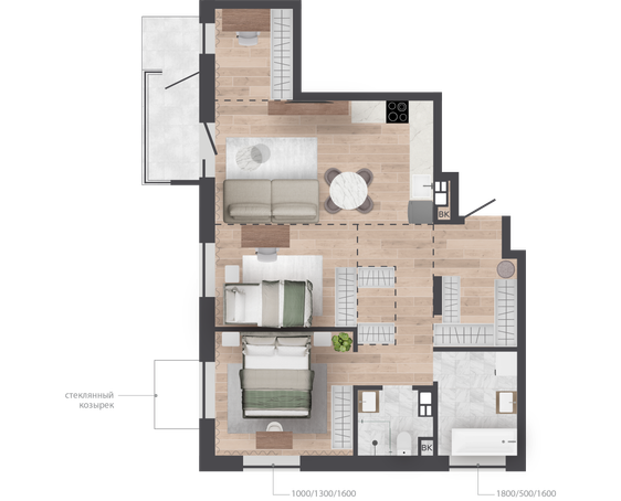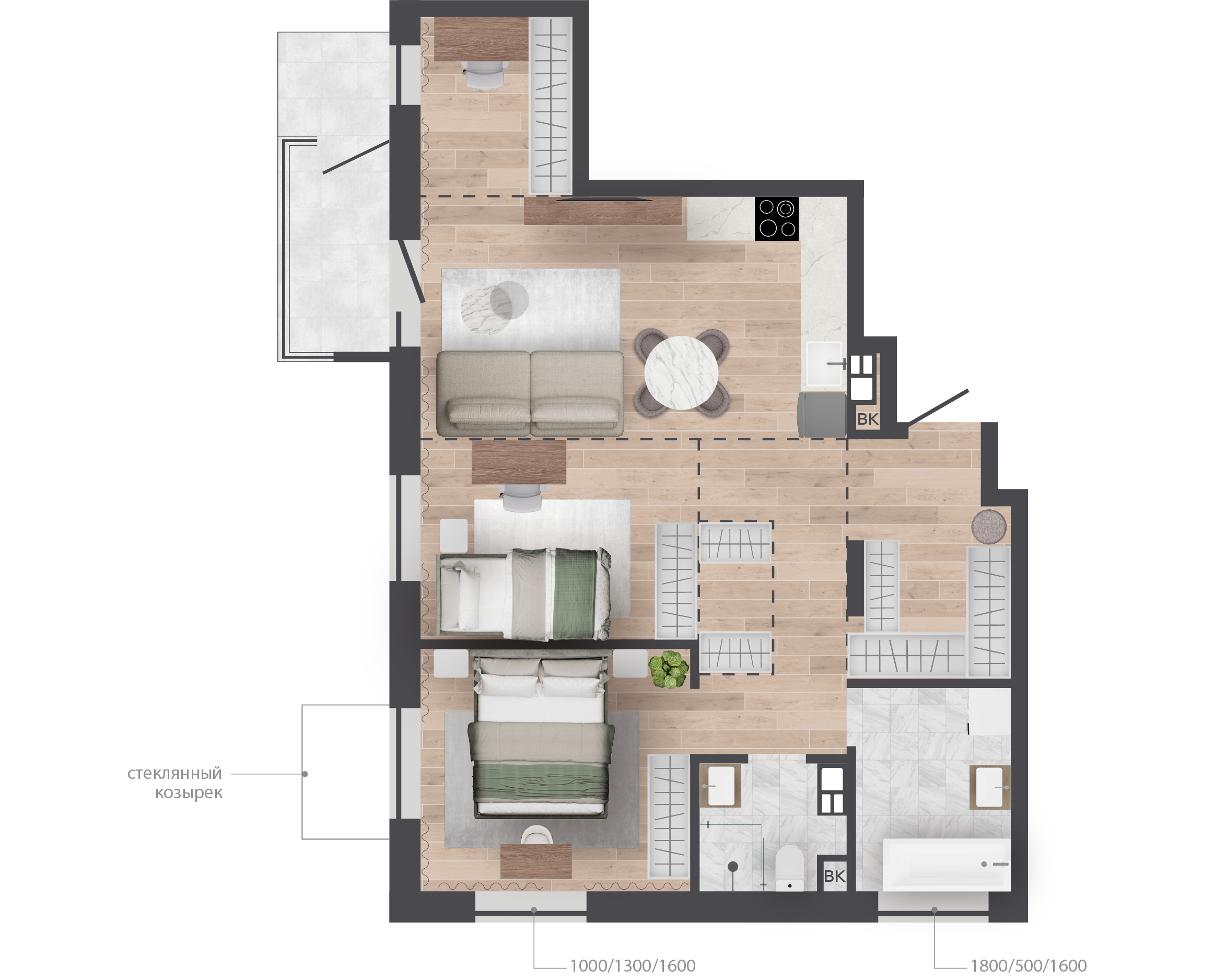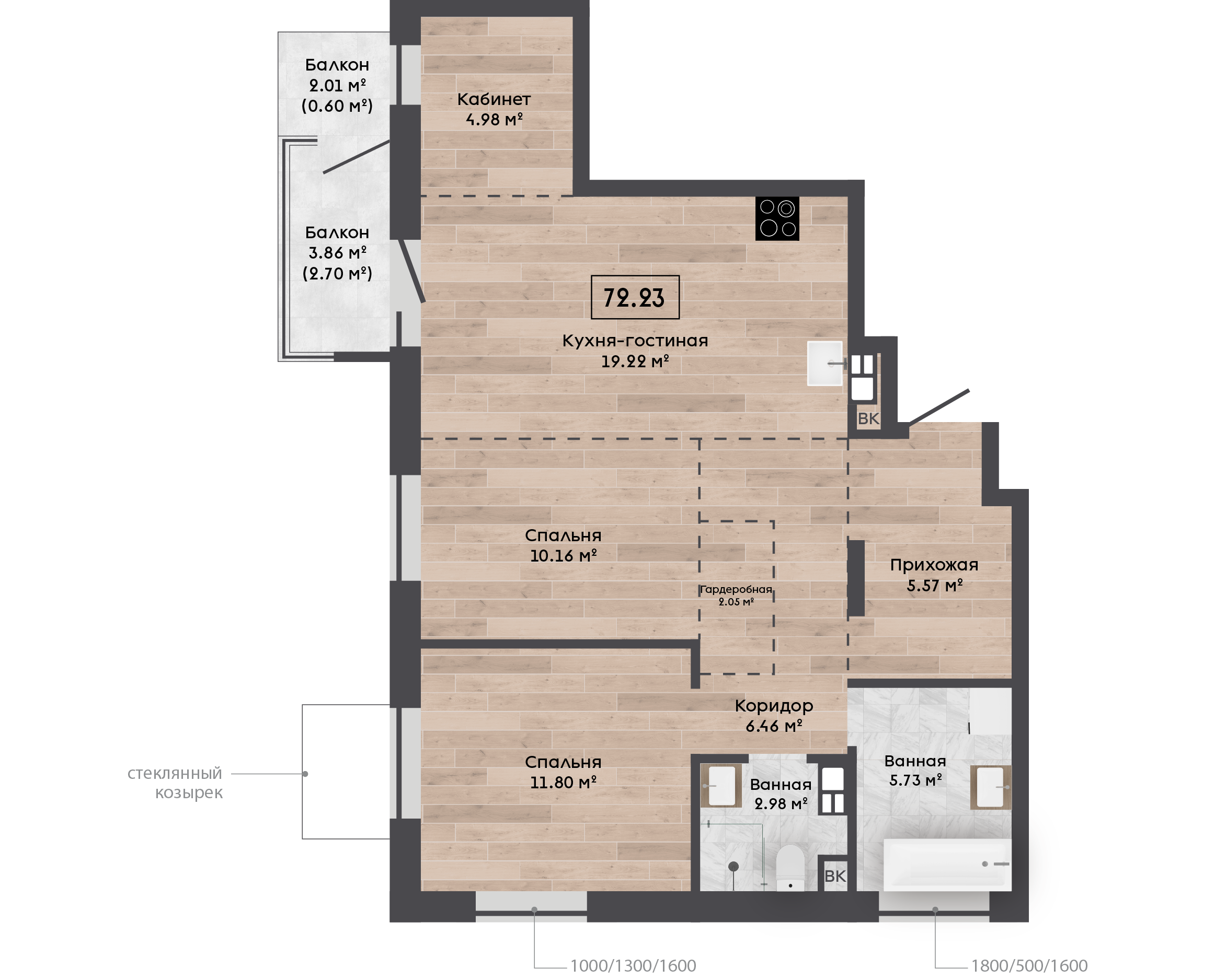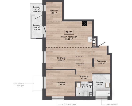 | 72,23 м² Площадь квартиры | 2,72 м Высота потолков | 500 мм Высота подоконной части |