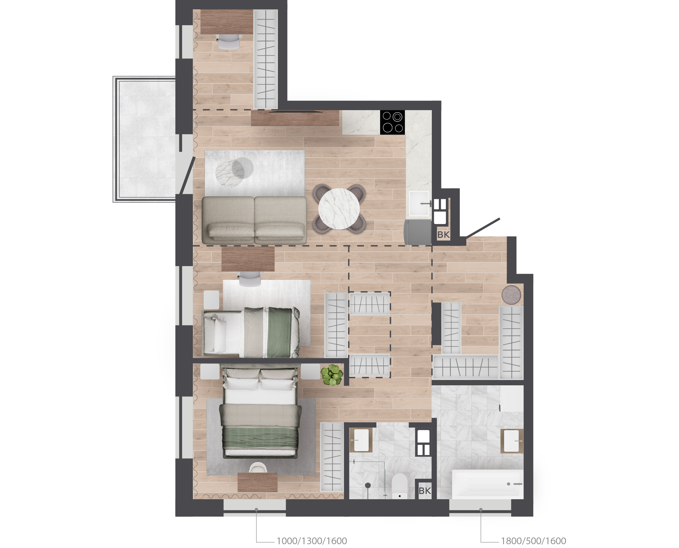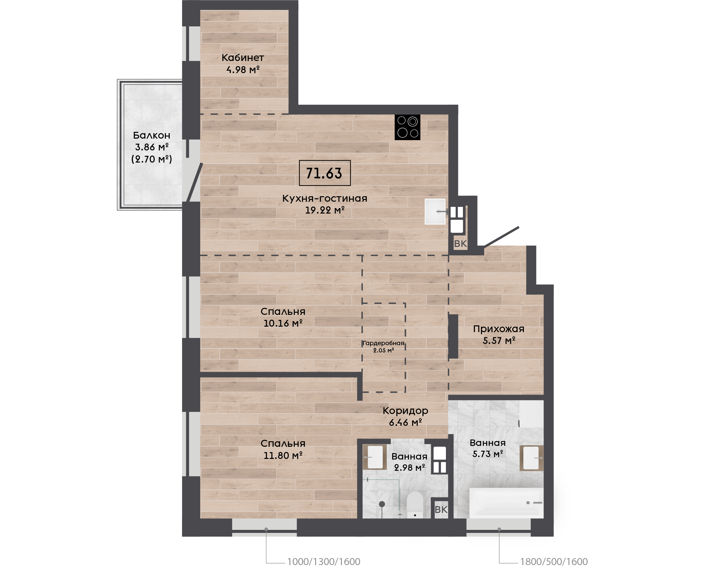 | 71,63 м² Площадь квартиры | 2,72 м Высота потолков | 500 мм Высота подоконной части |