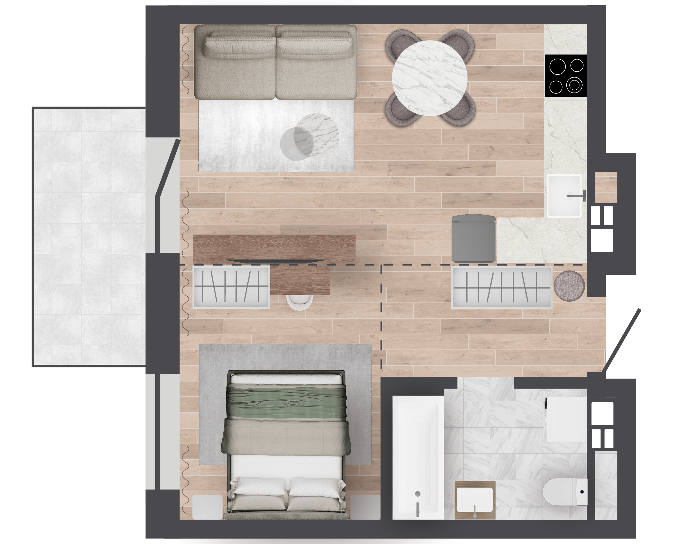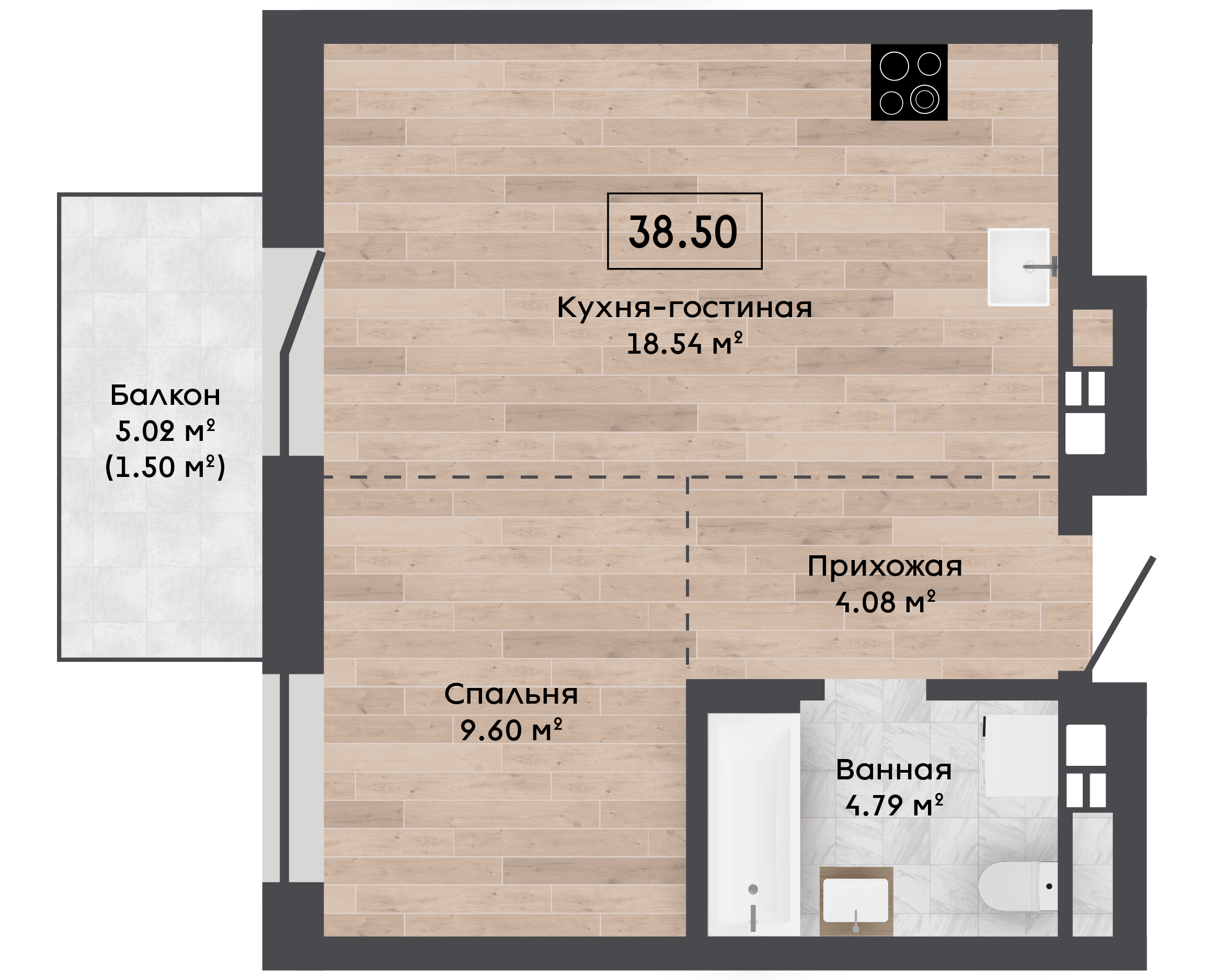 | 38,50 м² Площадь квартиры | 2,72 м Высота потолков | 500 мм Высота подоконной части |