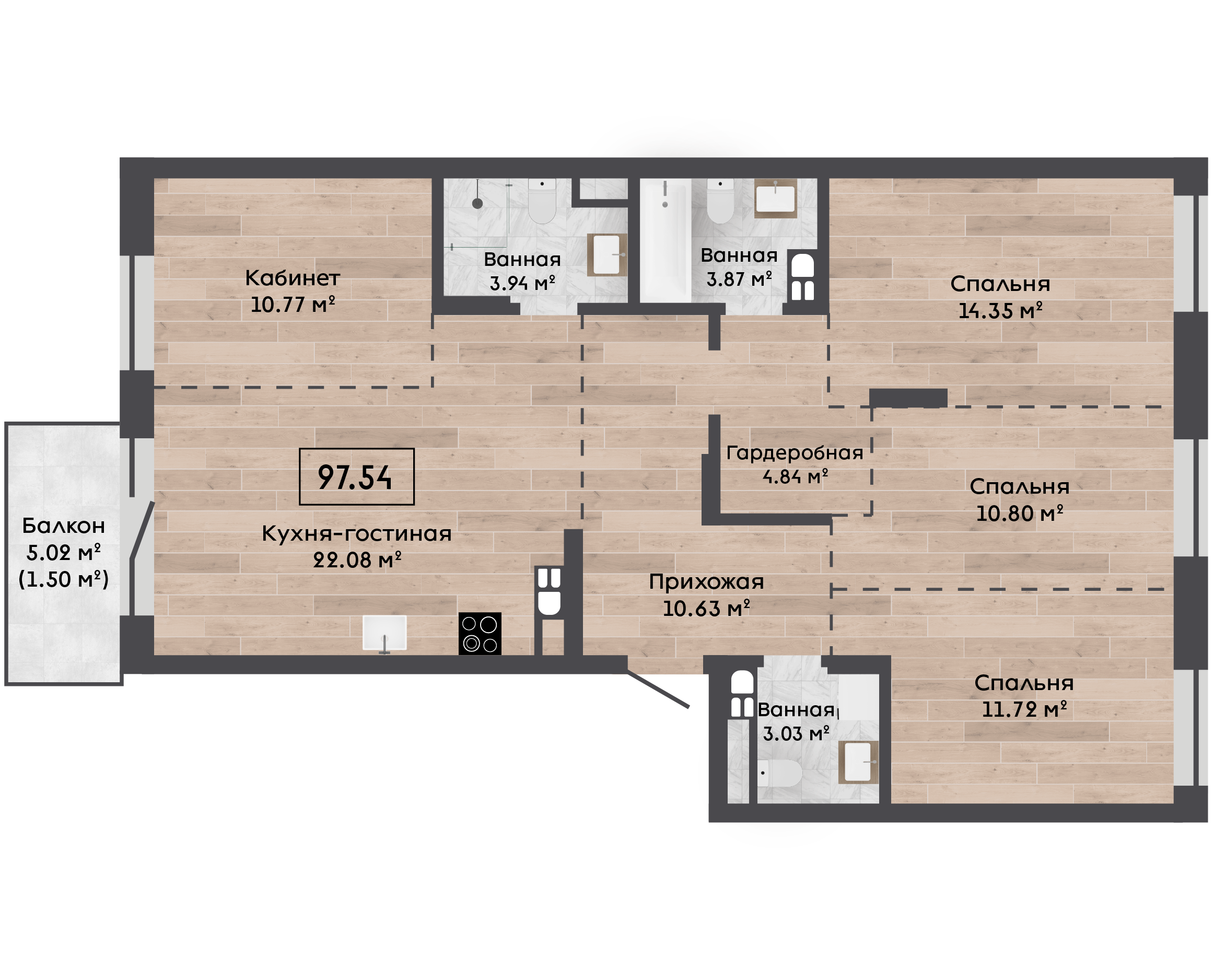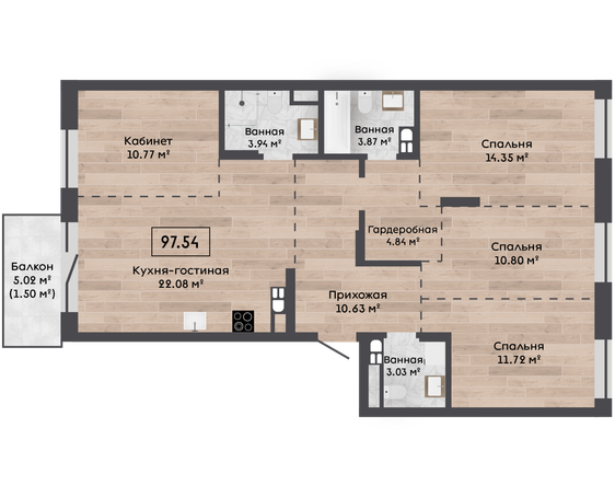 | 97,54 м² Площадь квартиры | 2,72 м Высота потолков | 500 мм Высота подоконной части |