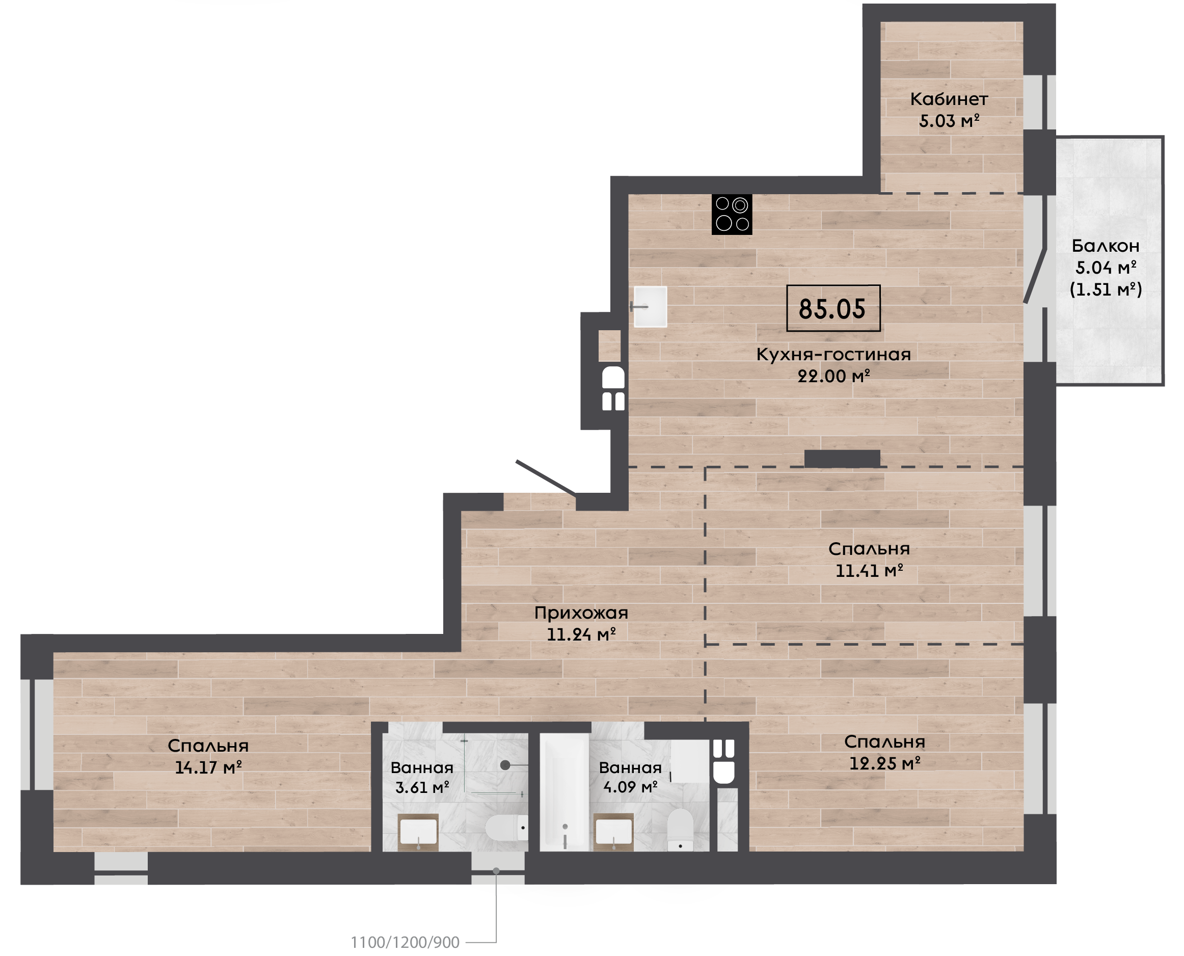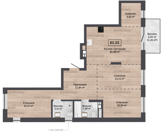 | 85,05 м² Площадь квартиры | 2,72 м Высота потолков | 500 мм Высота подоконной части |