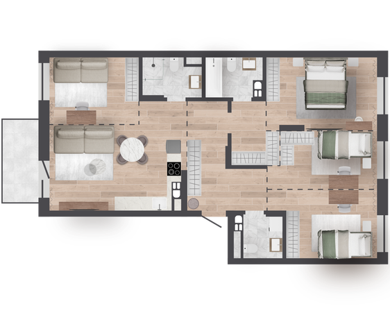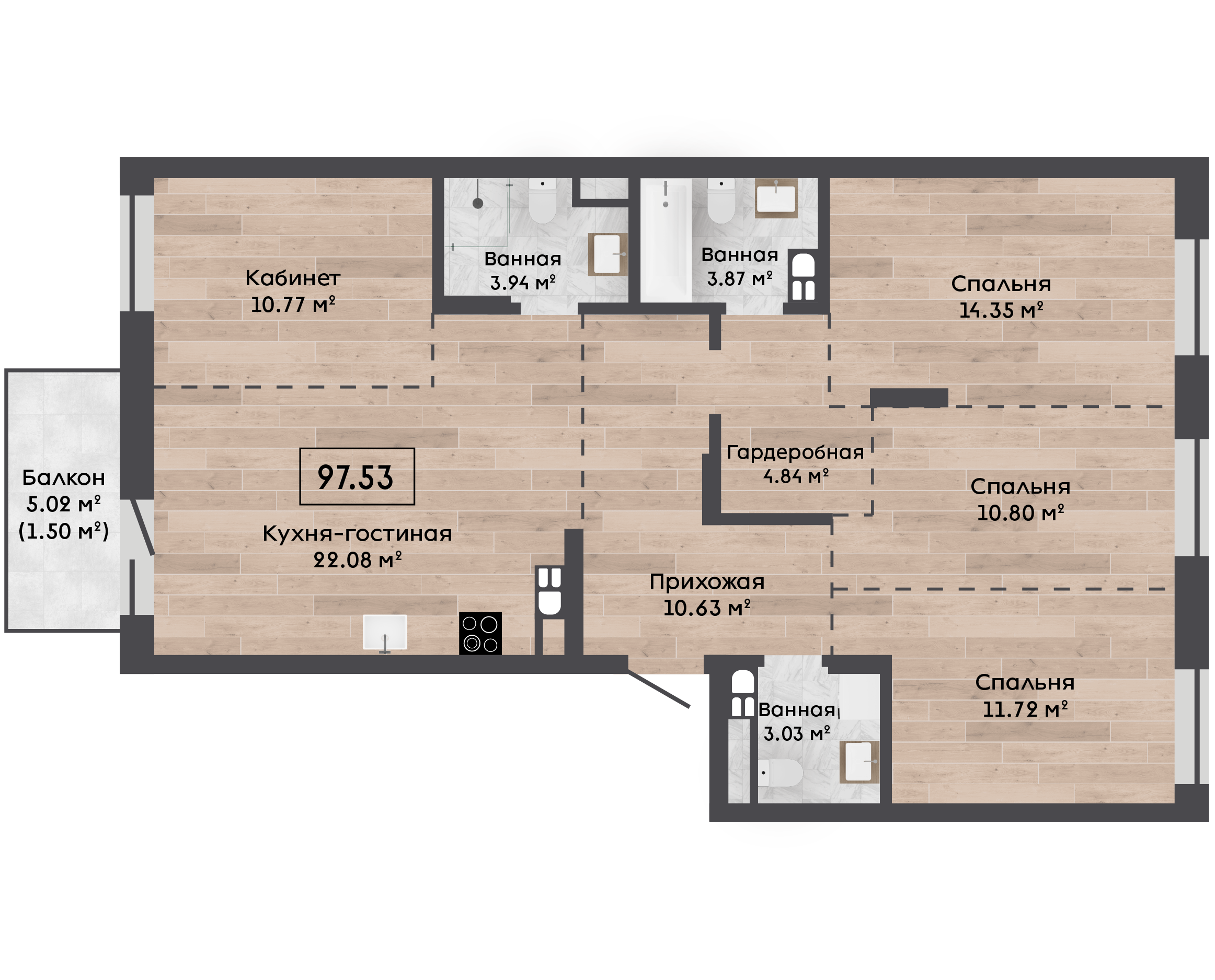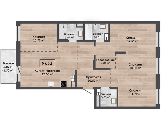 | 97,53 м² Площадь квартиры | 2,72 м Высота потолков | 500 мм Высота подоконной части |