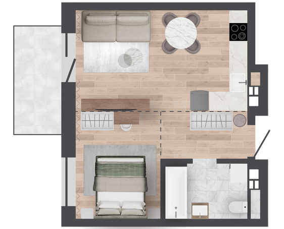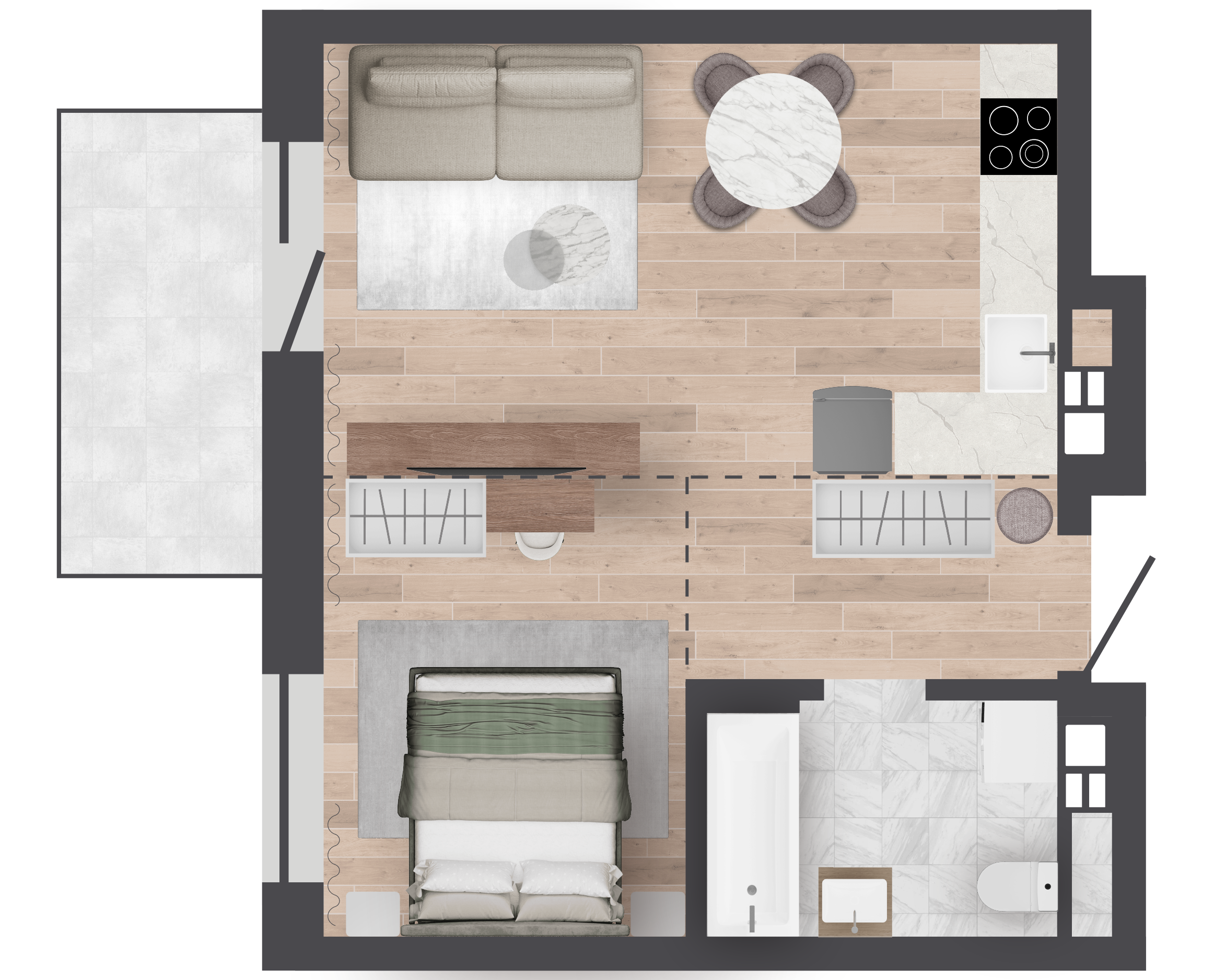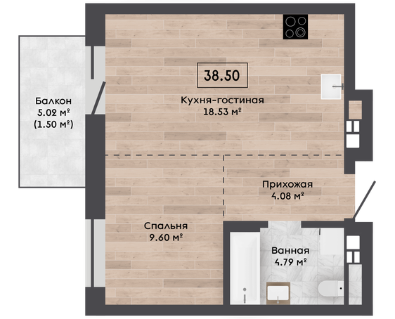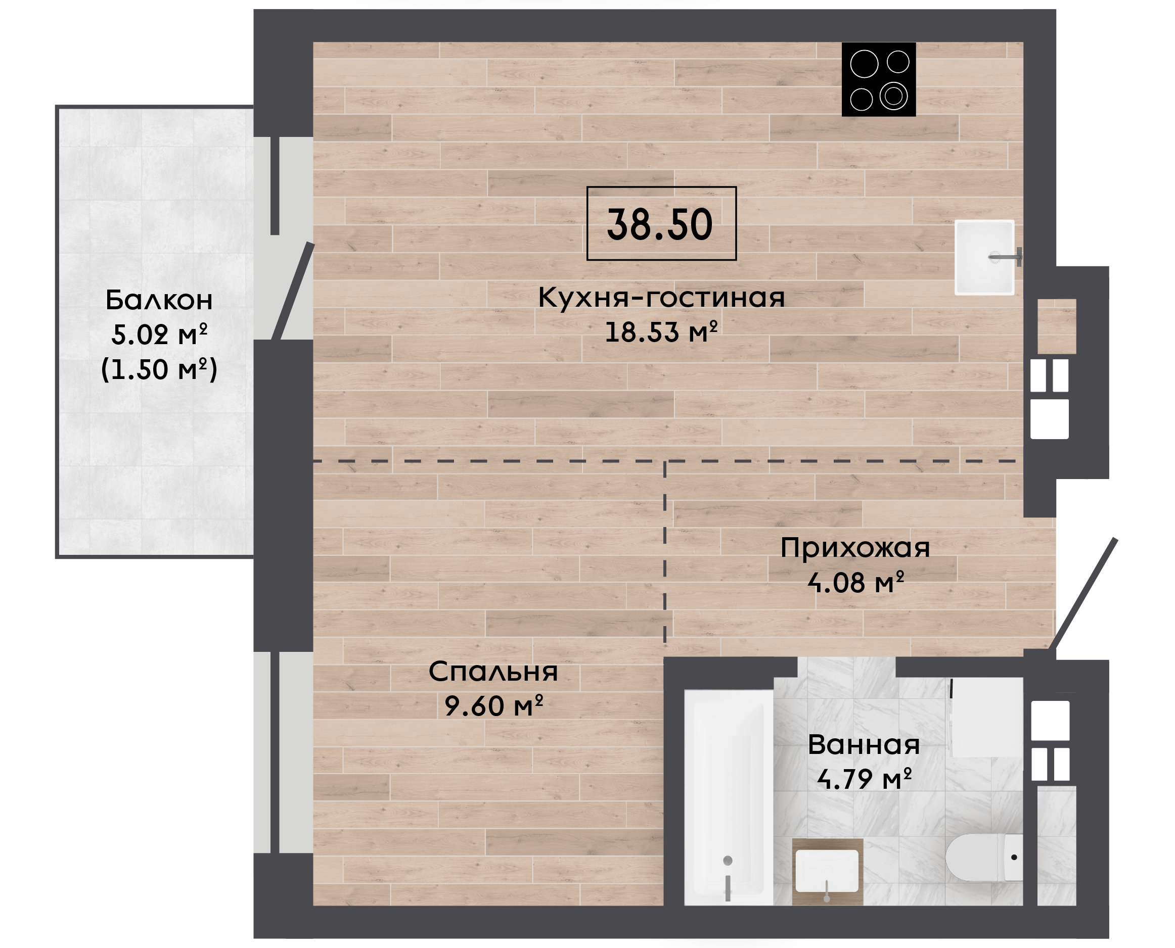 | 38,50 м² Площадь квартиры | 2,72 м Высота потолков | 500 мм Высота подоконной части |