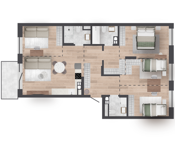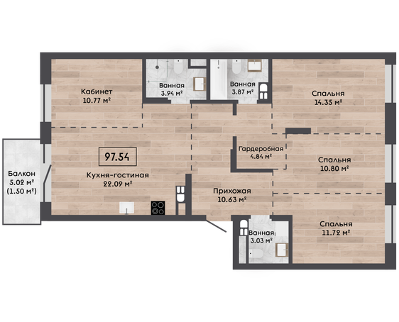 | 97,54 м² Площадь квартиры | 2,72 м Высота потолков | 500 мм Высота подоконной части |