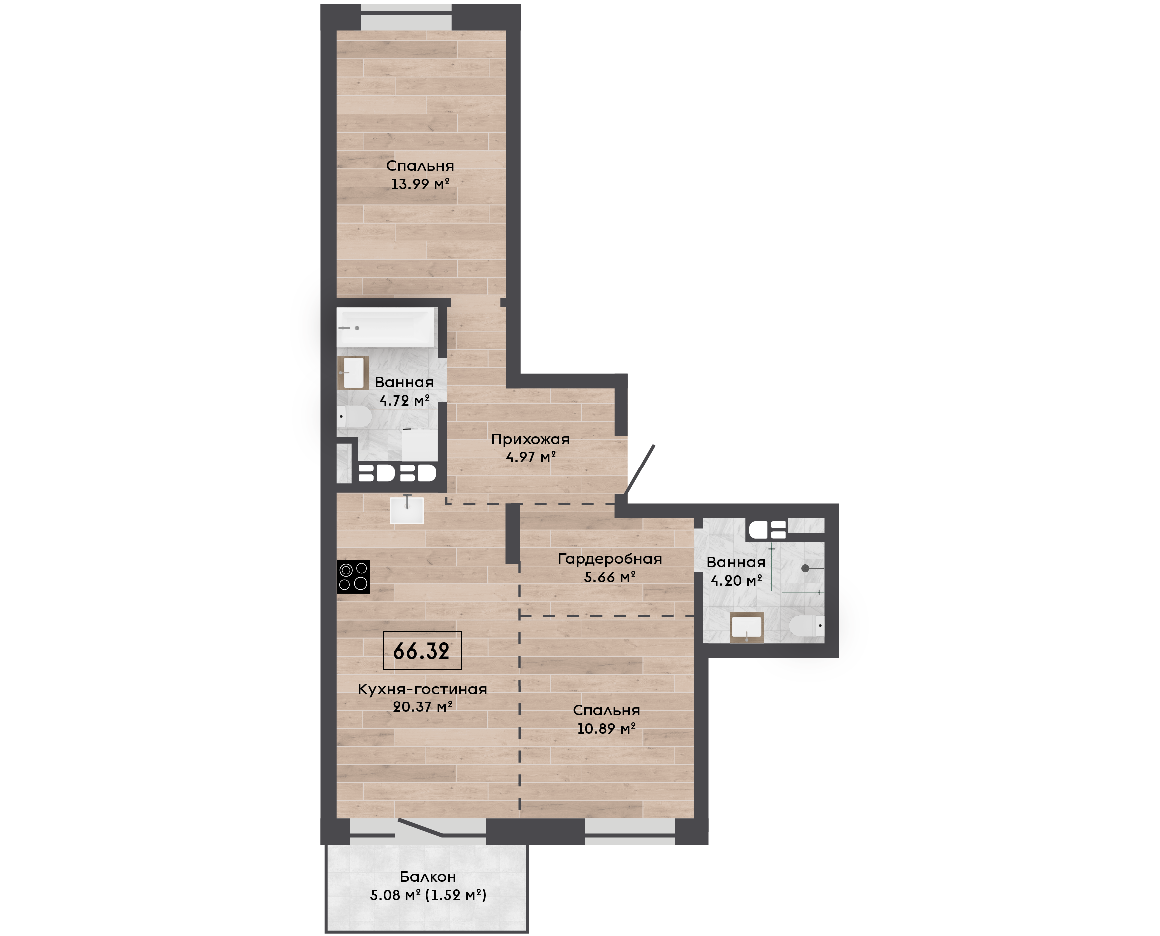 | 66,32 м² Площадь квартиры | 2,72 м Высота потолков | 500 мм Высота подоконной части |
