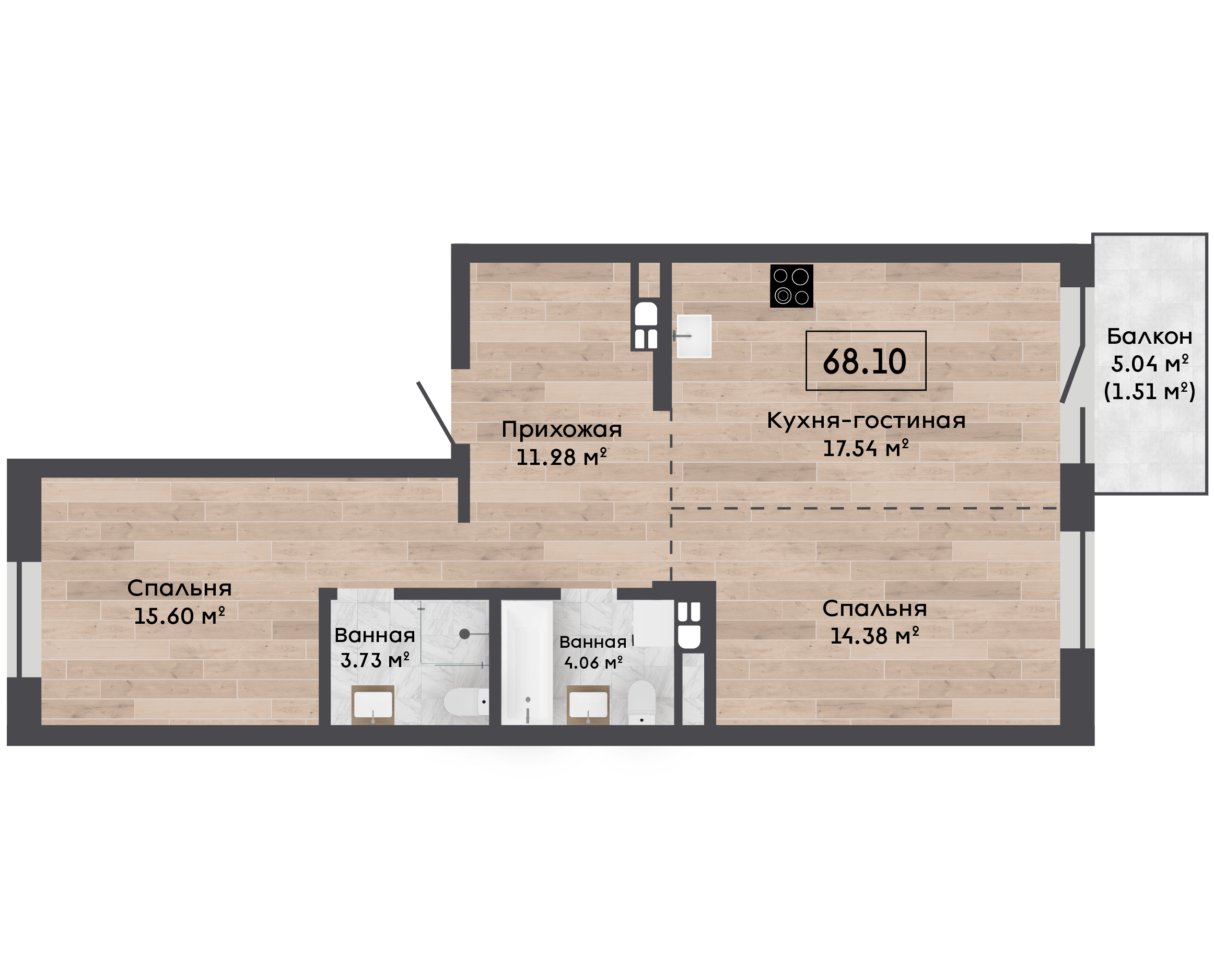 | 68,10 м² Площадь квартиры | 2,72 м Высота потолков | 500 мм Высота подоконной части |