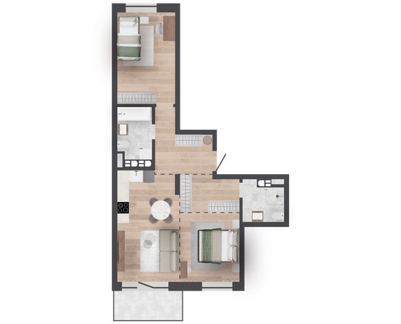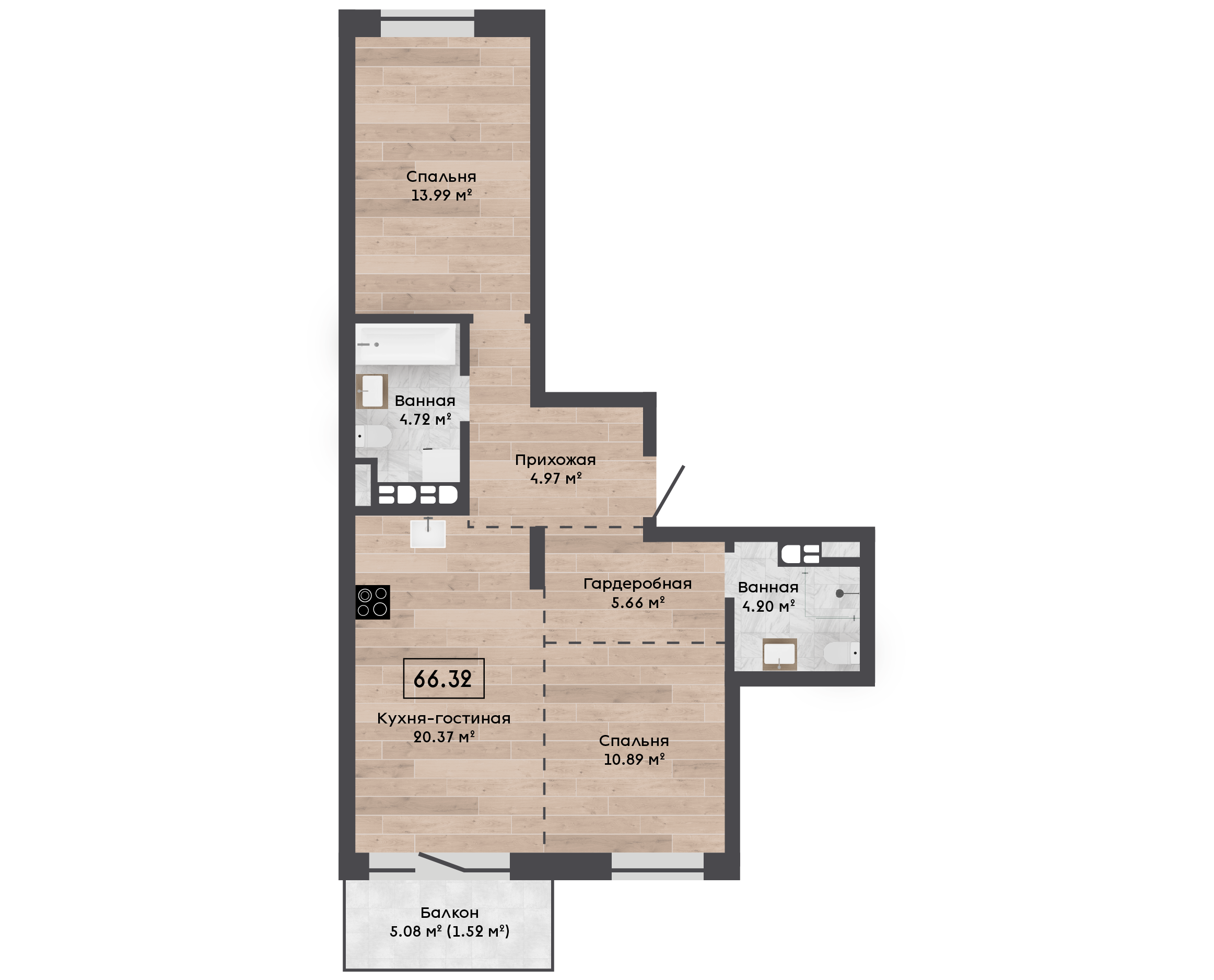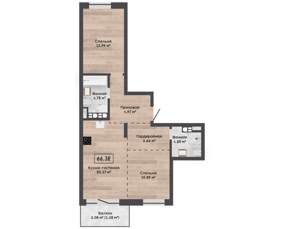 | 66,32 м² Площадь квартиры | 2,72 м Высота потолков | 500 мм Высота подоконной части |