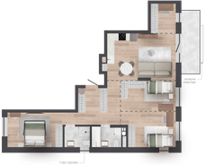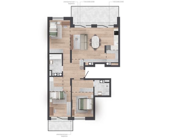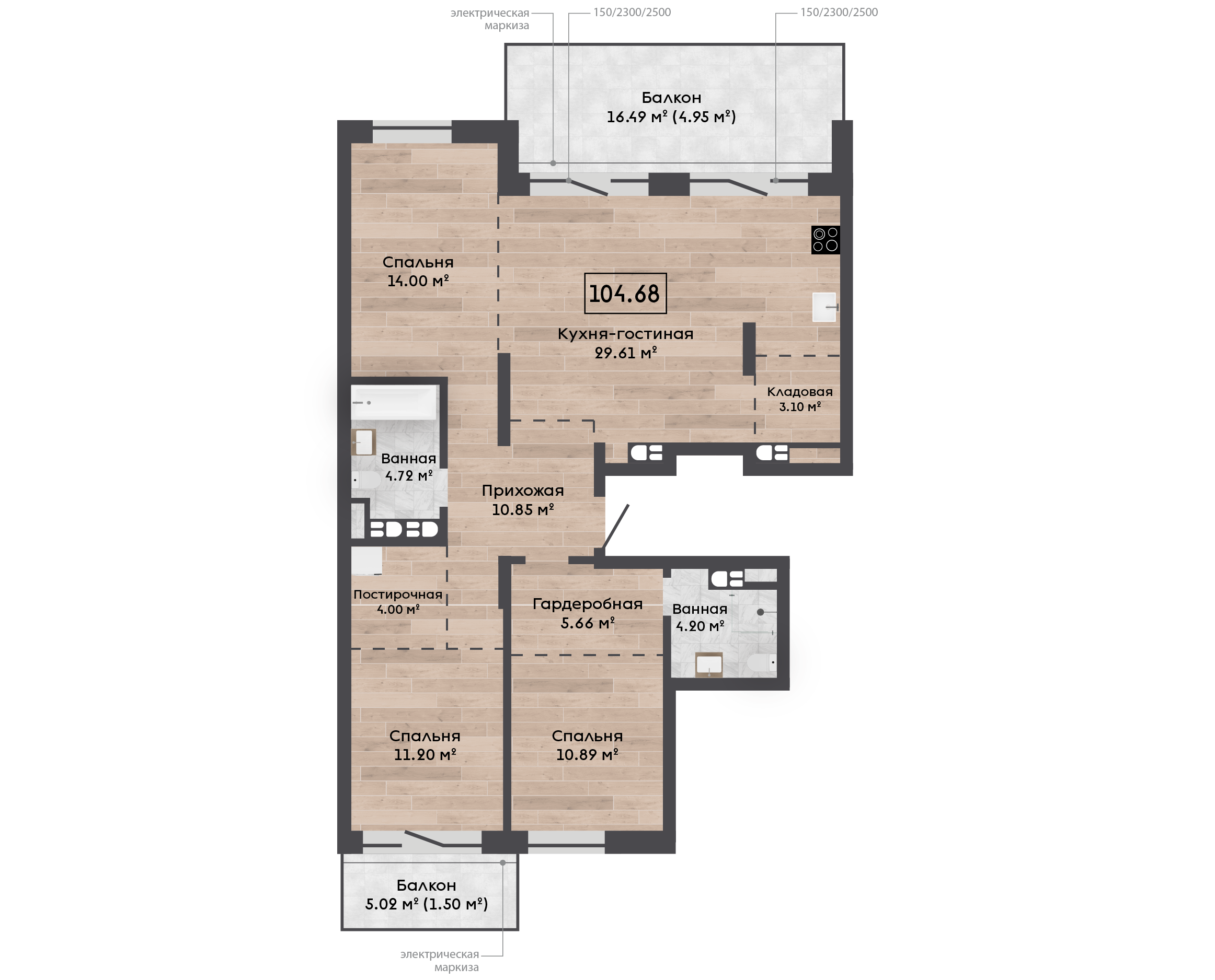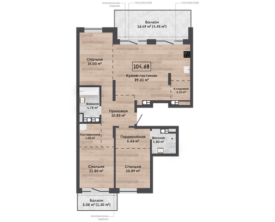 | 104,68 м² Площадь квартиры | 2,72 м Высота потолков | 500 мм Высота подоконной части |