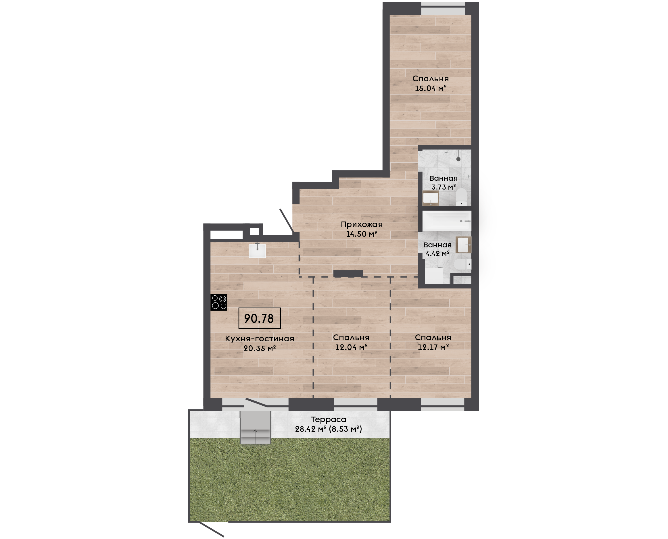 | 90,78 м² Площадь квартиры | 2,72 м Высота потолков | 28 м² Площадь участка |