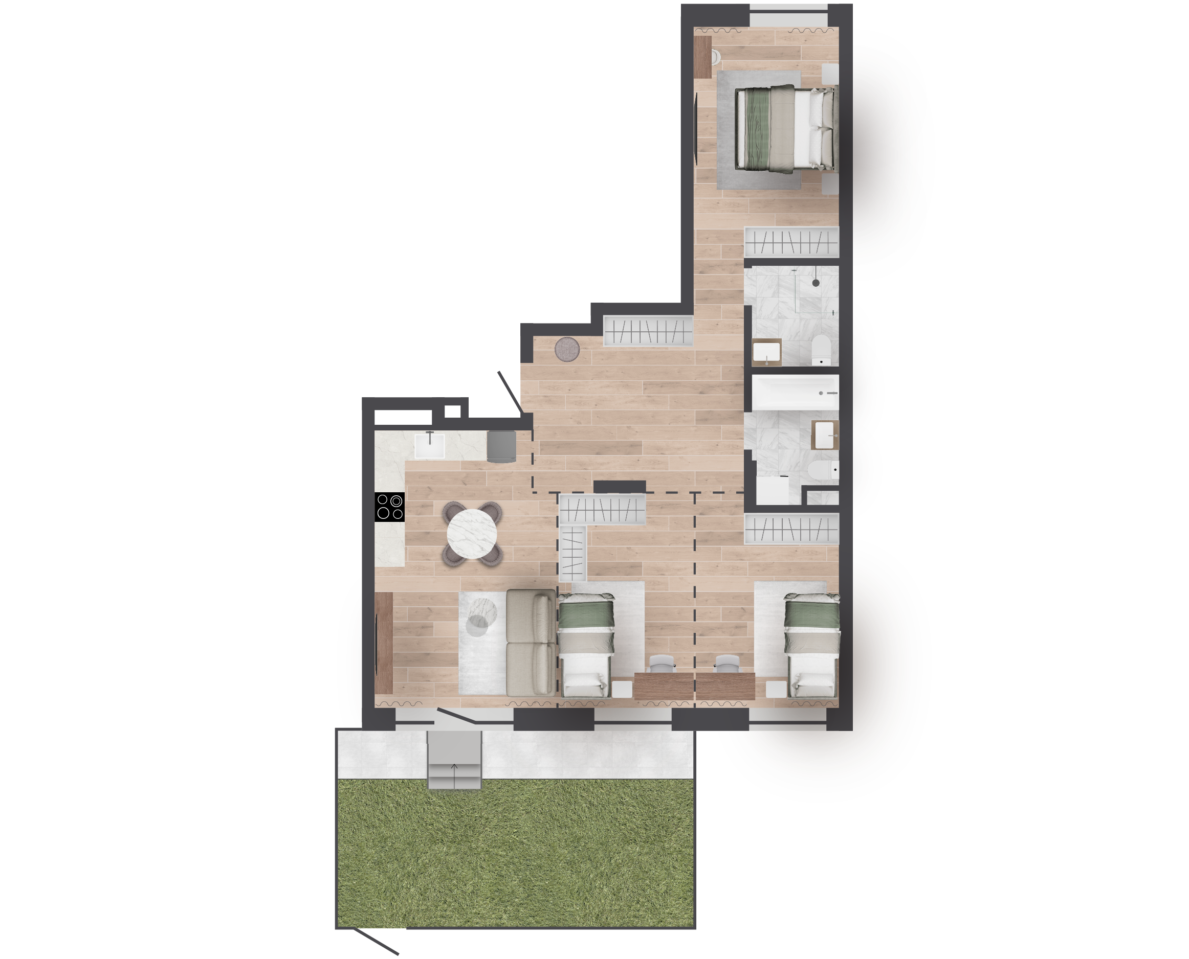 Участки от 16 до 38 квадратных метров дают возможность реализовать множество идей, от создания цветников до установки зон для отдыха с беседками или шезлонгами. Участки приподняты на 0,5 метра над уровнем территории двора и обнесены металлическим ограждением;