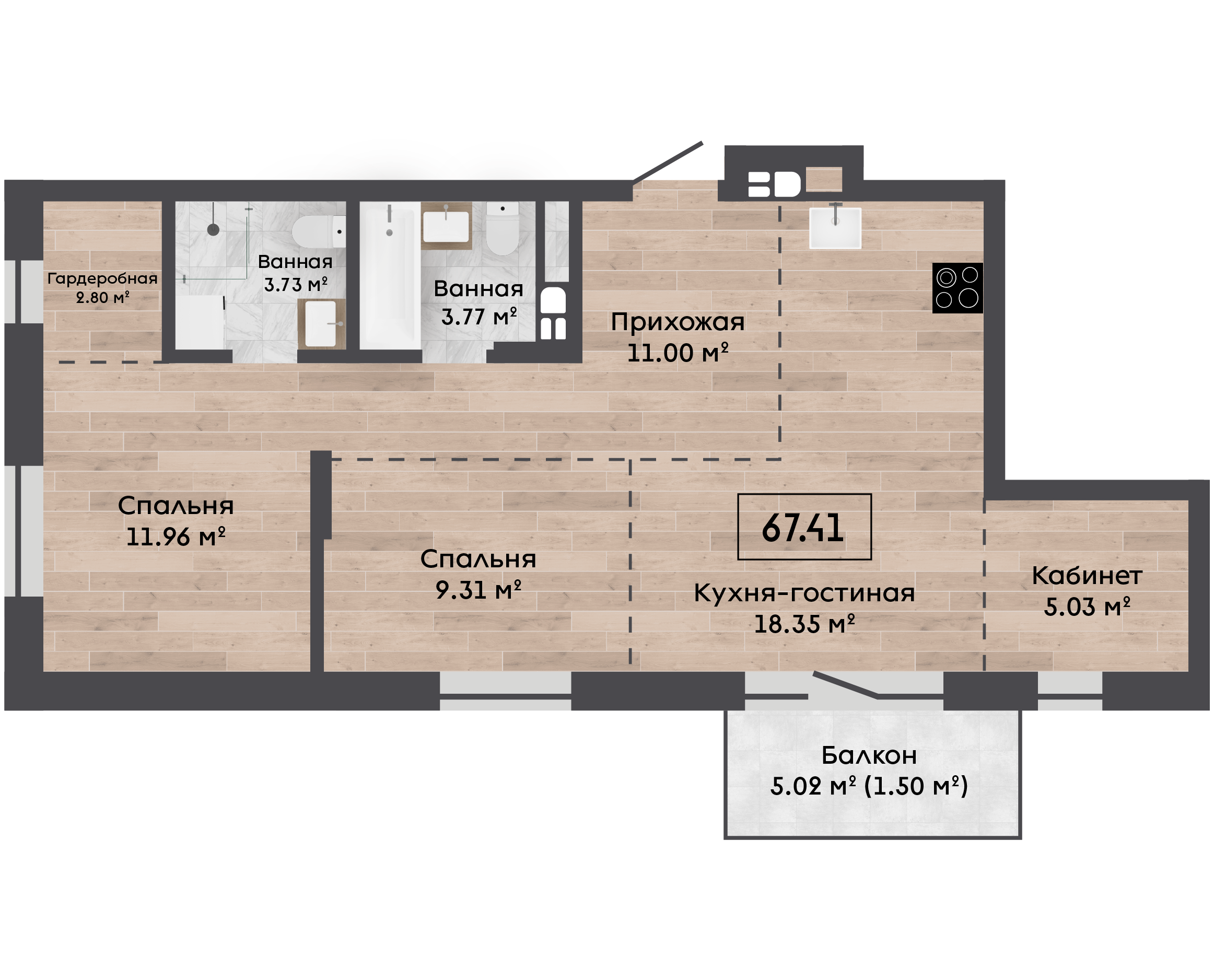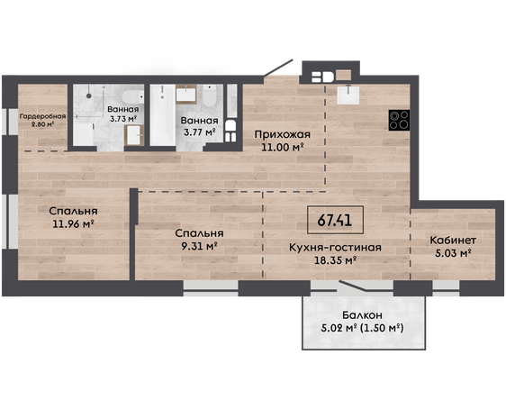 | 67,41 м² Площадь квартиры | 2,72 м Высота потолков | 500 мм Высота подоконной части |