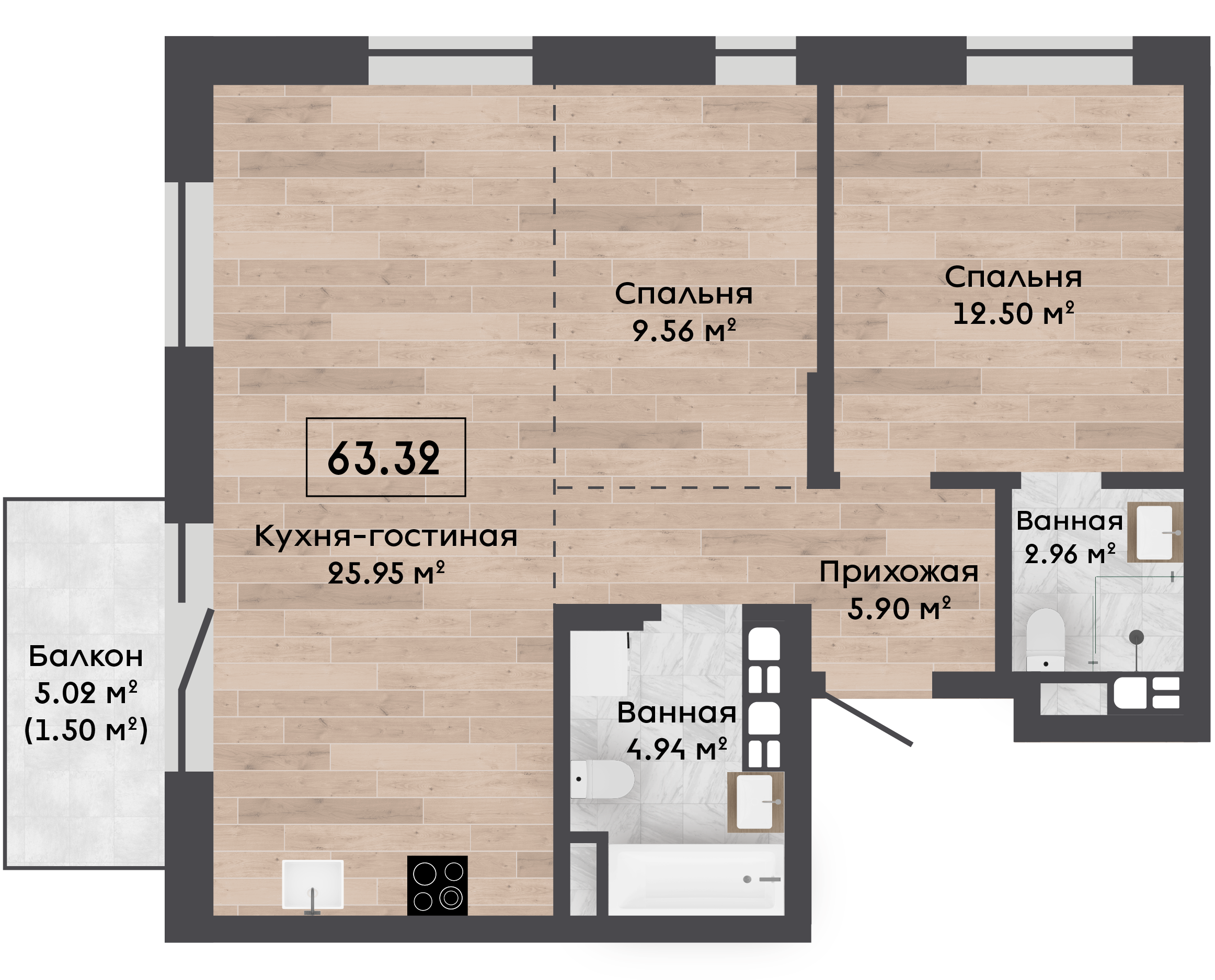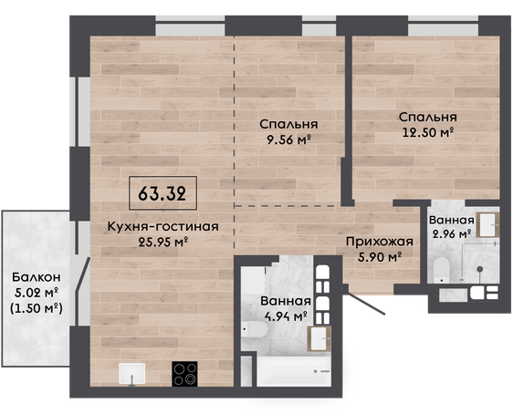 | 63,32 м² Площадь квартиры | 2,72 м Высота потолков | 500 мм Высота подоконной части |