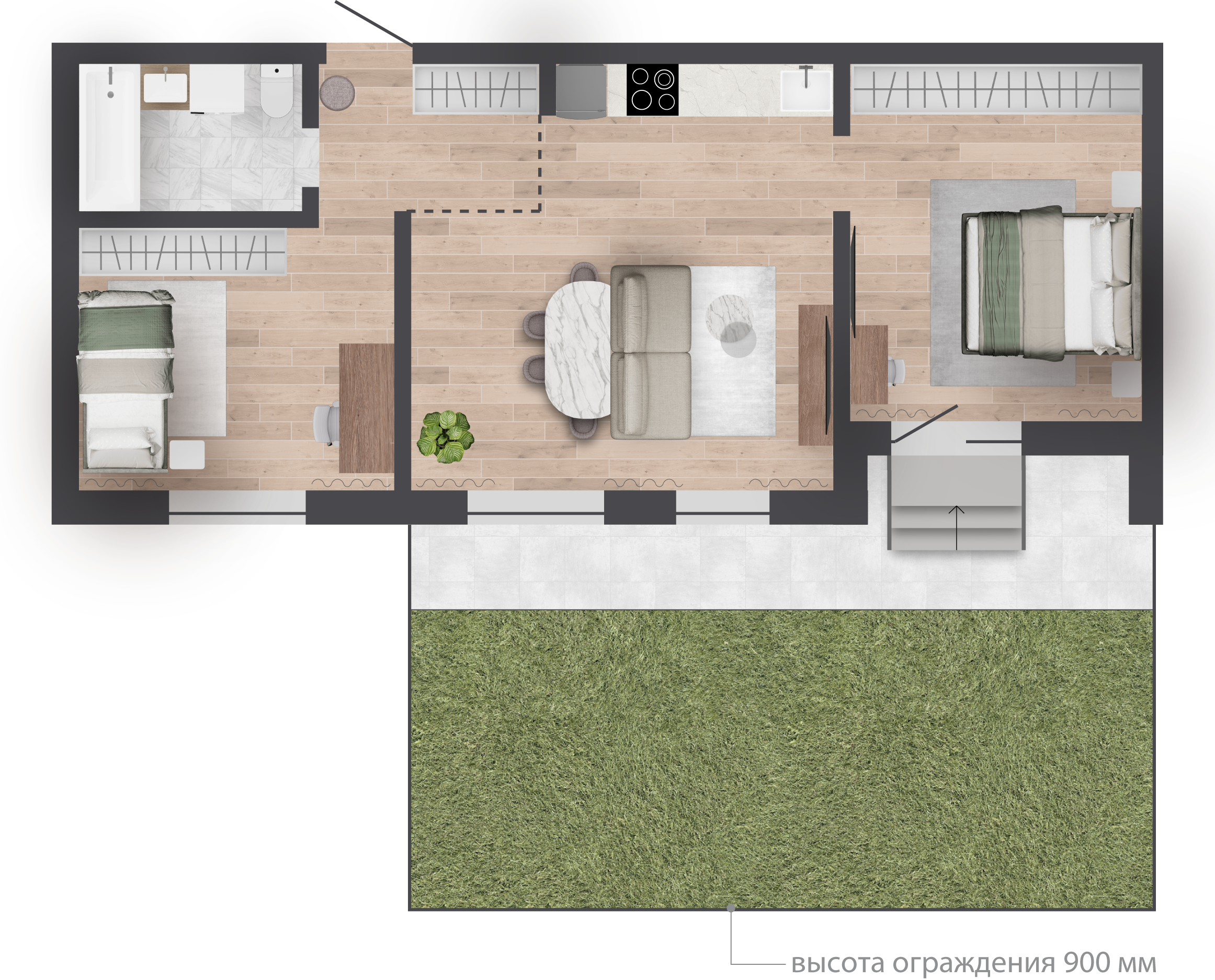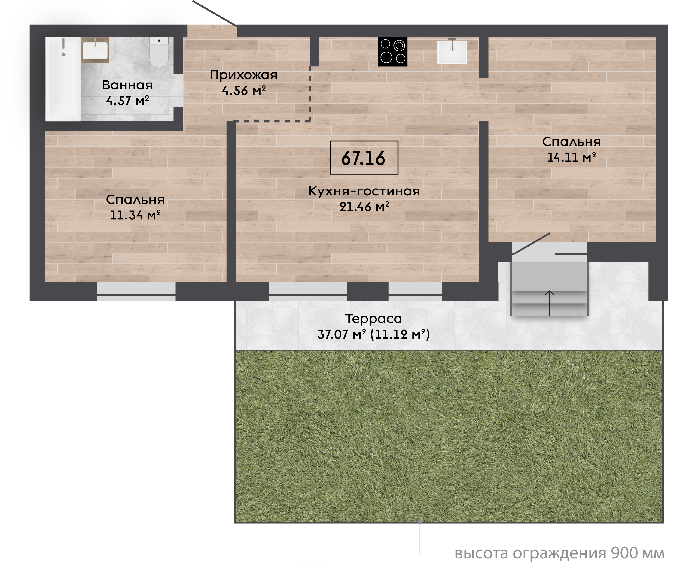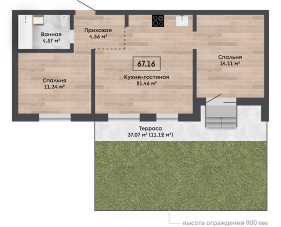 | 67,16 м² Площадь квартиры | 2,87 м Высота потолков | 37,07 м² Площадь террасы |