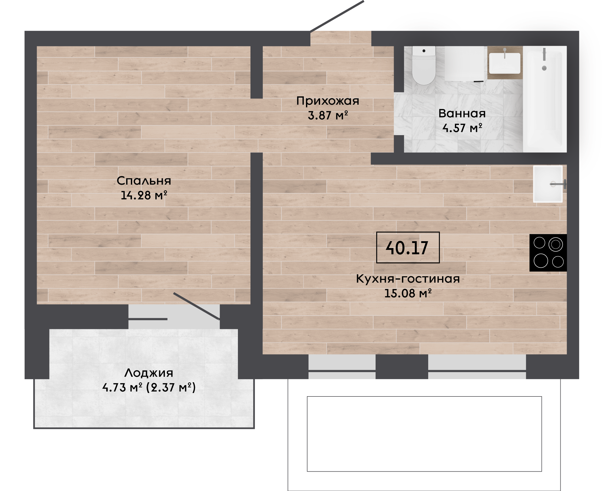 40,17 м² Площадь квартиры | 2,9 м Высота потолков | 500 мм Высота подоконной части |