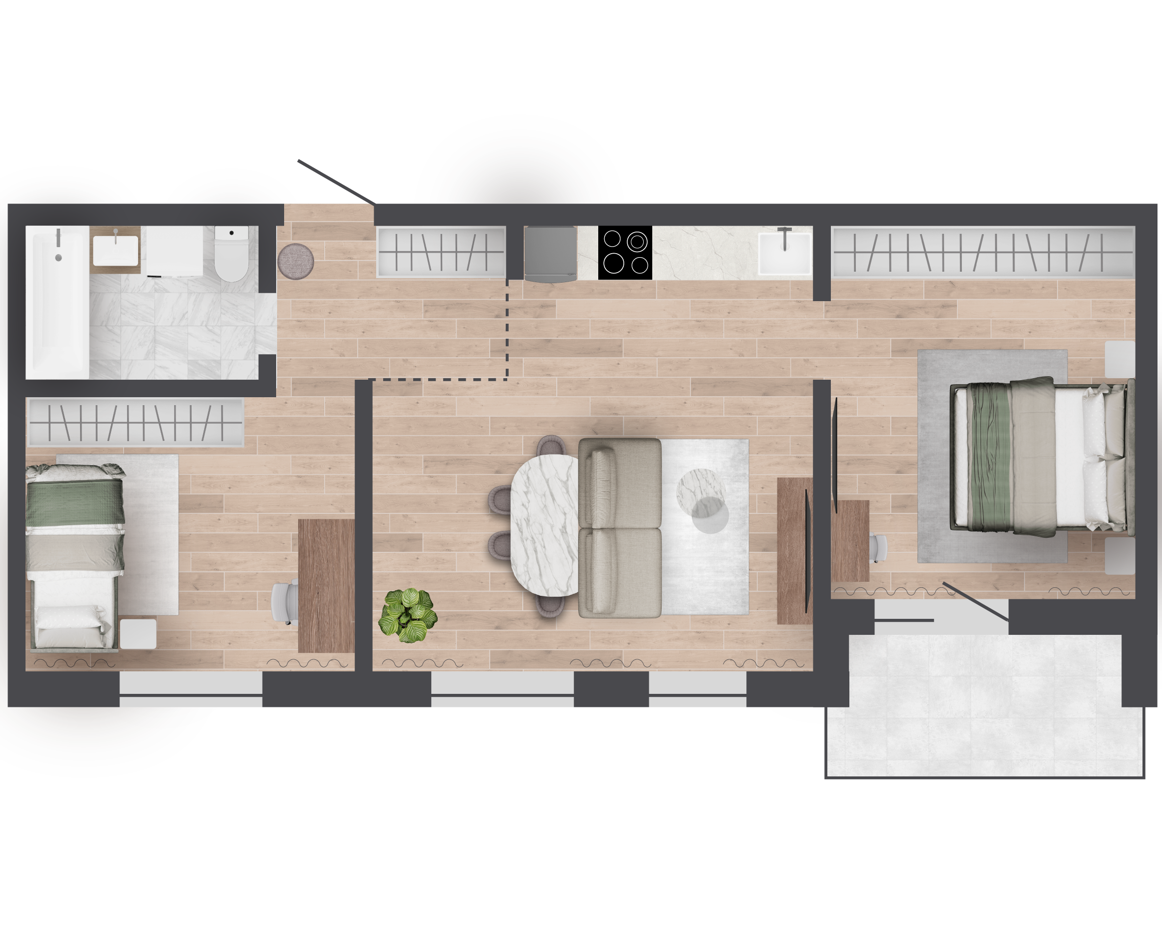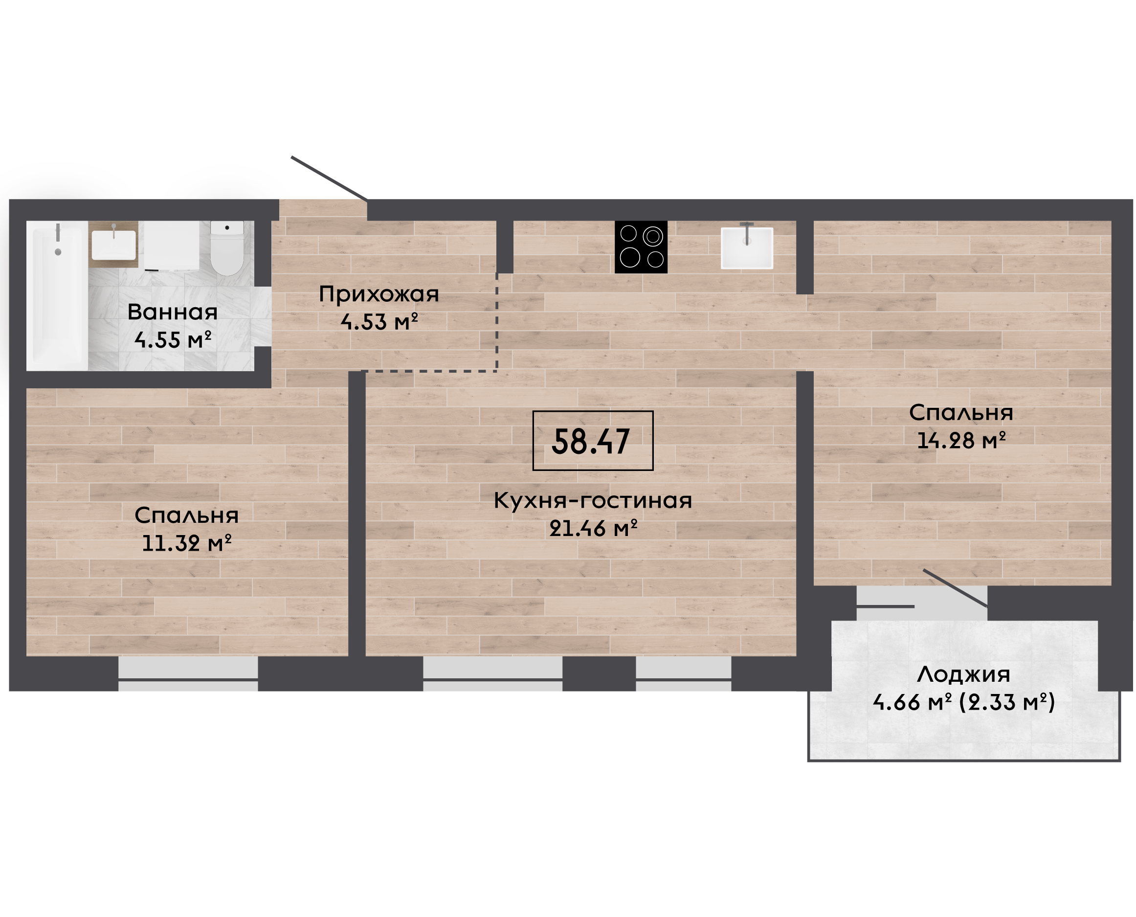 58,47 м² Площадь квартиры | 2,9 м Высота потолков | 500 мм Высота подоконной части |
