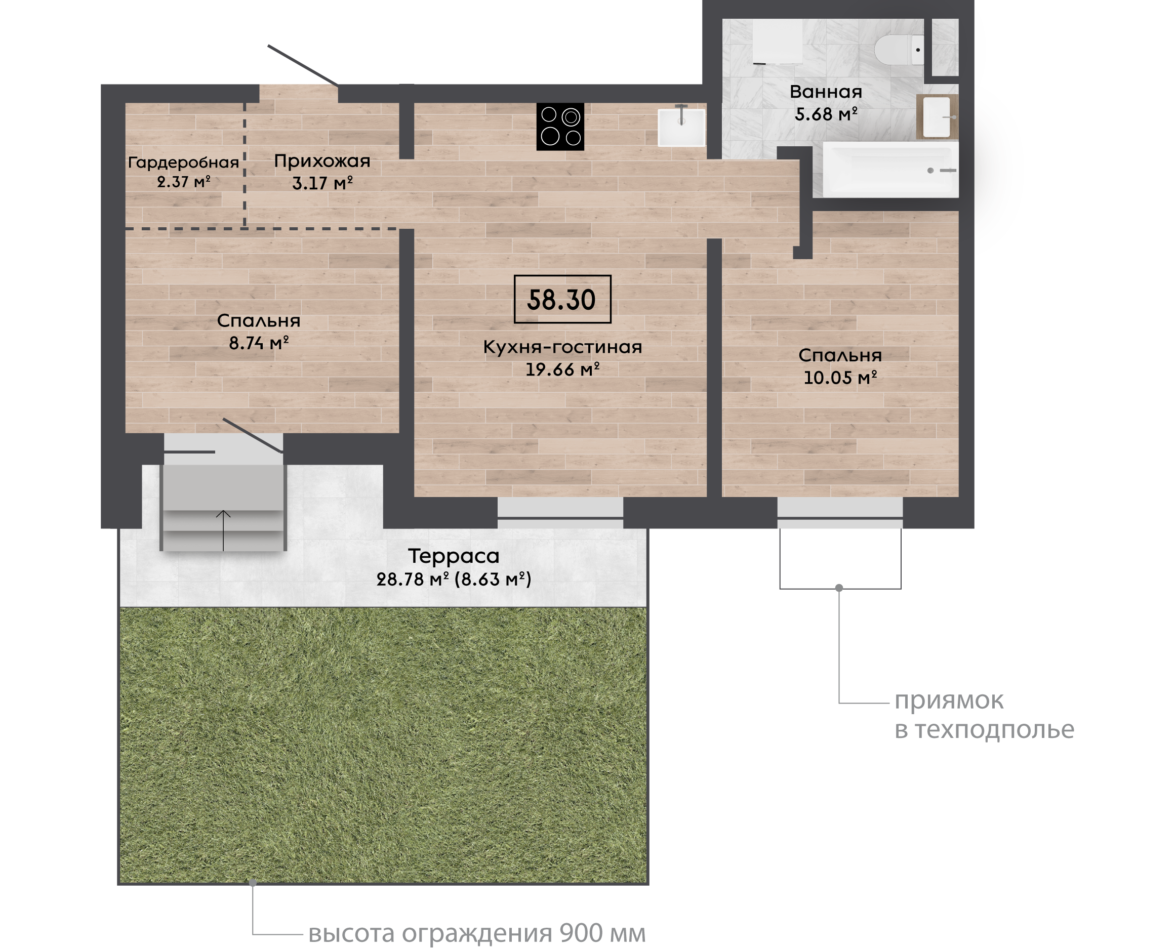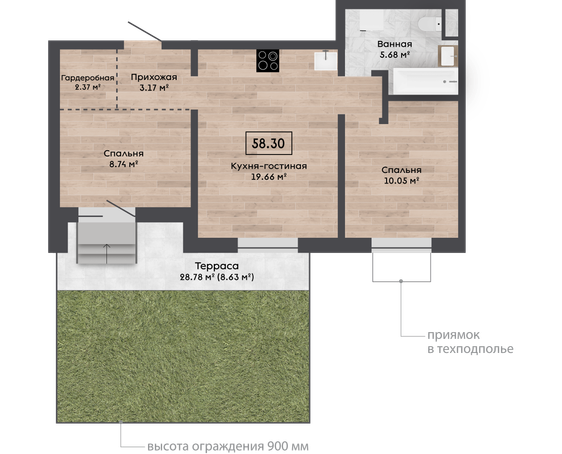 58,30 м² Площадь квартиры | 2,87 м Высота потолков | 28,78 Площадь участка |