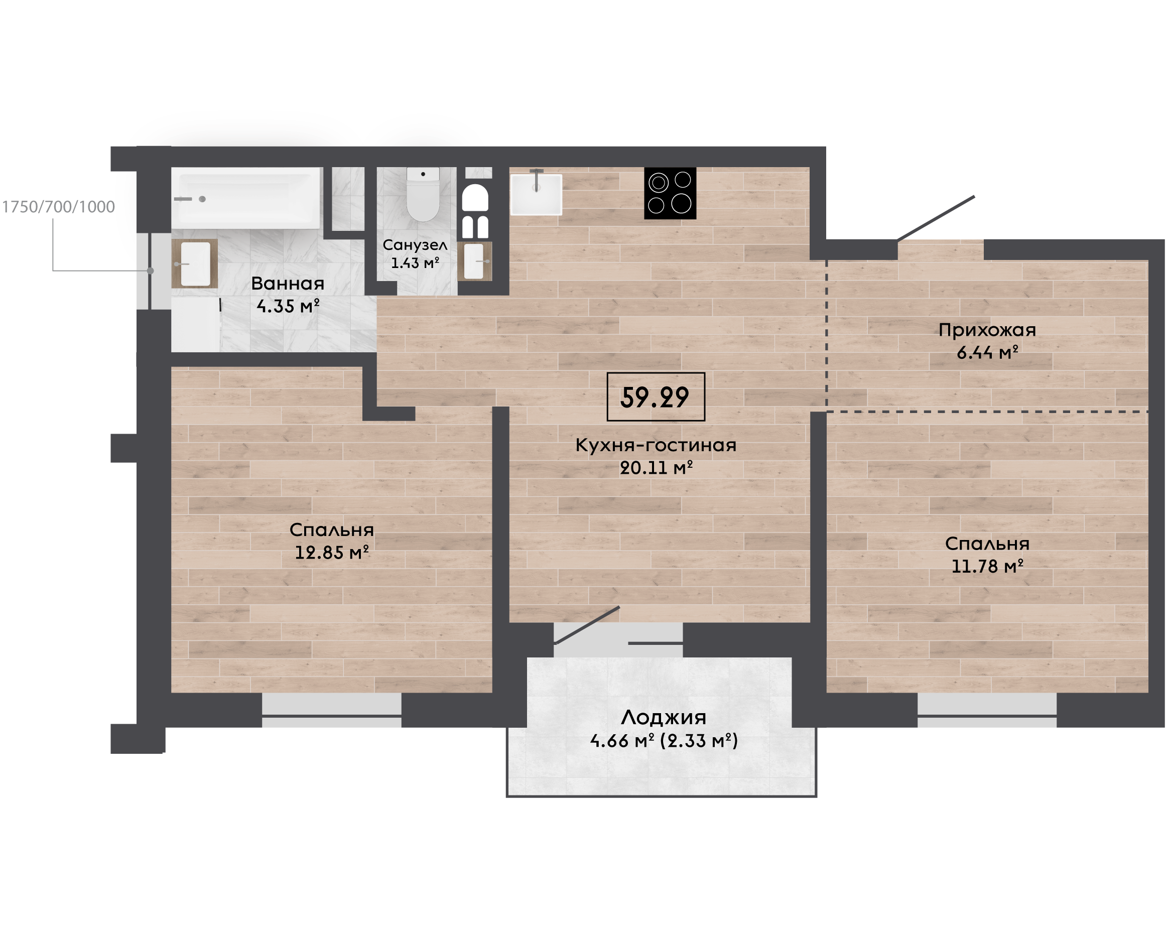 59,29 м² Площадь квартиры | 2,9 м Высота потолков | 500 мм Высота подоконной части |