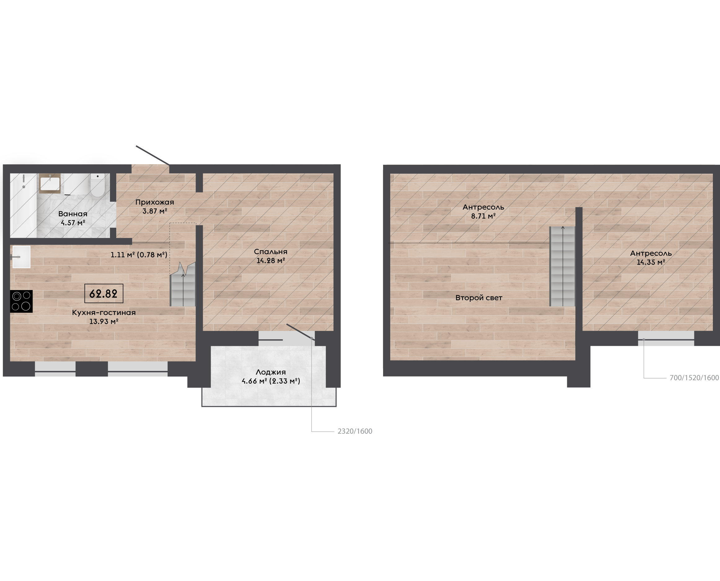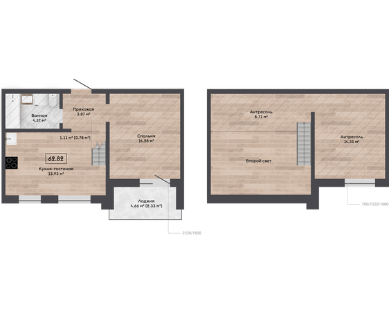 62,82 м² Площадь квартиры | до 8,3 м Высота потолков | 500 мм Высота подоконной части |