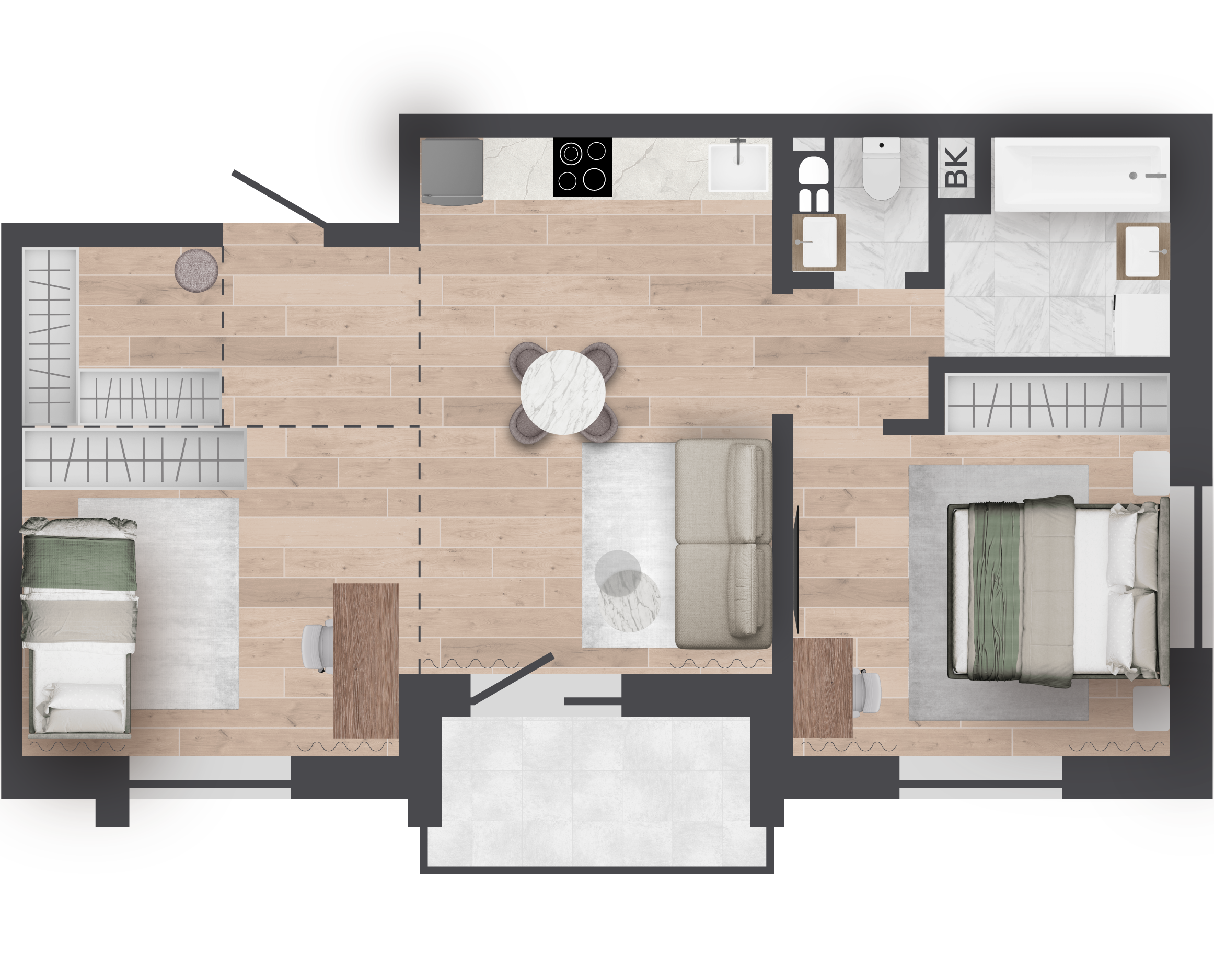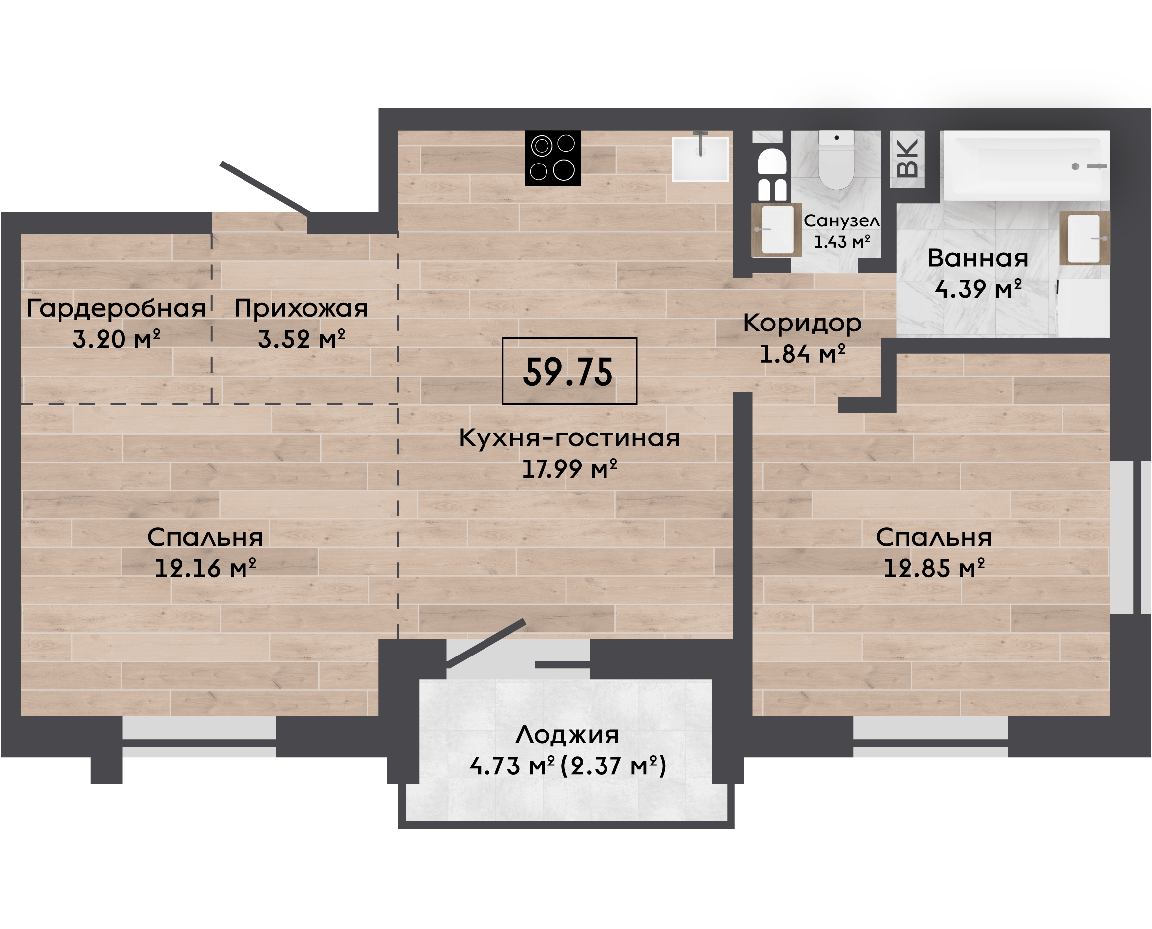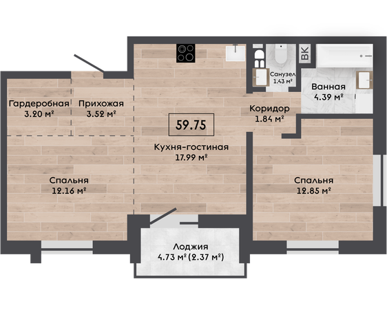 | 59,75 м² Площадь квартиры | 2,9 м Высота потолков | 4,73 м² Площадь лоджии |