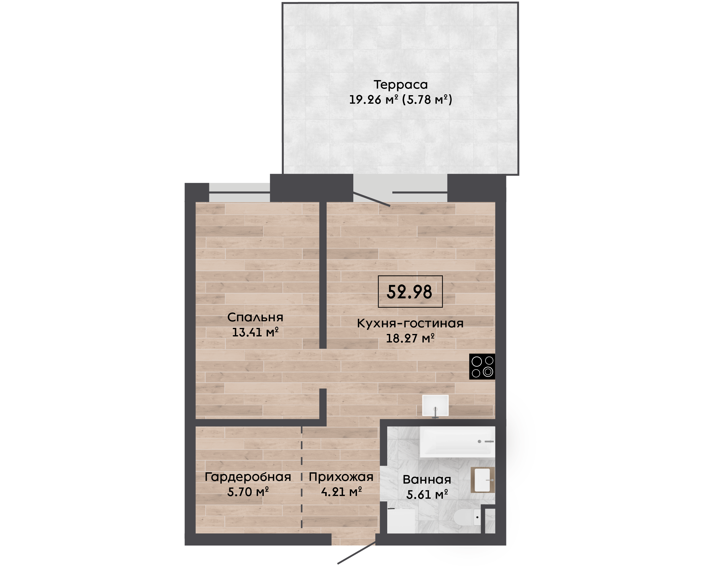| 52,98 м² Площадь квартиры | 3 м Высота потолков | 19 м² Площадь участка |