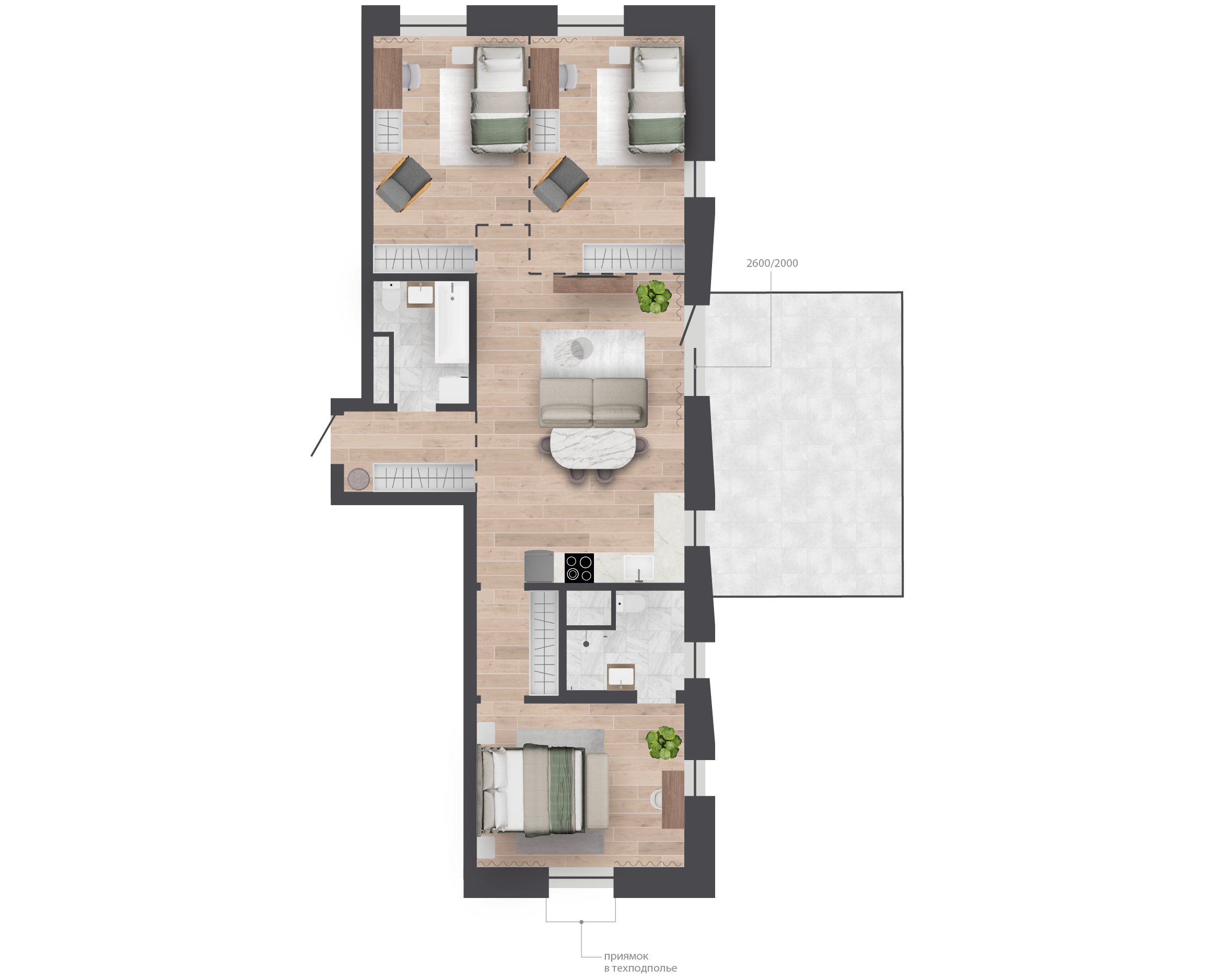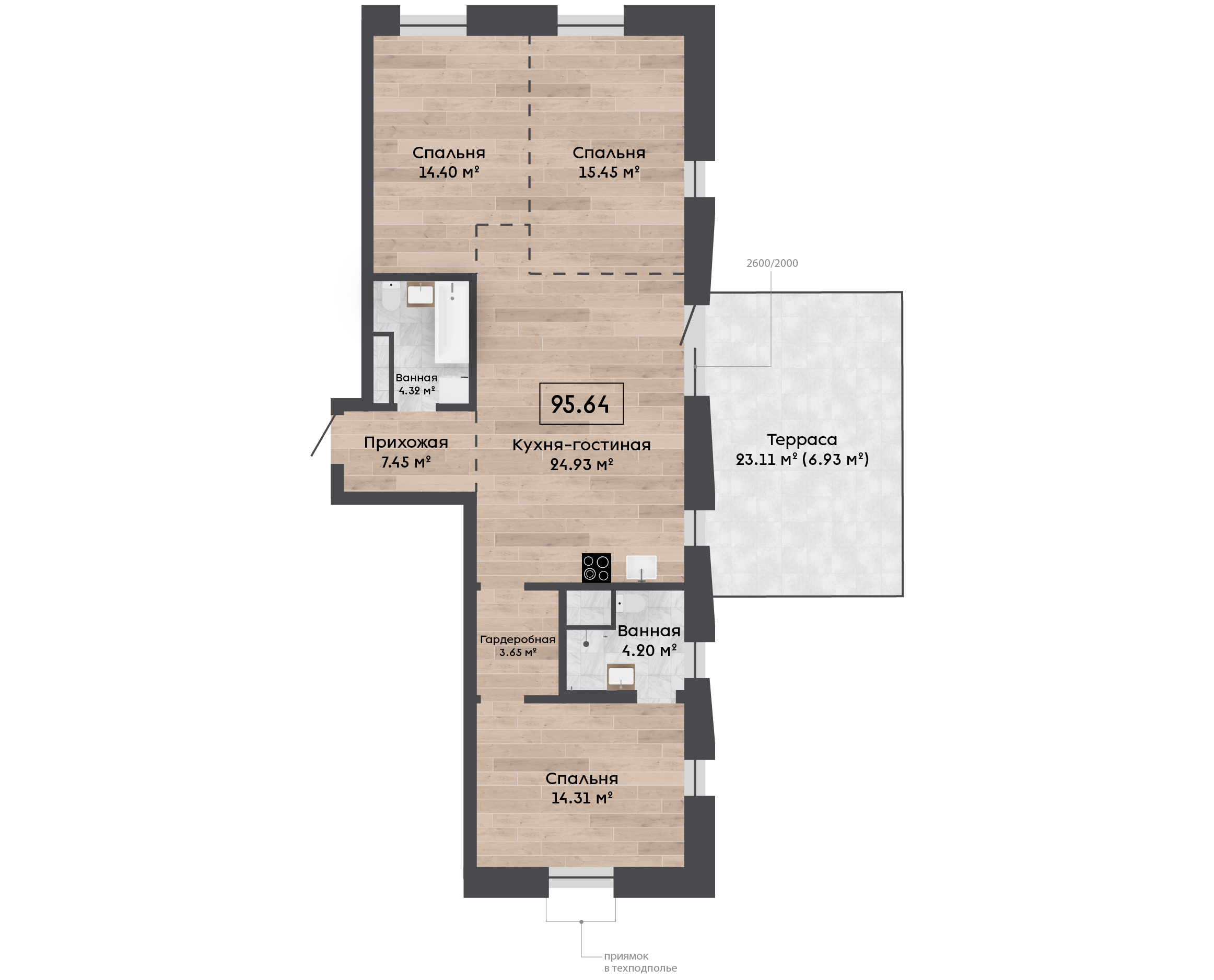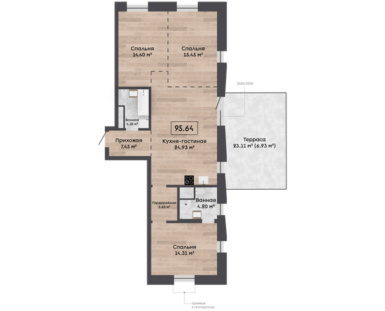 | 95,64 м² Площадь квартиры | 3 м Высота потолков | 23 м² Площадь участка |