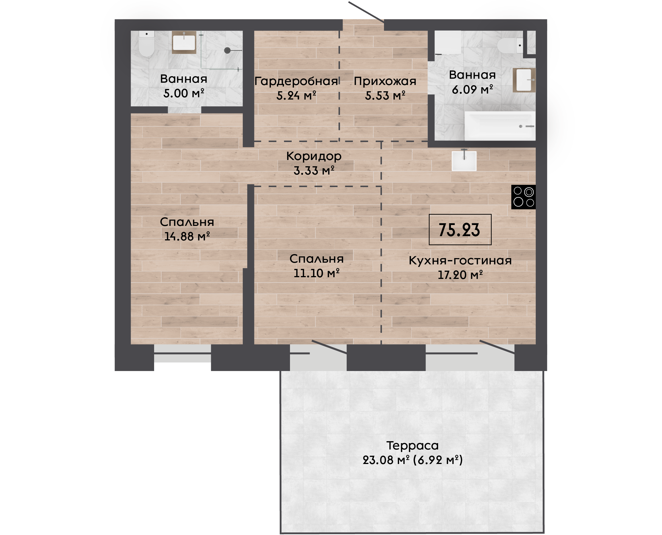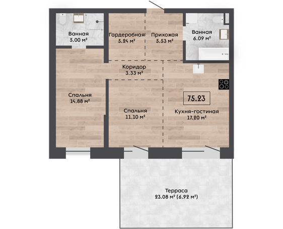 | 75,23 м² Площадь квартиры | 3 м Высота потолков | 23 м² Площадь участка |