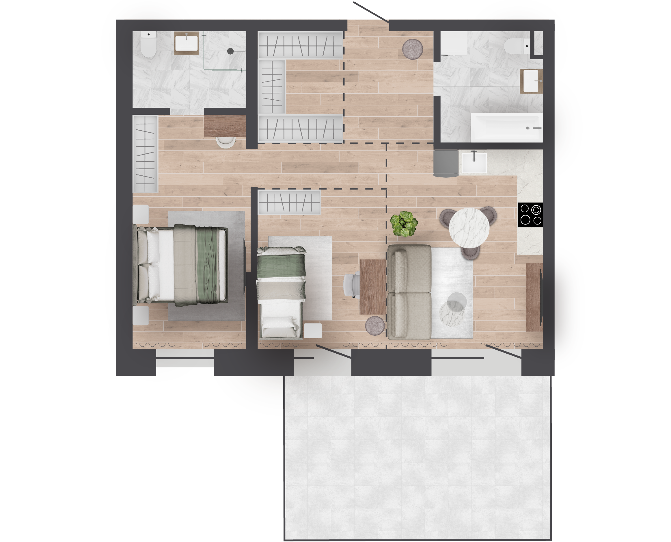 Участки от 16 до 38 квадратных метров дают возможность реализовать множество идей, от создания цветников до установки зон для отдыха с беседками или шезлонгами. Участки приподняты на 0,5 метра над уровнем территории двора и обнесены металлическим ограждением;