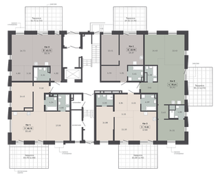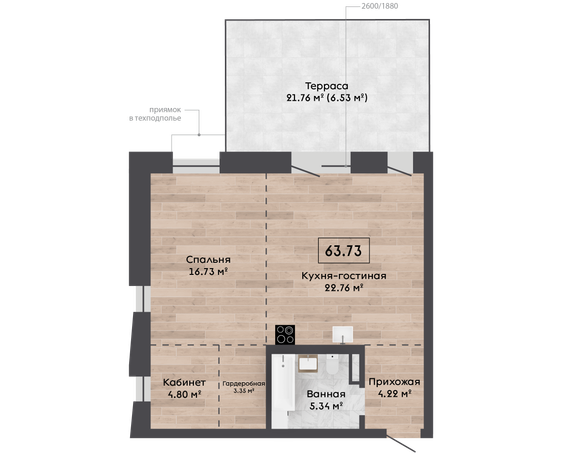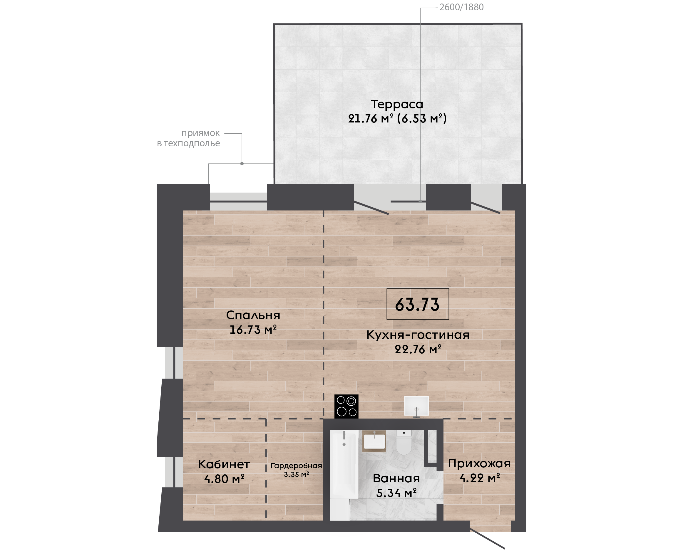 | 63,73 м² Площадь квартиры | 3 м Высота потолков | 21 м² Площадь участка |