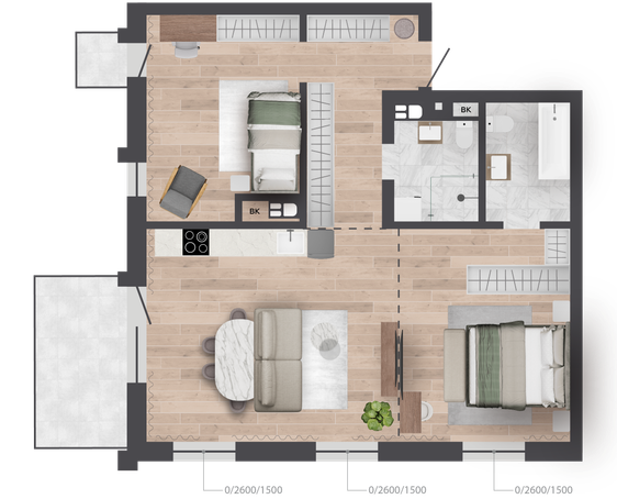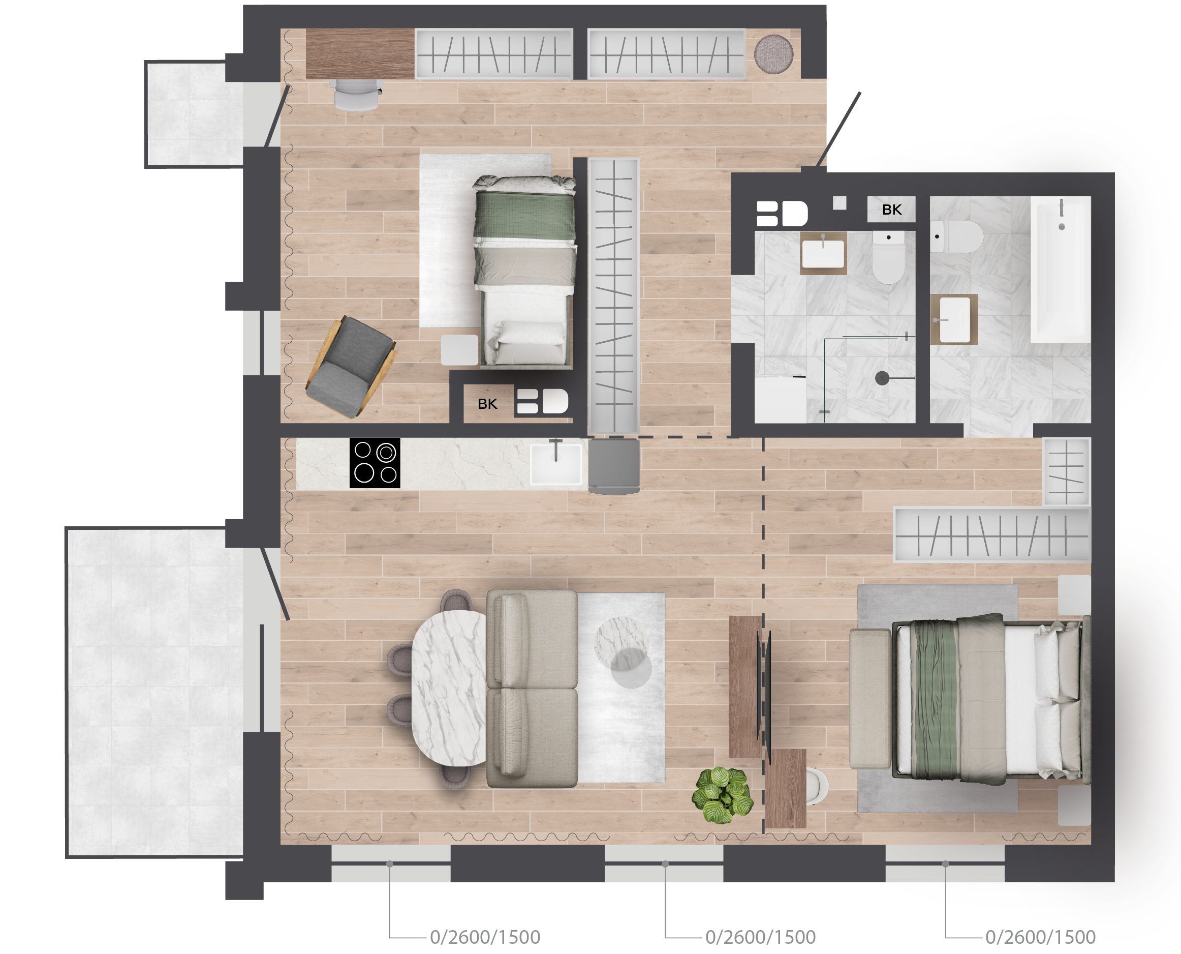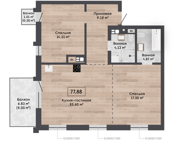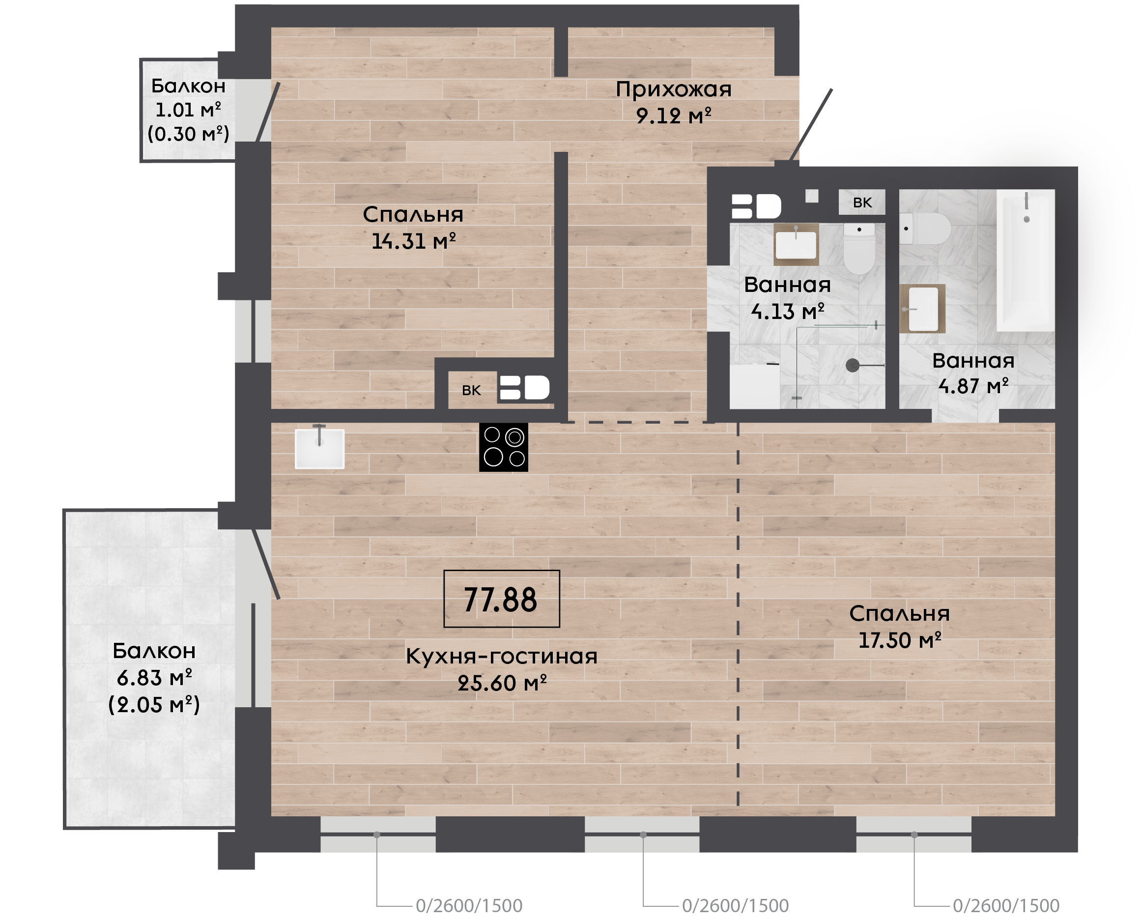 | 77,88 м² Площадь квартиры | 3 м Высота потолков | 6,83 м² Площадь балкона |